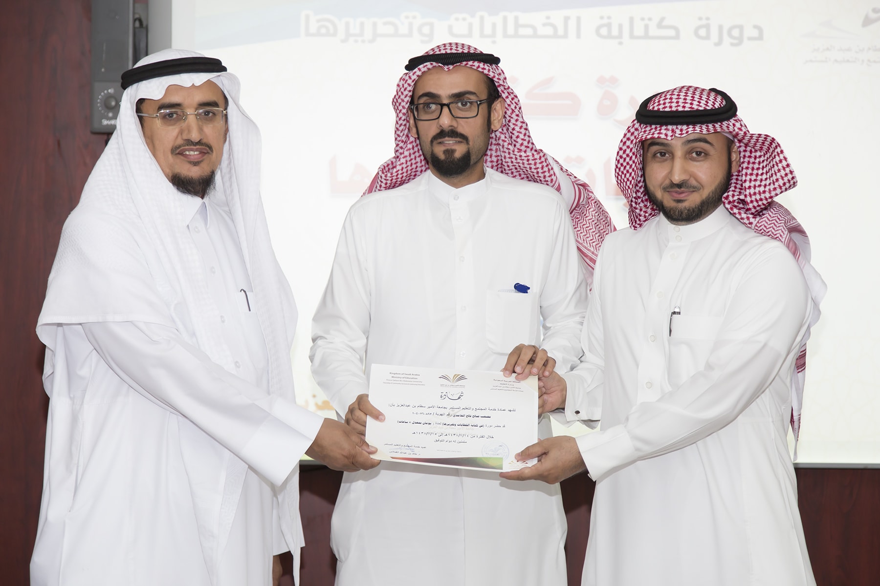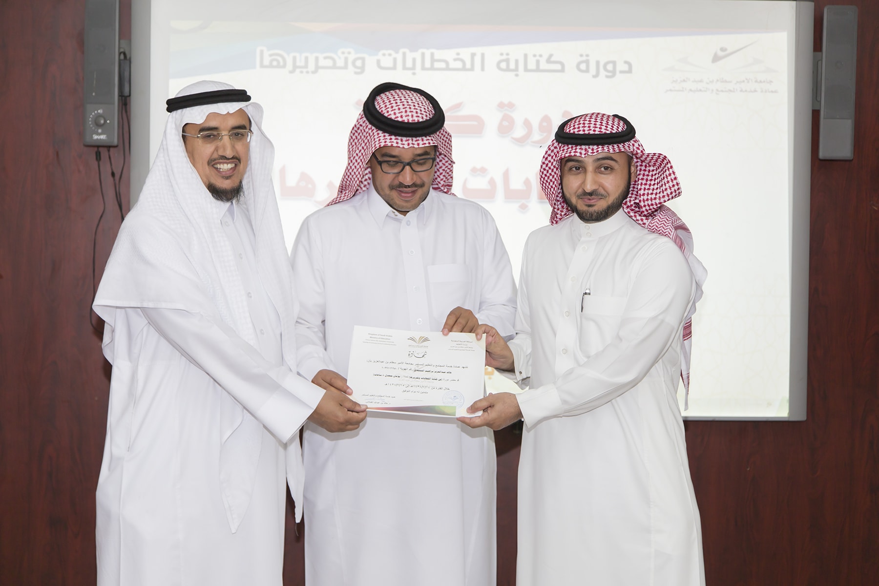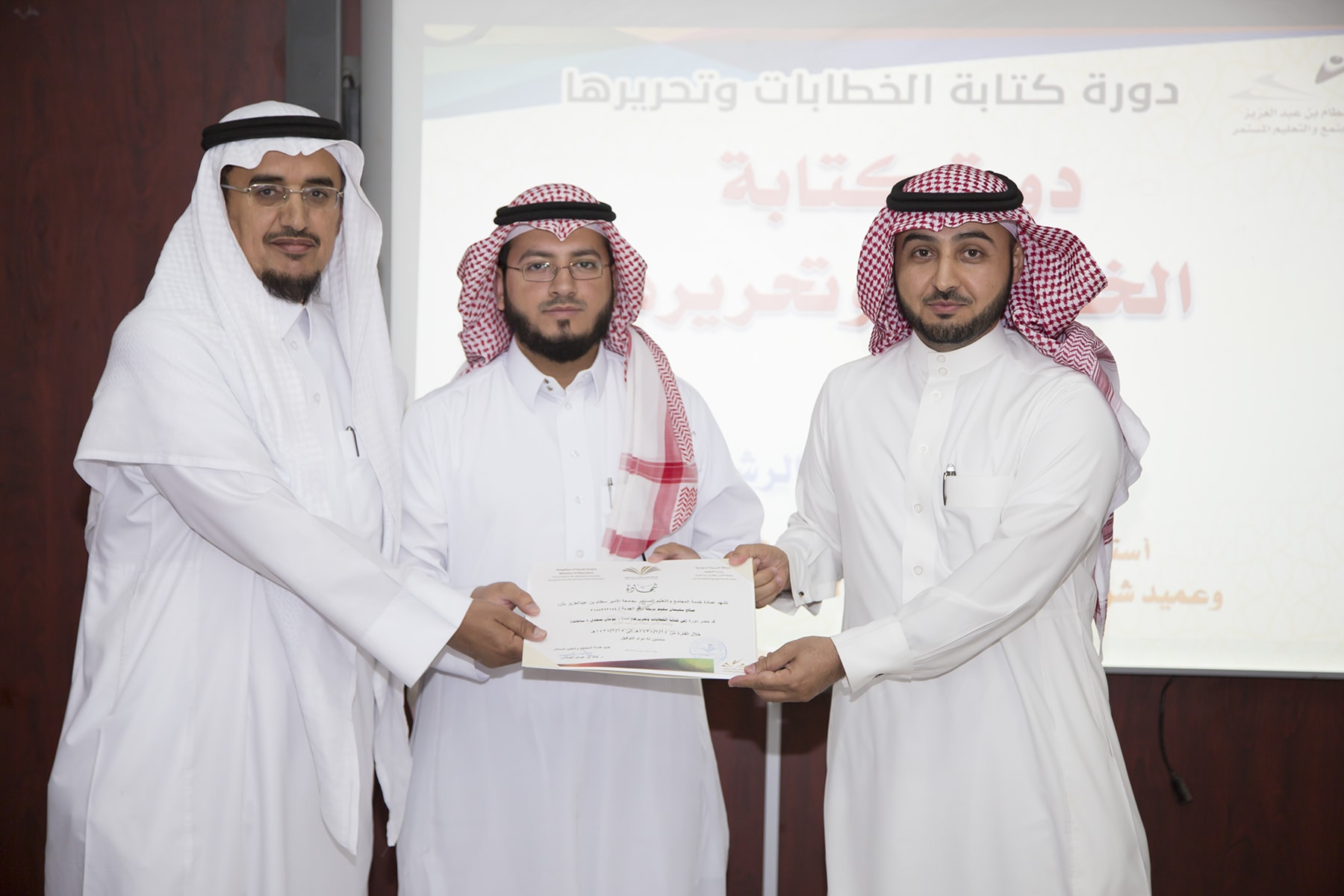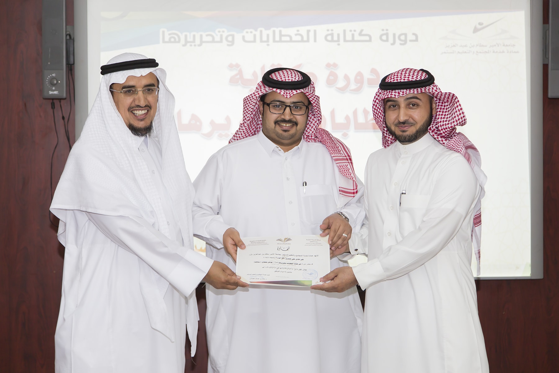 اختتم اليوم الأربعاء 15/7/1438هـ البرنامج التدريبي (فنّ كتابة الخطابات وتحريرها)، والذي امتدّ لمدة يومين بواقع (8) ساعات تدريبيّة، في قاعة التميّز بعمادة خدمة المجتمع والتعليم المستمر.
