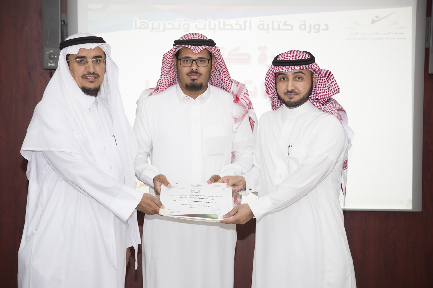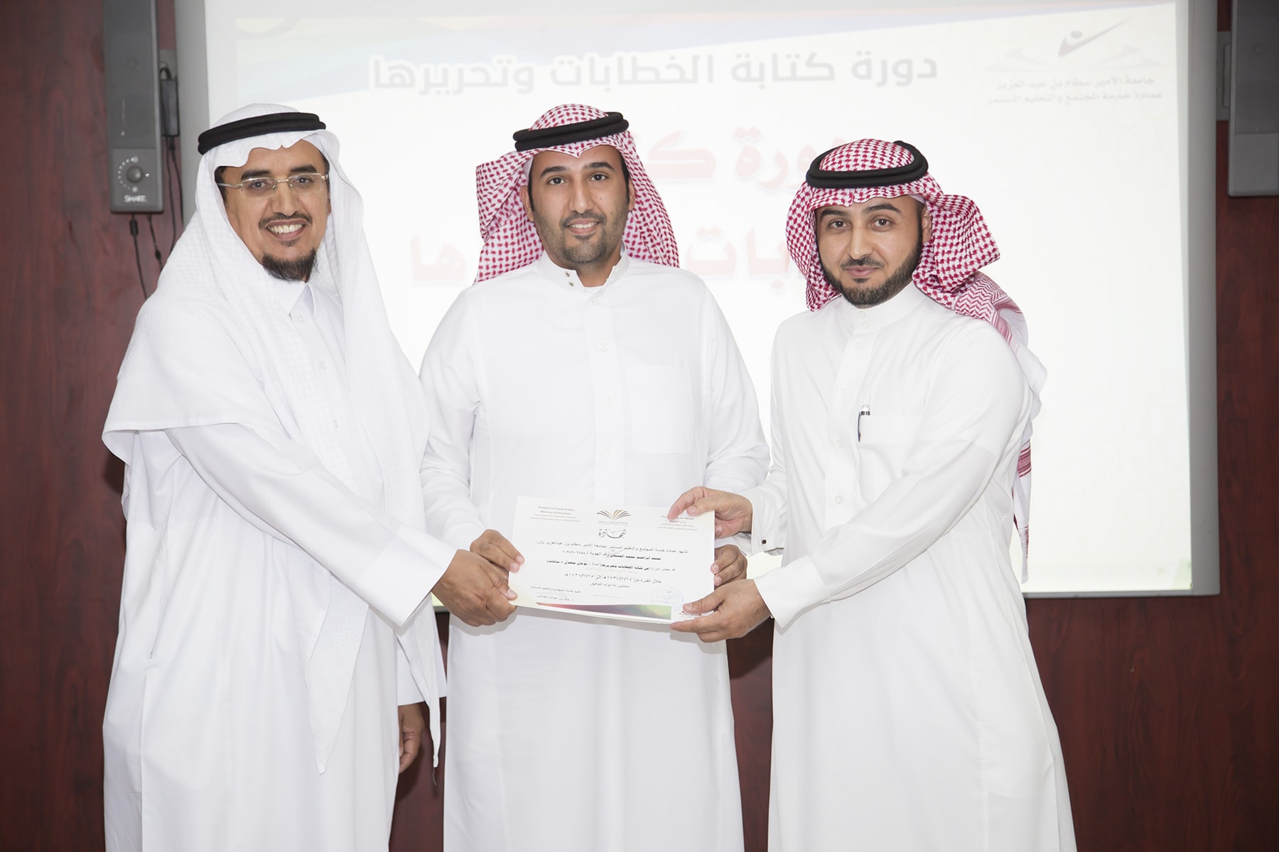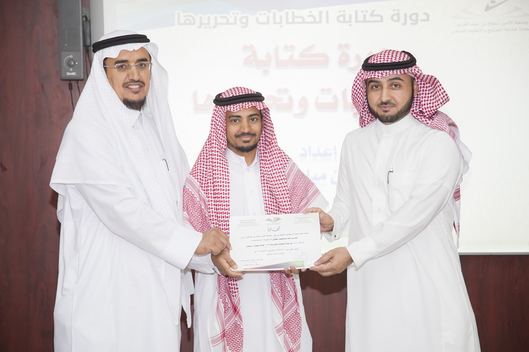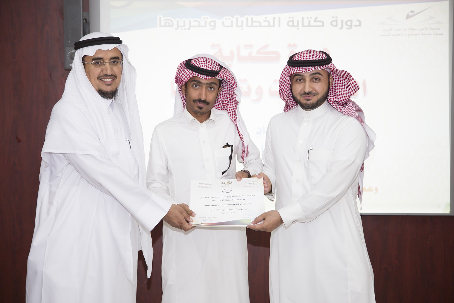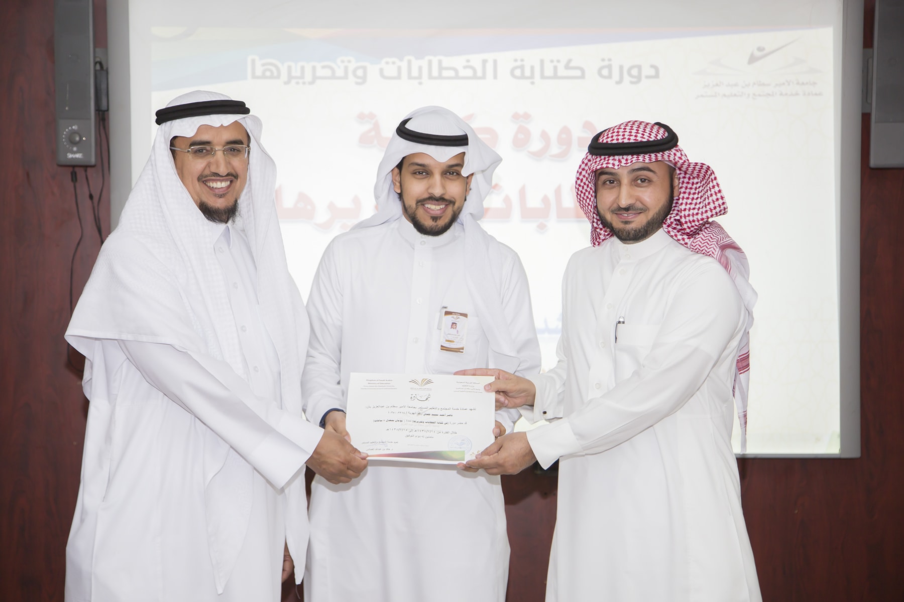 اختتم اليوم الأربعاء 15/7/1438هـ البرنامج التدريبي (فنّ كتابة الخطابات وتحريرها)، والذي امتدّ لمدة يومين بواقع (8) ساعات تدريبيّة، في قاعة التميّز بعمادة خدمة المجتمع والتعليم المستمر.