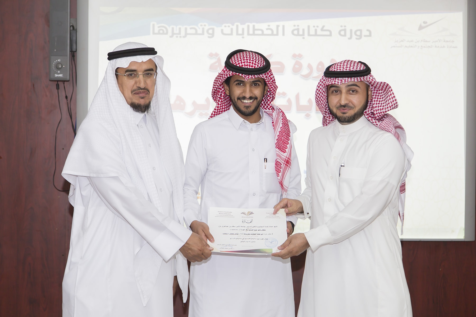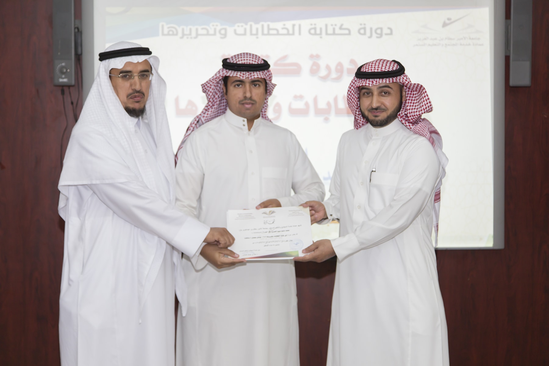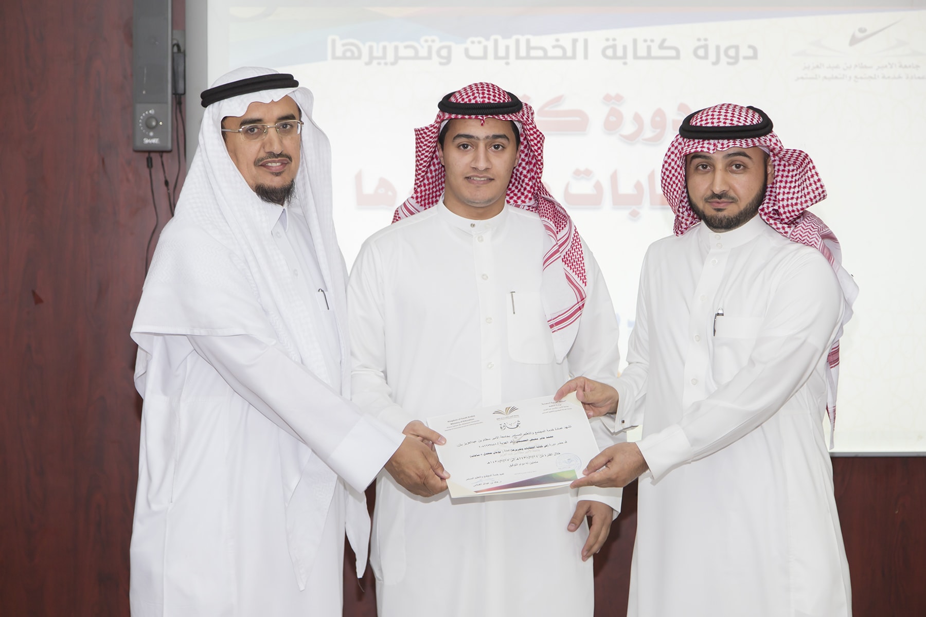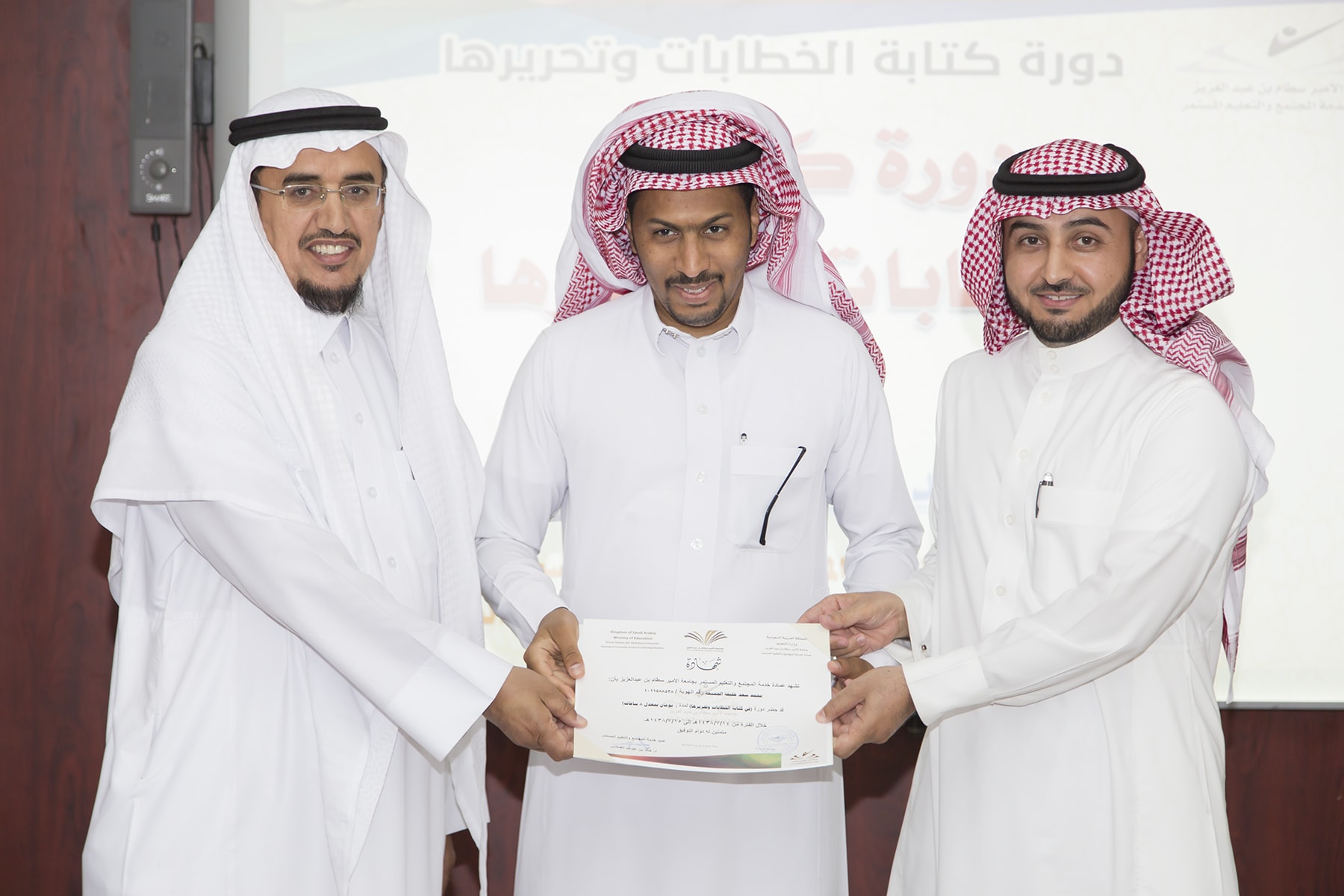 اختتم اليوم الأربعاء 15/7/1438هـ البرنامج التدريبي (فنّ كتابة الخطابات وتحريرها)، والذي امتدّ لمدة يومين بواقع (8) ساعات تدريبيّة، في قاعة التميّز بعمادة خدمة المجتمع والتعليم المستمر.