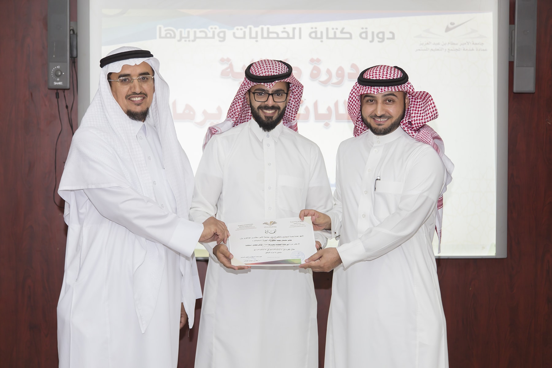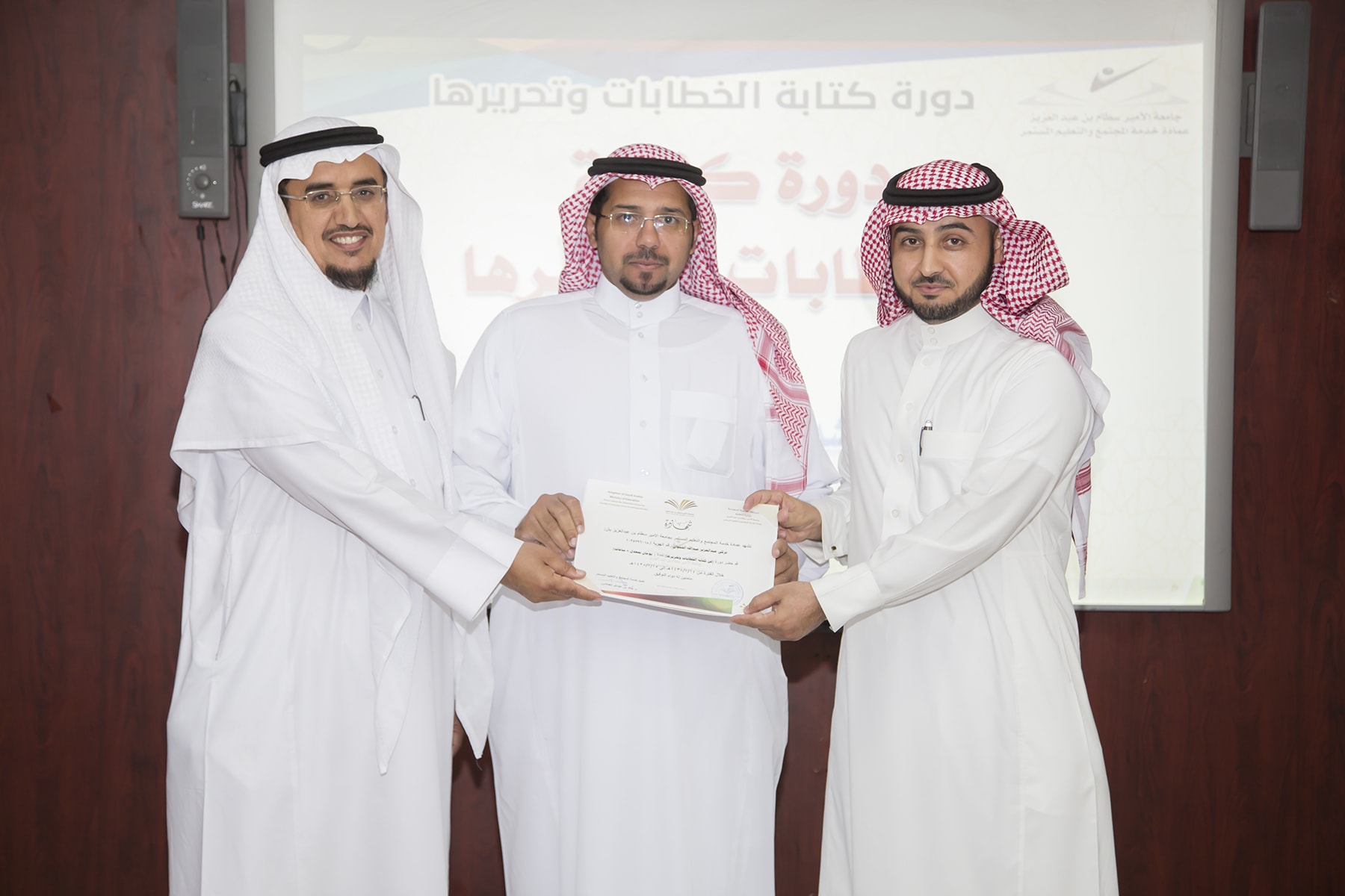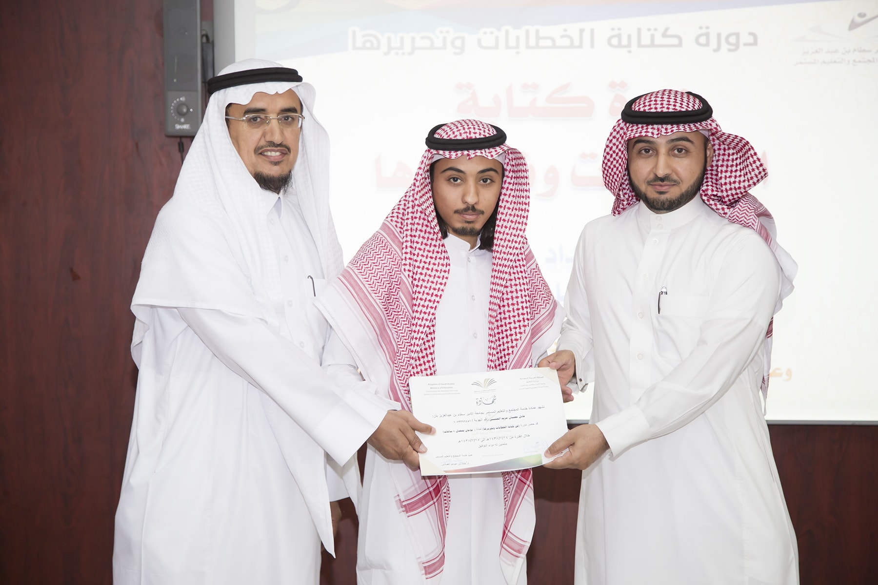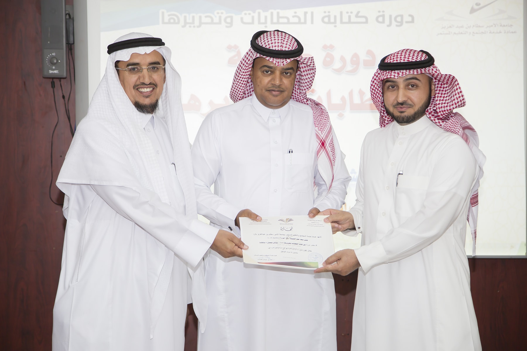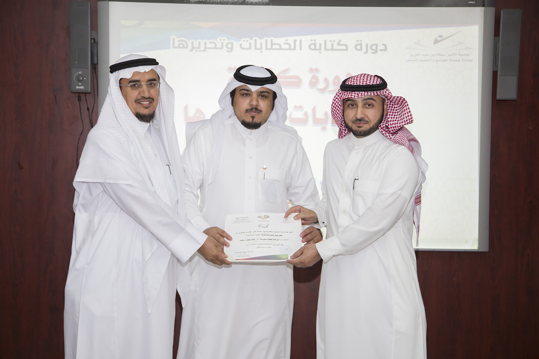 اختتم اليوم الأربعاء 15/7/1438هـ البرنامج التدريبي (فنّ كتابة الخطابات وتحريرها)، والذي امتدّ لمدة يومين بواقع (8) ساعات تدريبيّة، في قاعة التميّز بعمادة خدمة المجتمع والتعليم المستمر.