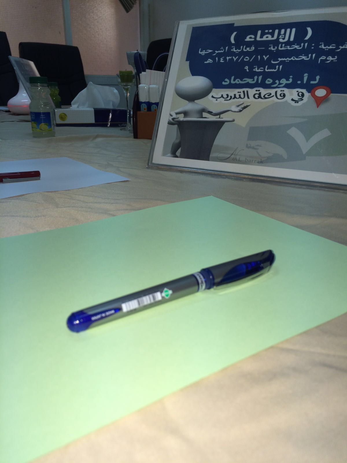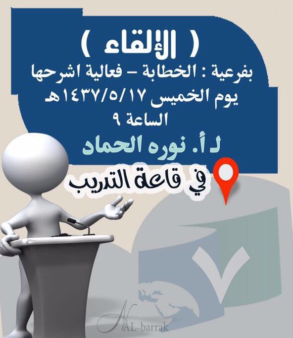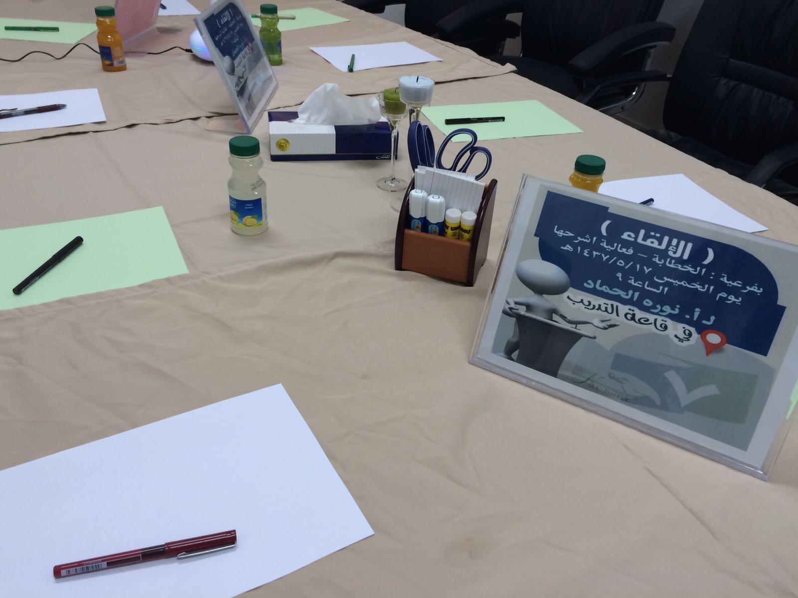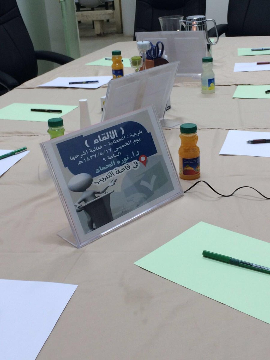 و في يوم الخميس الموافق 1437/5/16هـ ختام الدورات التدريبية ، بدورة بعنوان ( الإلقاء بفرعية الخطابة – وفعالية أشرحها ) إعداد وتقديم أ. نورة الحماد عضو هيئة التدريس بقسم اللغة العربية ومساعدة المشرف العام على إدارة العلاقات العامة والإعلام بالقسم النسوي ، بقاعة الاجتماعات الساعة التاسعة صباحاً ، وقد تضمنت الدورة عدة أهداف منها : - التعريف بفن الإلقاء – نبذة تاريخية عن فن لإلقاء – معرفة الصفات الواجب توفرها في الملقي – الخطابة وصفات الخطيب والفرق بين الخطيب والشاعر – معرفة أساليب الإلقاء (الإلقاء الخطبة – الإلقاء الشعر – الإلقاء الروائي – الإلقاء التمثيلي ) .