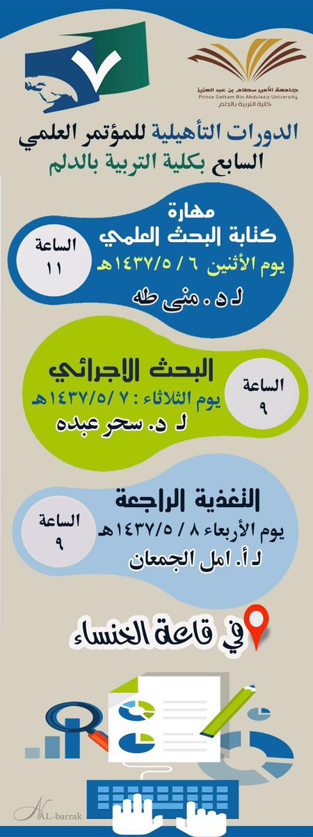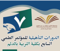 نظمت اللجنة المنسقة للمؤتمر العلمي السابع تحت إشراف منسقة المؤتمر بالكلية أ. مها الطعيس عدد من الدورات التأهيلية ضمن مرحلة التدريب والتأهيل للمشاركات بالمؤتمر العلمي السابع منها :