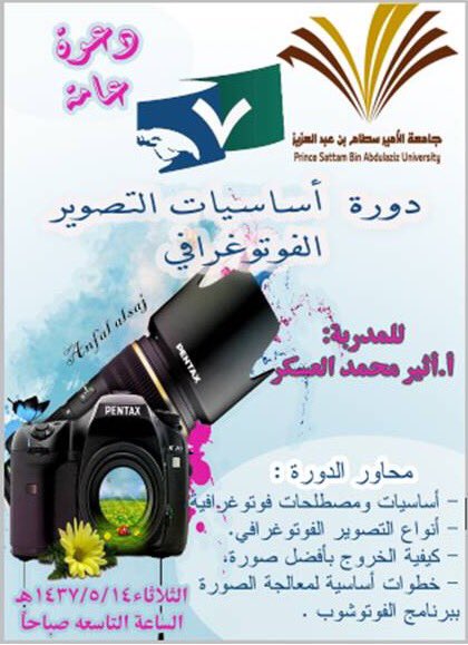 وقد تم في يوم الثلاثاء الموافق 1437/5/14هـ عقدت دورة تدريبية عن ( أساسيات التصوير الفوتوغرافي ) من أعداد وتقديم أ. أثير العسكر بقاعة الخنساء الساعة التاسعة صباحاً ، حيث تضمنت الدورة : معرفة أساسيات التصوير الفوتوغرافي – أنواع التصوير الفوتوغرافي – كيفية الخروج بأفضل صورة ) وتم التركيز على القياسات المطلوبة في مسابقة التصوير الفوتوغرافي بالمؤتمر العلمي السابع.