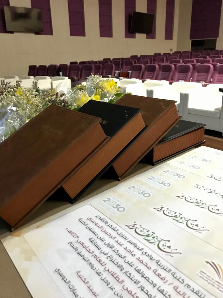 حول ما تسعى إليه جامعة الأمير سطام بن عبدالعزيز من دعم واكتشاف المبدعين والموهوبين واكسابهم قدرة تنافسية عالية في جميع المجالات وإبراز مواهبهم وصقلها من خلال التحفيز المعنوي والمادي وترسيخ القيم البحثية والإبداعية في الجوانب العلمية والإنسانية للطلاب والطالبات ، أقامت كلية التربية بوادي الدواسر حفلها الختامي لفعاليات الملتقى العلمي والعروض العلنية للمشاركات لعام 1443هـ يوم الأربعاء الموافق 6/8/1443هـ بمسرح الكلية وذلك برعاية عميد الكلية الدكتور ياسر مبارك الدوسري ووكيلة الكلية للشؤون التعليمية والأكاديمية الدكتورة منال عبد العليم وبإشراف منسقة الملتقى العلمي الأستاذة نورة آل مسن . حيث حضر الحفل كلاً من لجنة التحكيم ورئيسات الأقسام وعدد من أعضاء هيئة التدريس والكادر الإداري والمشاركات في الملتقى .