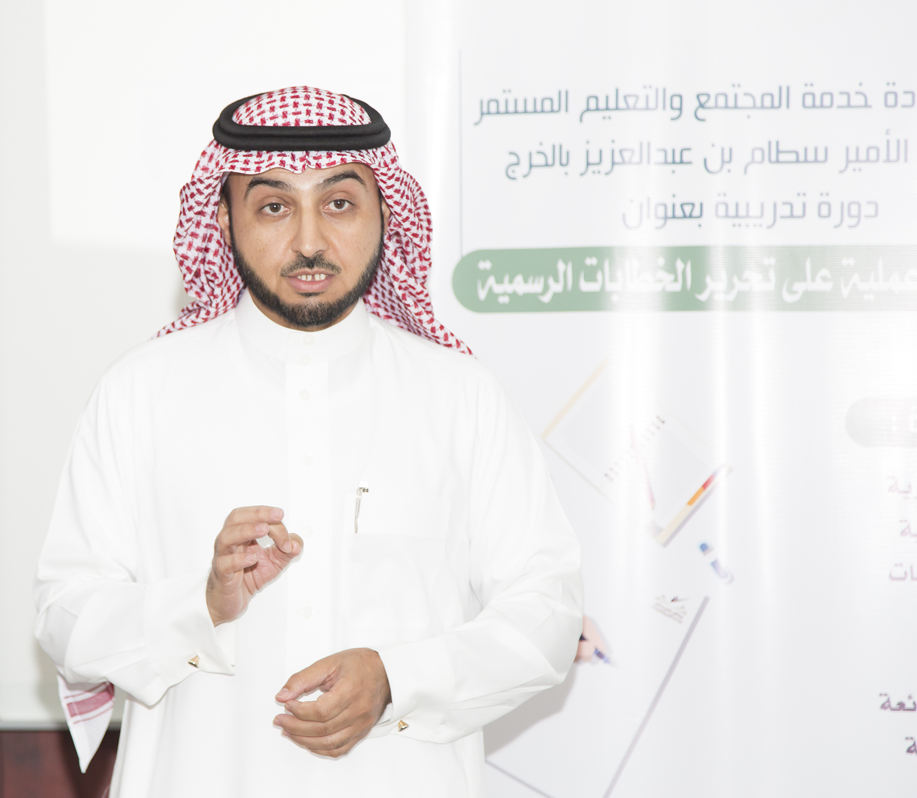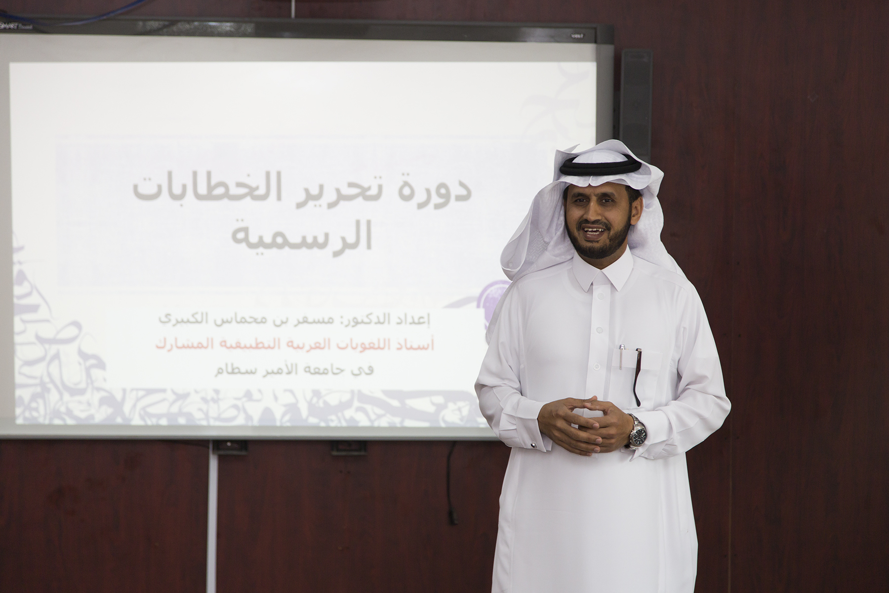 ويأتي ضمن البرامج التدريبية المخصصة التي تقدمها العمادة لفئات مخصصة من موظفي الجهات الحكومية على مستوى محافظة الخرج ، وبلغ عدد المتدربين لهذا البرنامج أكثر من ٢٠ متدرب ، وقدم الدورة الدكتور مسفر الكبيري ( أستاذ اللغويات العربية التطبيقية المشارك بجامعة الأمير سطام بن عبدالعزيز ) .
