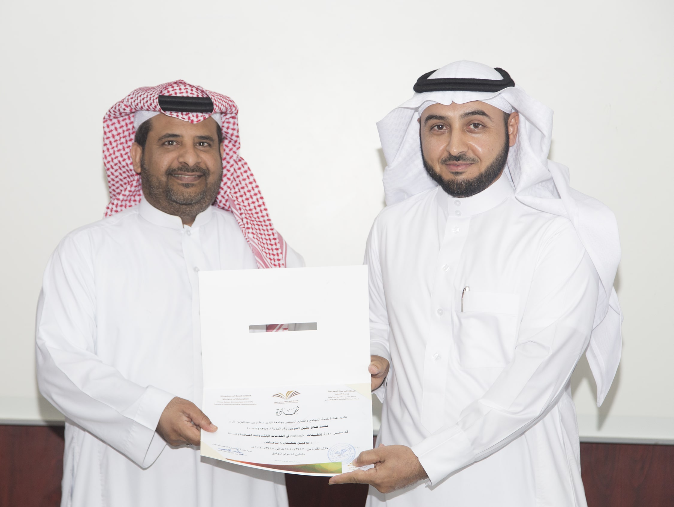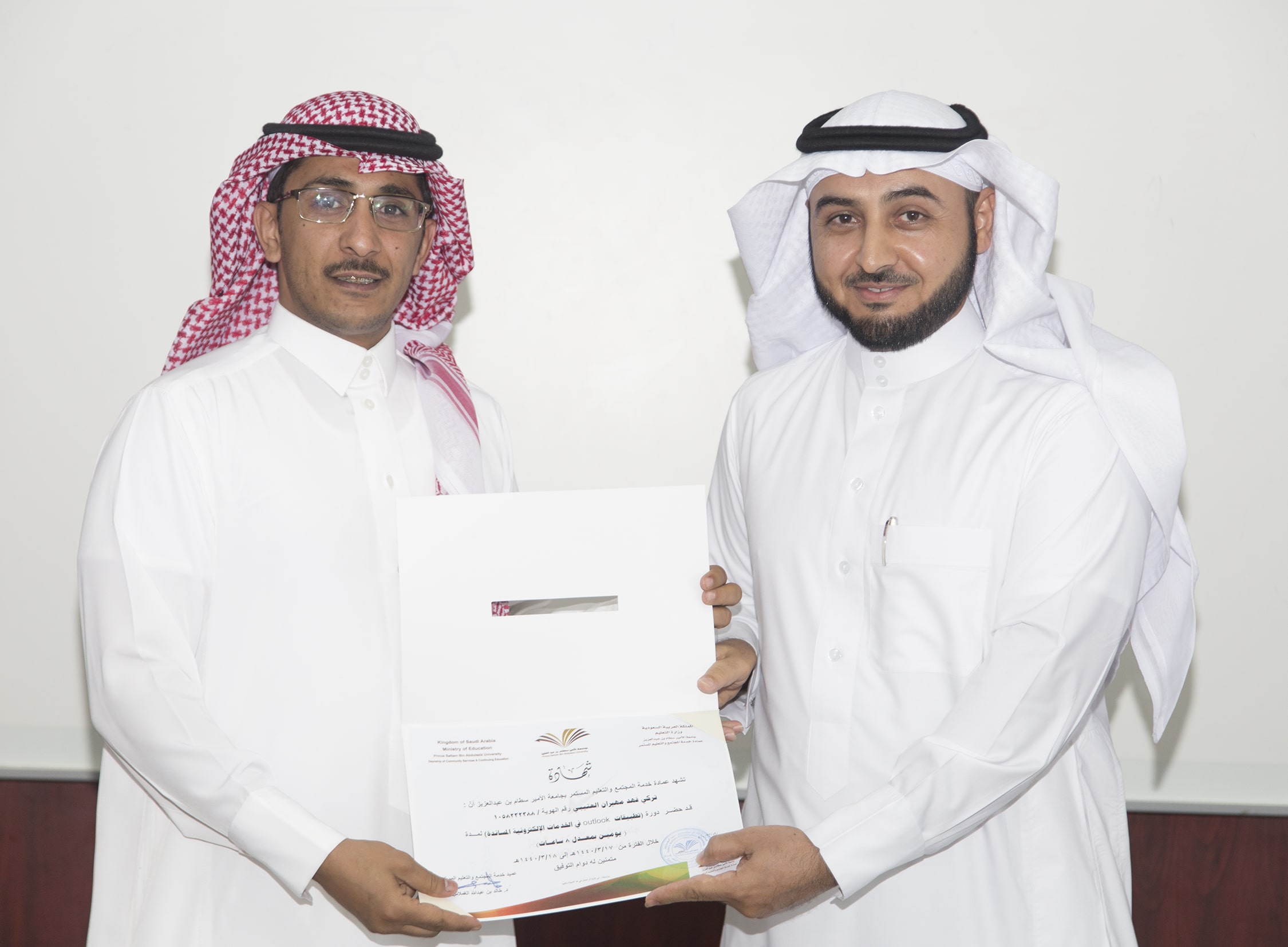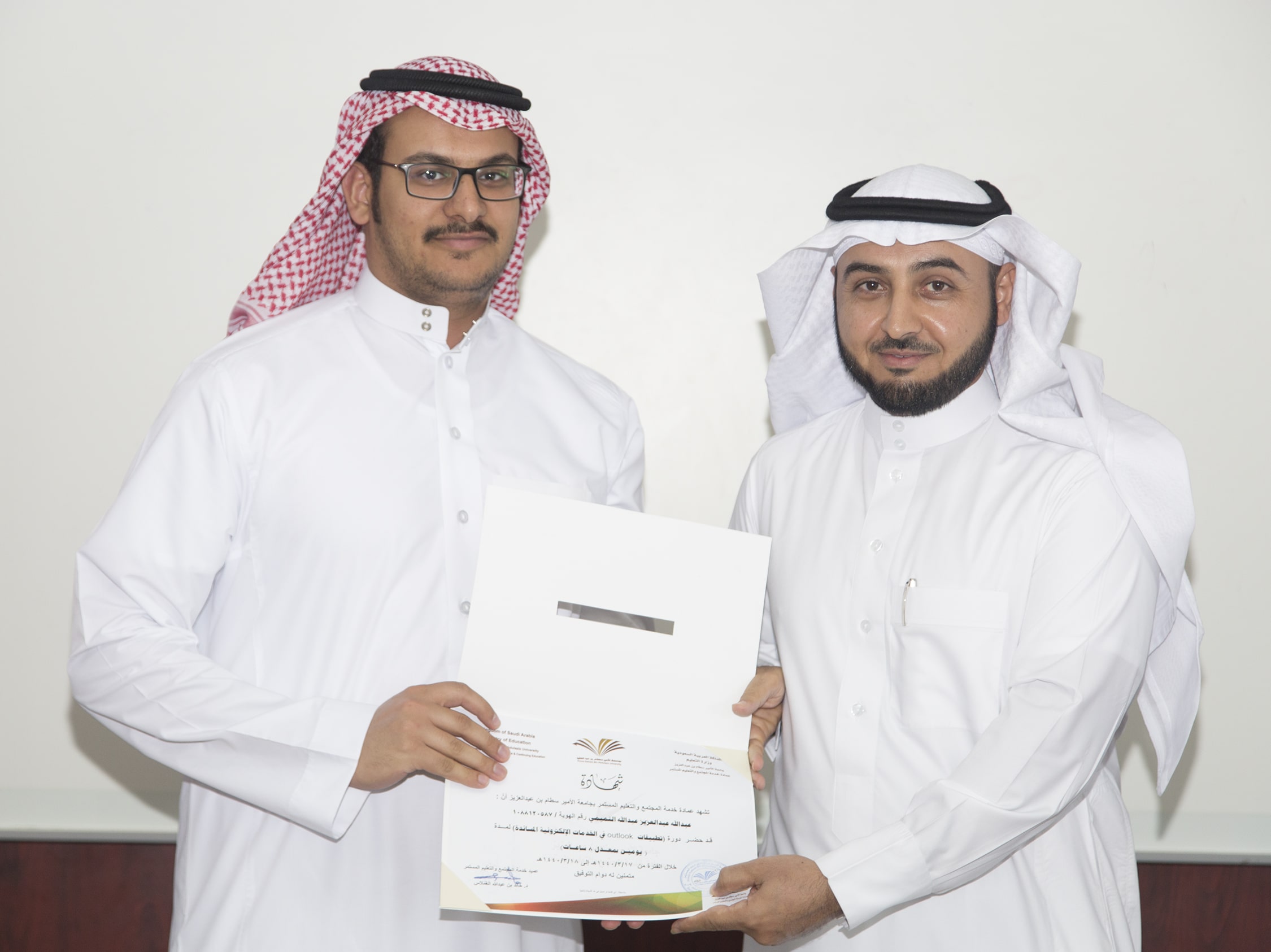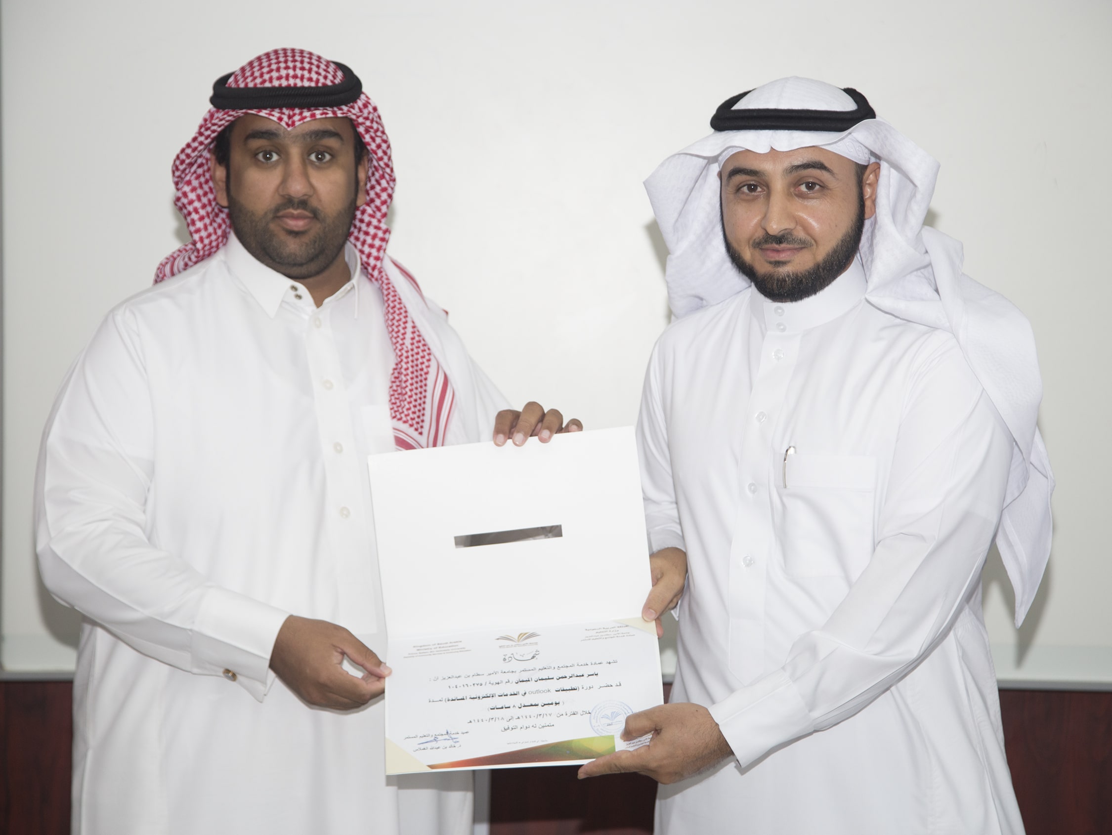 بحضور عميد خدمة المجتمع والتعليم المستمر الدكتور خالد بن عبدالله الغملاس ، اختتم مساء اليوم البرنامج التدريبي : تطبيقات outlook في الخدمات الإلكترونية والذي امتد ليومان وبواقع ٨ ساعات تدريبية تركزت على الجانب العملي في معمل الحاسب الآلي بالعمادة .