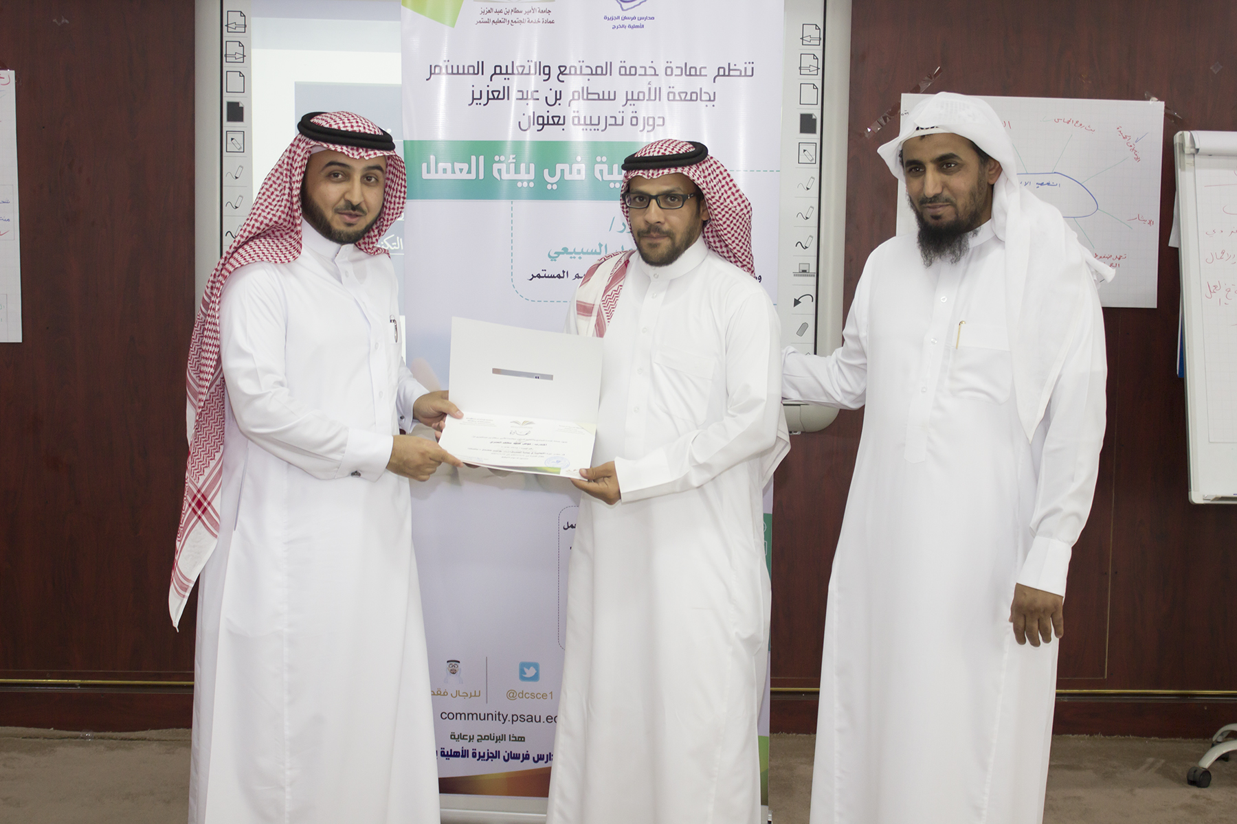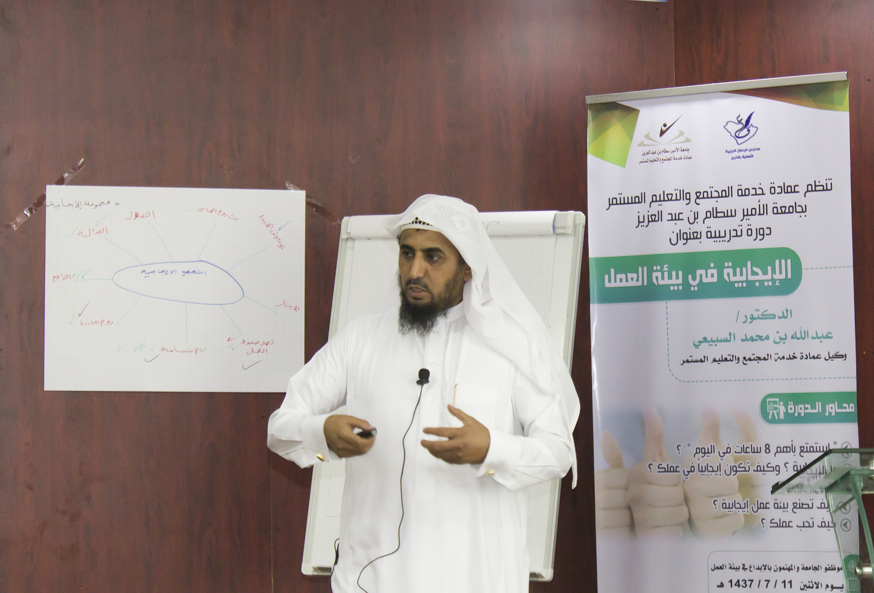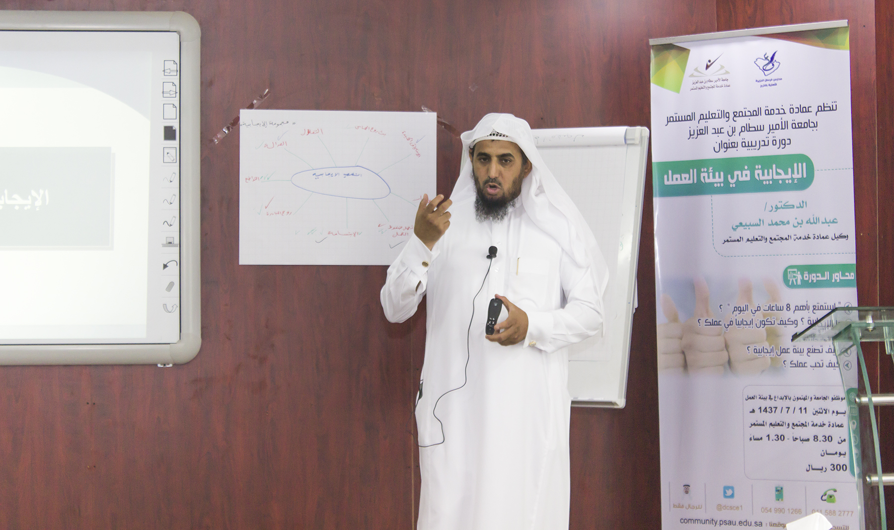 اختتمت مساء أمس الثلاثاء ١٢/٧/١٤٣٧ بعمادة خدمة المجتمع و التعليم المستمر بجامعة الأمير سطام بن عبدالعزيز الدورة التدريبية “ الإيجابية في بيئة العمل “ والتي اقيمت بقاعة التمييز بالعمادة .
