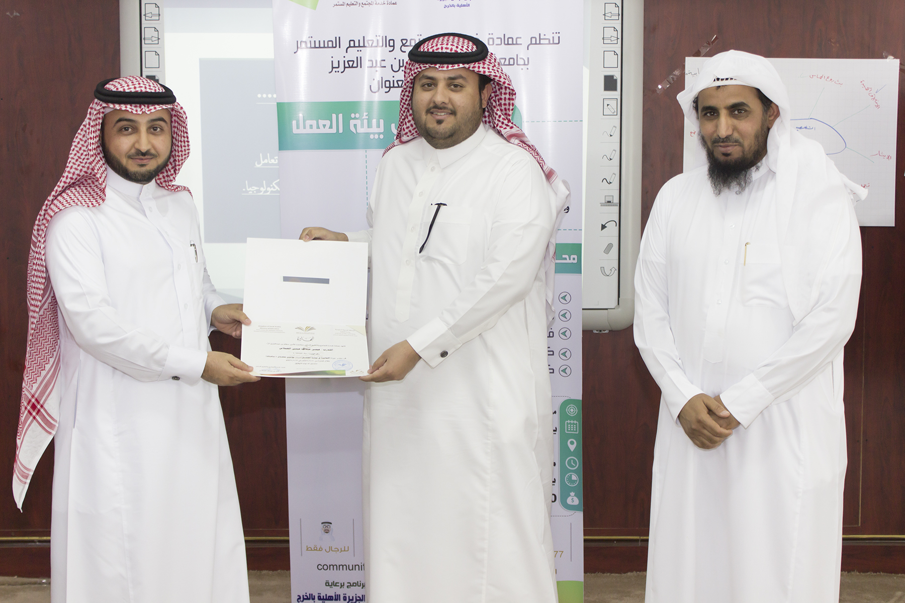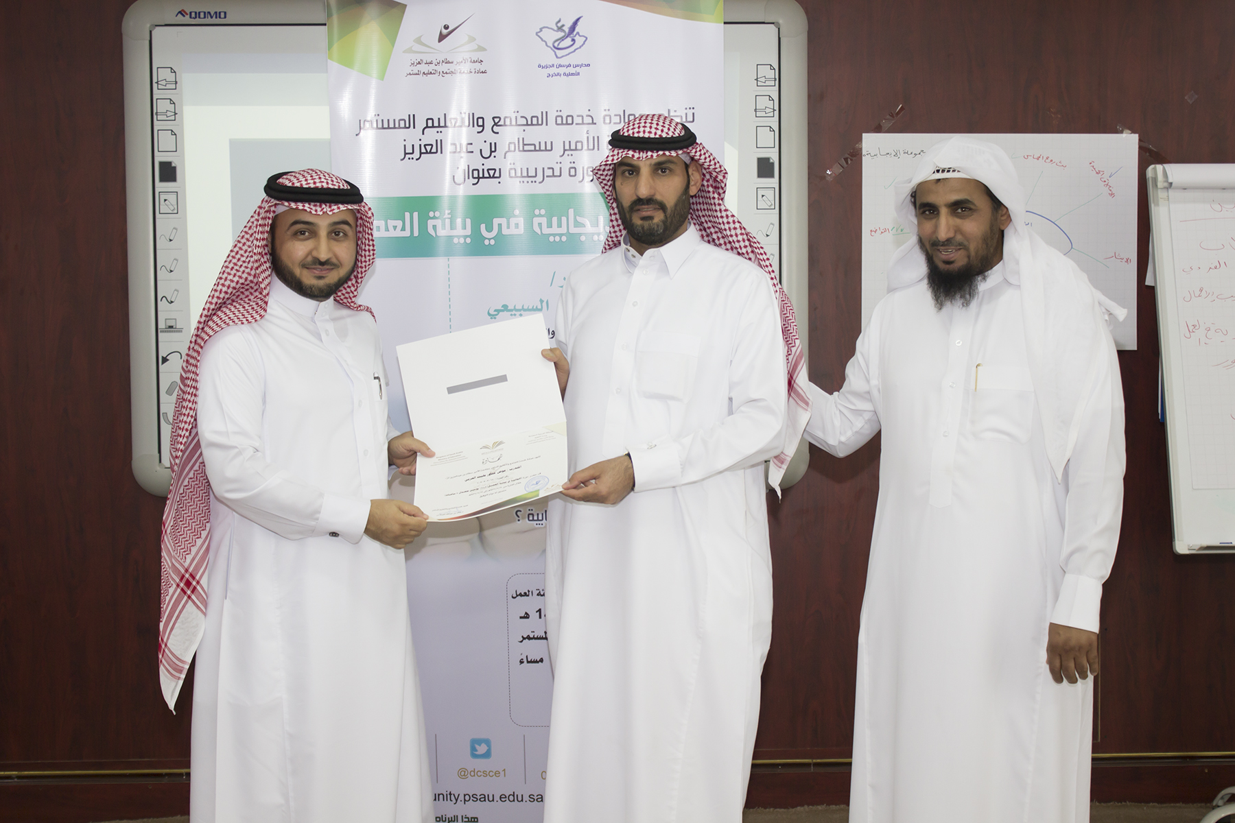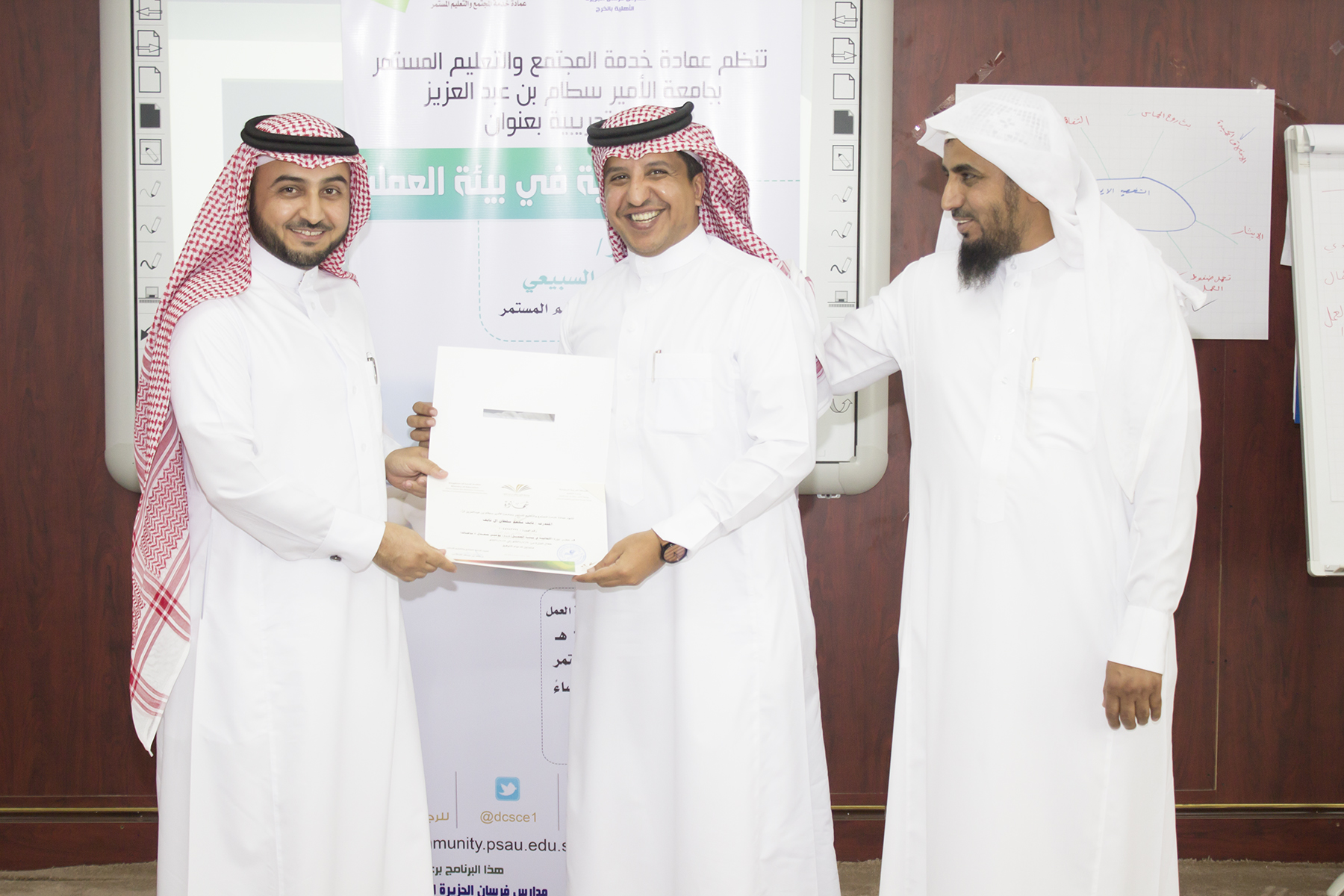 اختتمت مساء أمس الثلاثاء ١٢/٧/١٤٣٧ بعمادة خدمة المجتمع و التعليم المستمر بجامعة الأمير سطام بن عبدالعزيز الدورة التدريبية “ الإيجابية في بيئة العمل “ والتي اقيمت بقاعة التمييز بالعمادة .