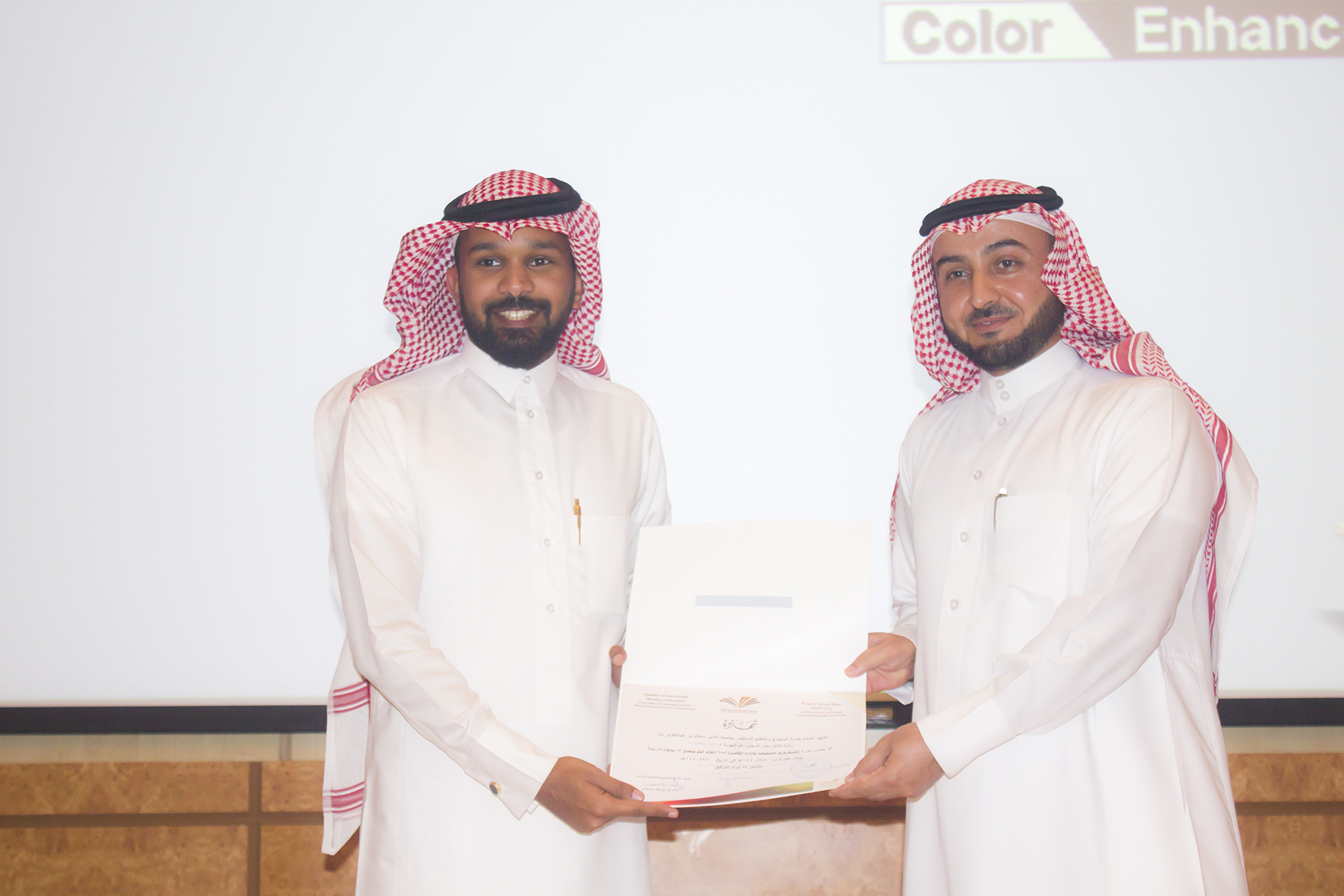 كما سلم عميد خدمة المجتمع والتعليم المستمر الدكتور خالد الغملاس شهادات الحضور على المتدربين , وشكر لهم الانضباط في الحضور وبيّن على أن دور العمادة لا يقتصر على تقديم البرامج التدريبية بل حتى في تلقي الاقتراحات والشكاوى وذلك سعياً من العمادة على تحسين وتطوير البيئة التدريبية .