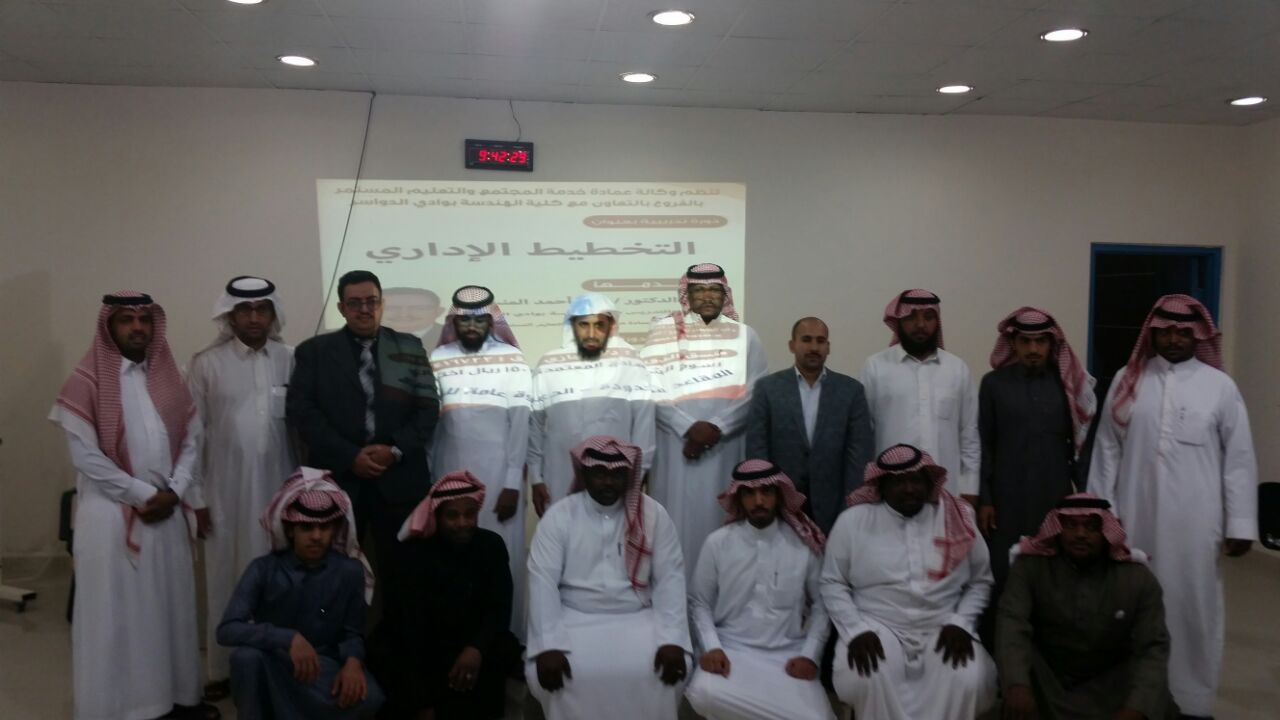 أختتمت صباح اليوم دورة “التخطيط الإداري ” والتي أقيمت على مسرح كلية الهندسة بوادي الدواسر نظمتها وكالةعمادة خدمة المجتمع والتعليم المستمر بالفروع بالتعاون مع كلية الهندسة ، وقد استمرت الدورة لمدة يومين بواقع (6) ساعة تدريبية خلال الفترة من1-2-/6 /1438هـ ، ، وقدم هذه الدورة المدرب / د. عرفة أحمد المنسي مشرف التدريب بوكالة خدمة المجتمع بالفروع وعضو هيئة تدريس بكلية الهندسة .