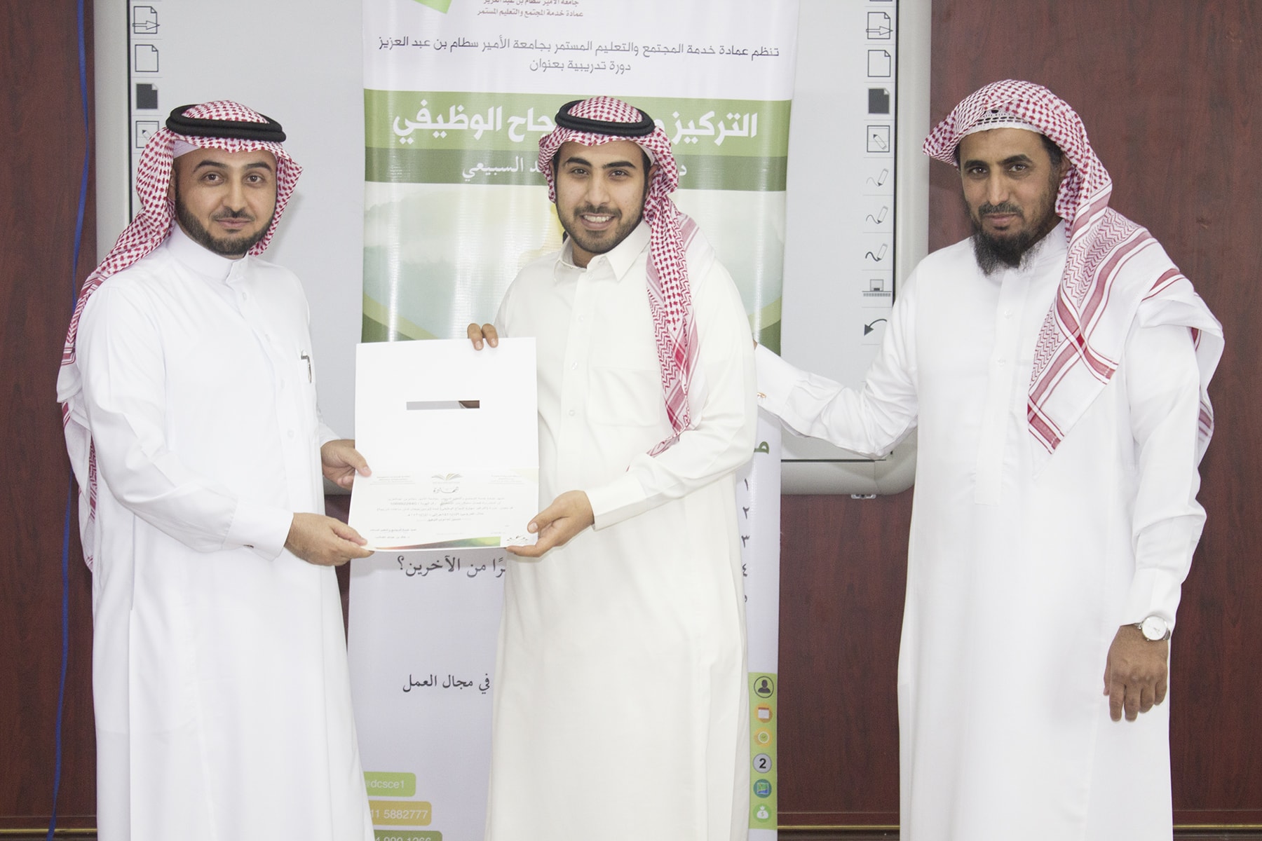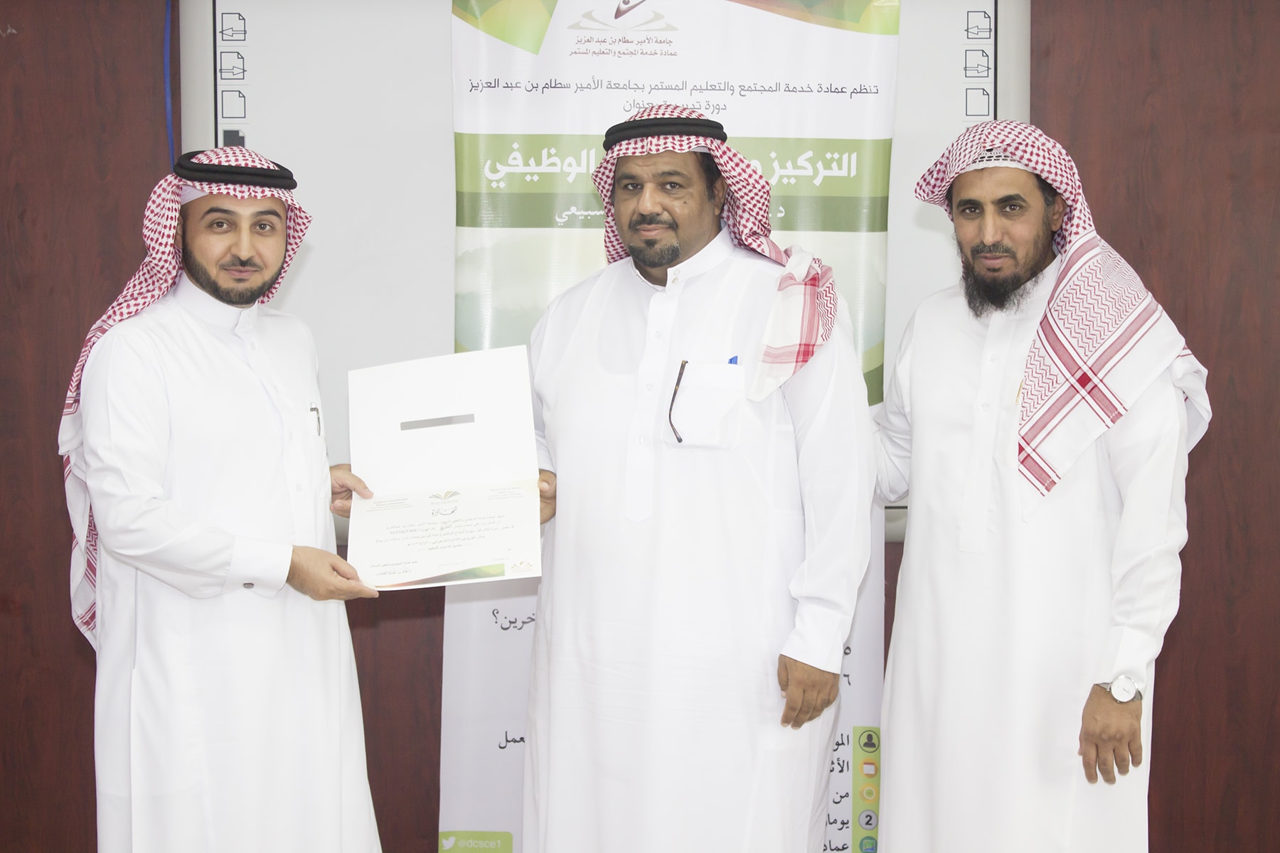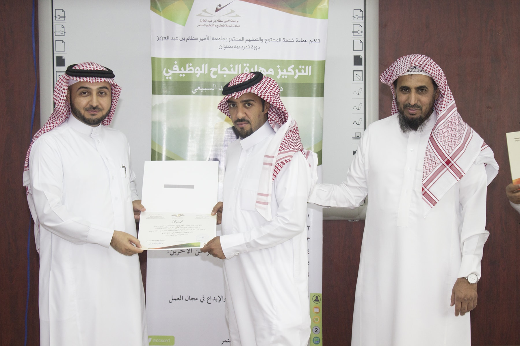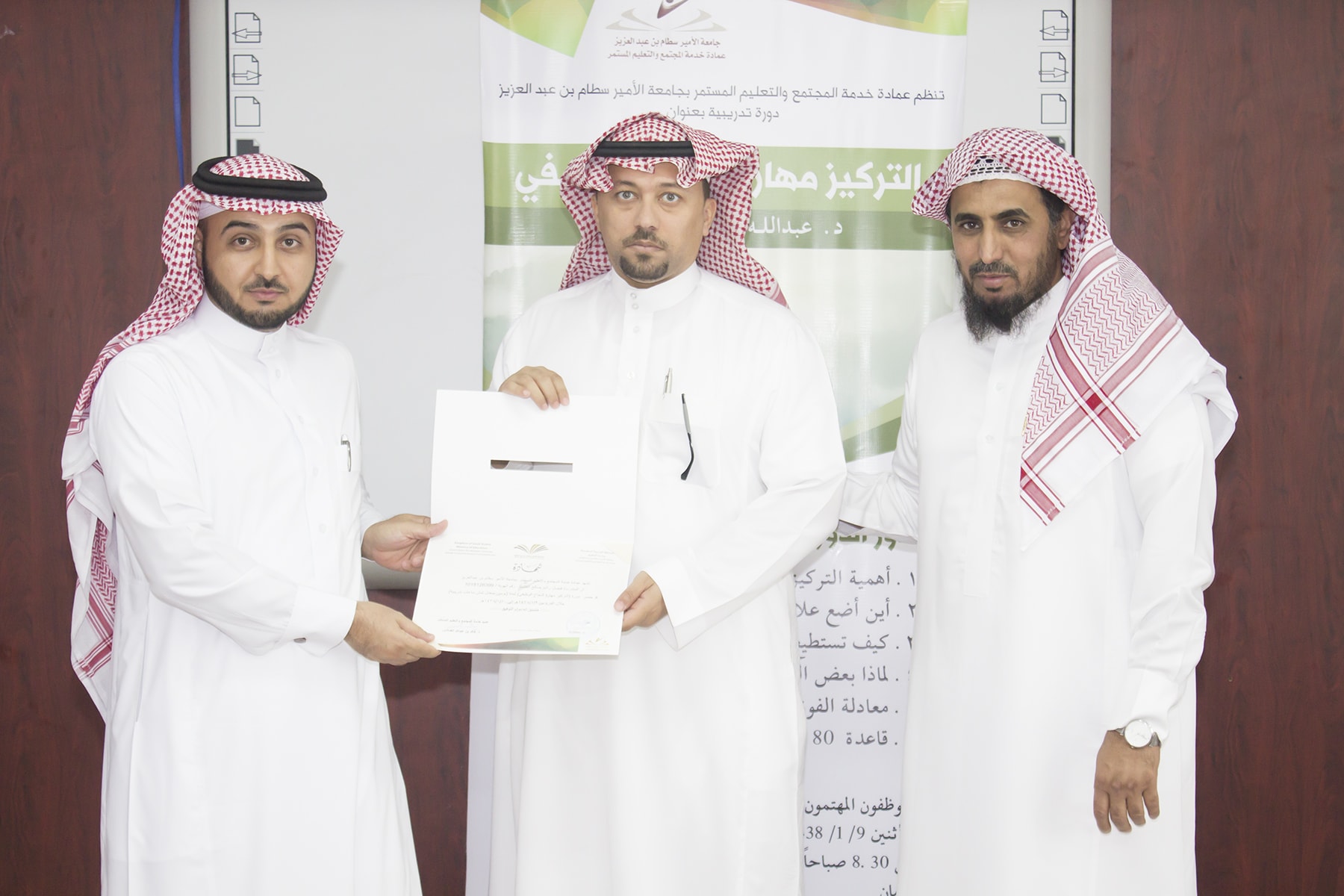 وفي ختام البرنامج تسلم المتدربين شهادة الحضور برعاية عميد خدمة المجتمع و التعليم المستمر الدكتور خالد الغملاس .