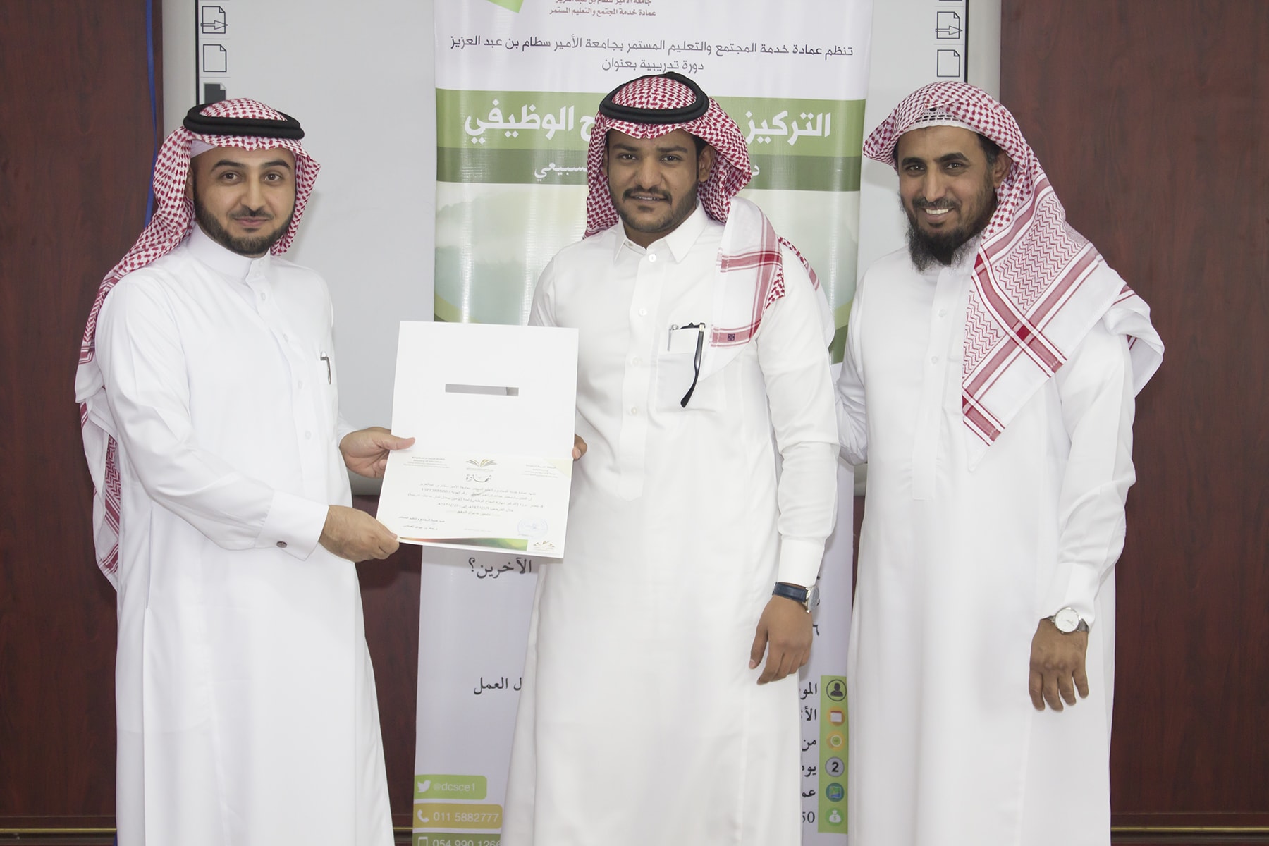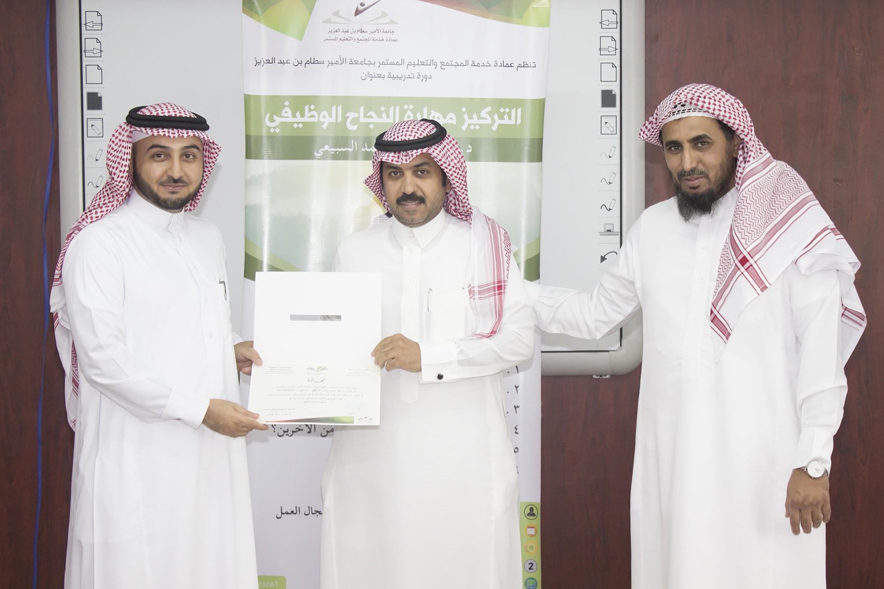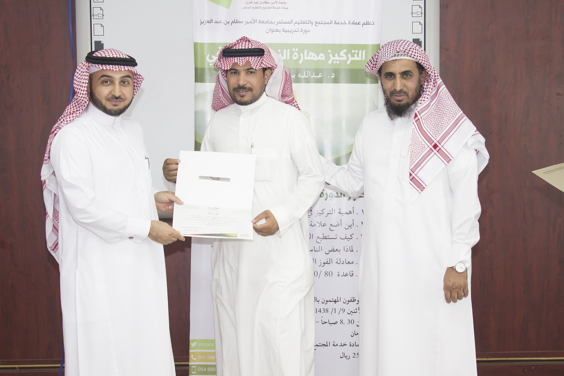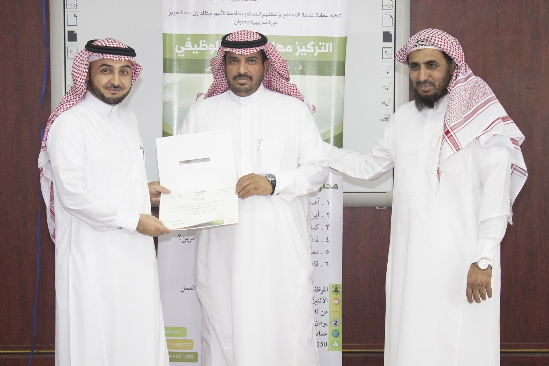وفي ختام البرنامج تسلم المتدربين شهادة الحضور برعاية عميد خدمة المجتمع و التعليم المستمر الدكتور خالد الغملاس .