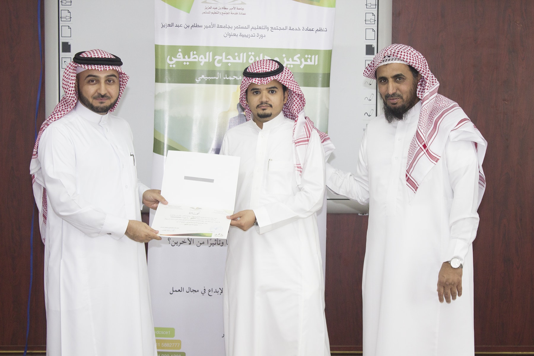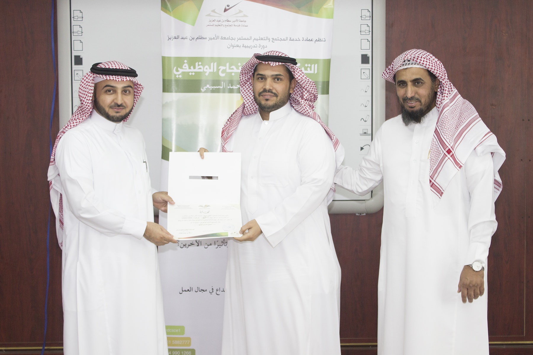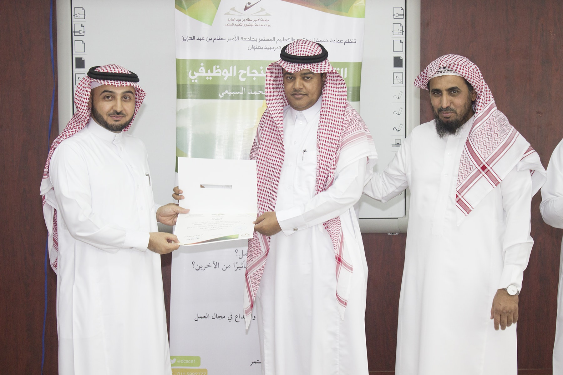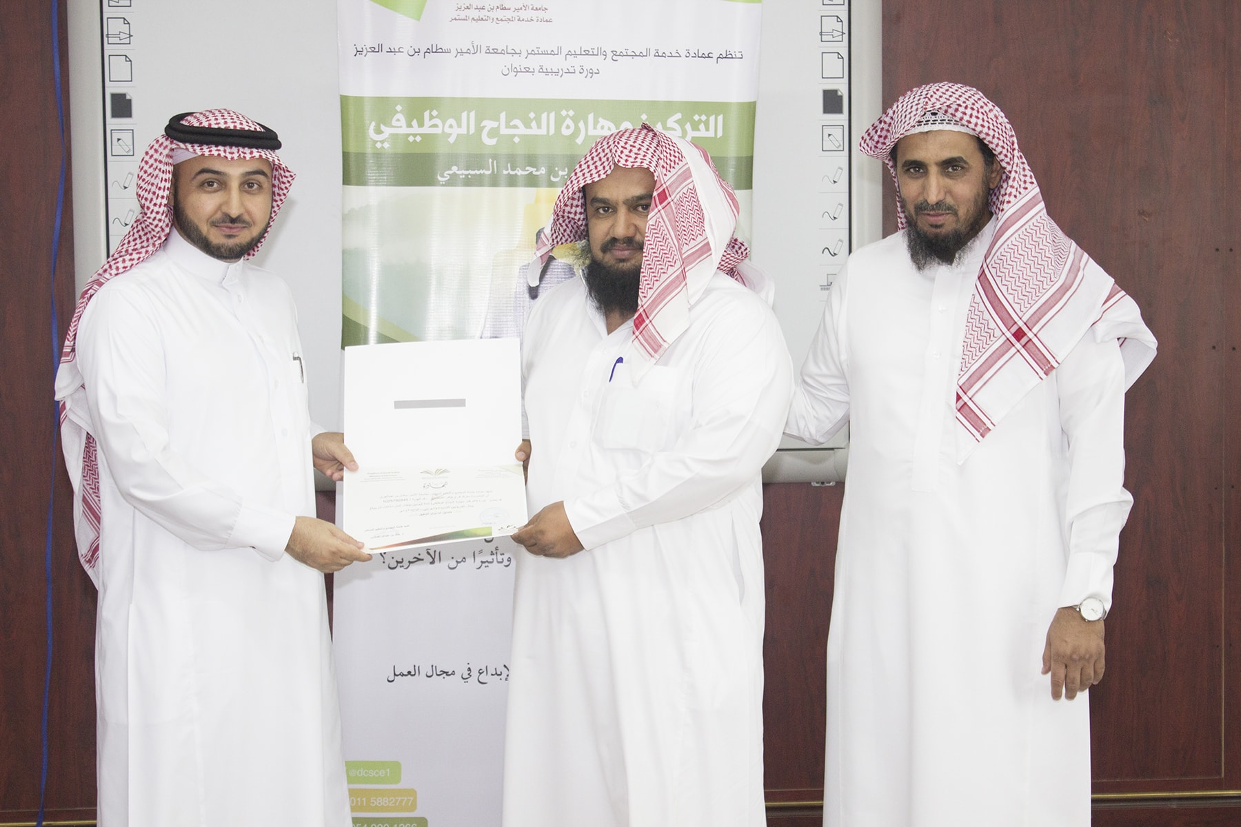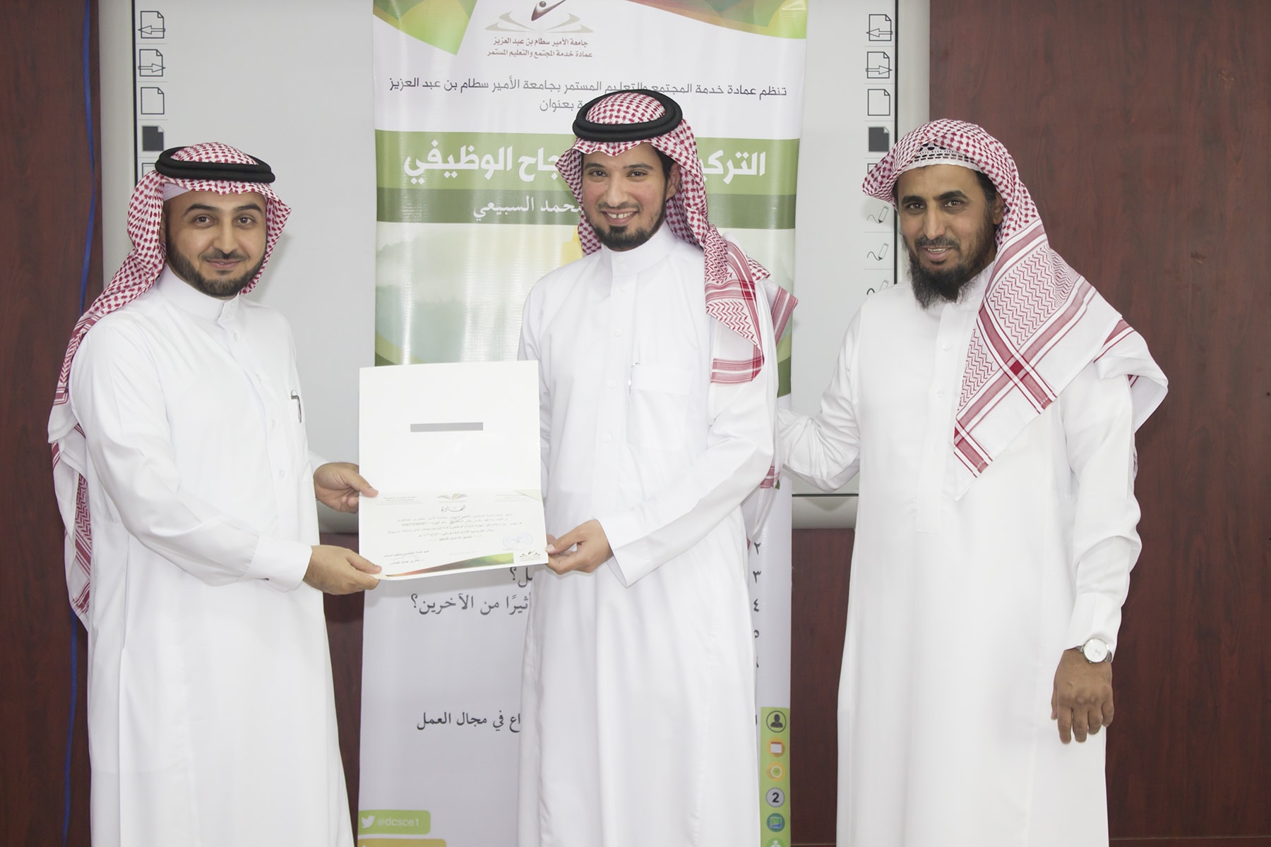 وفي ختام البرنامج تسلم المتدربين شهادة الحضور برعاية عميد خدمة المجتمع و التعليم المستمر الدكتور خالد الغملاس .