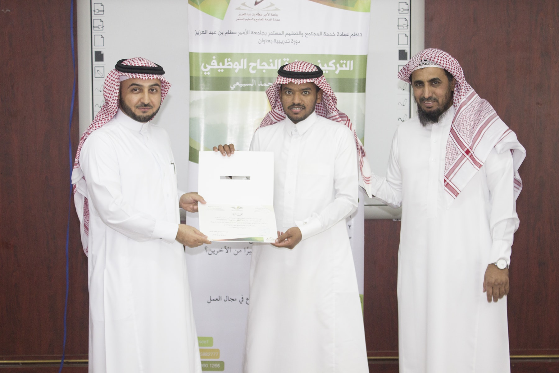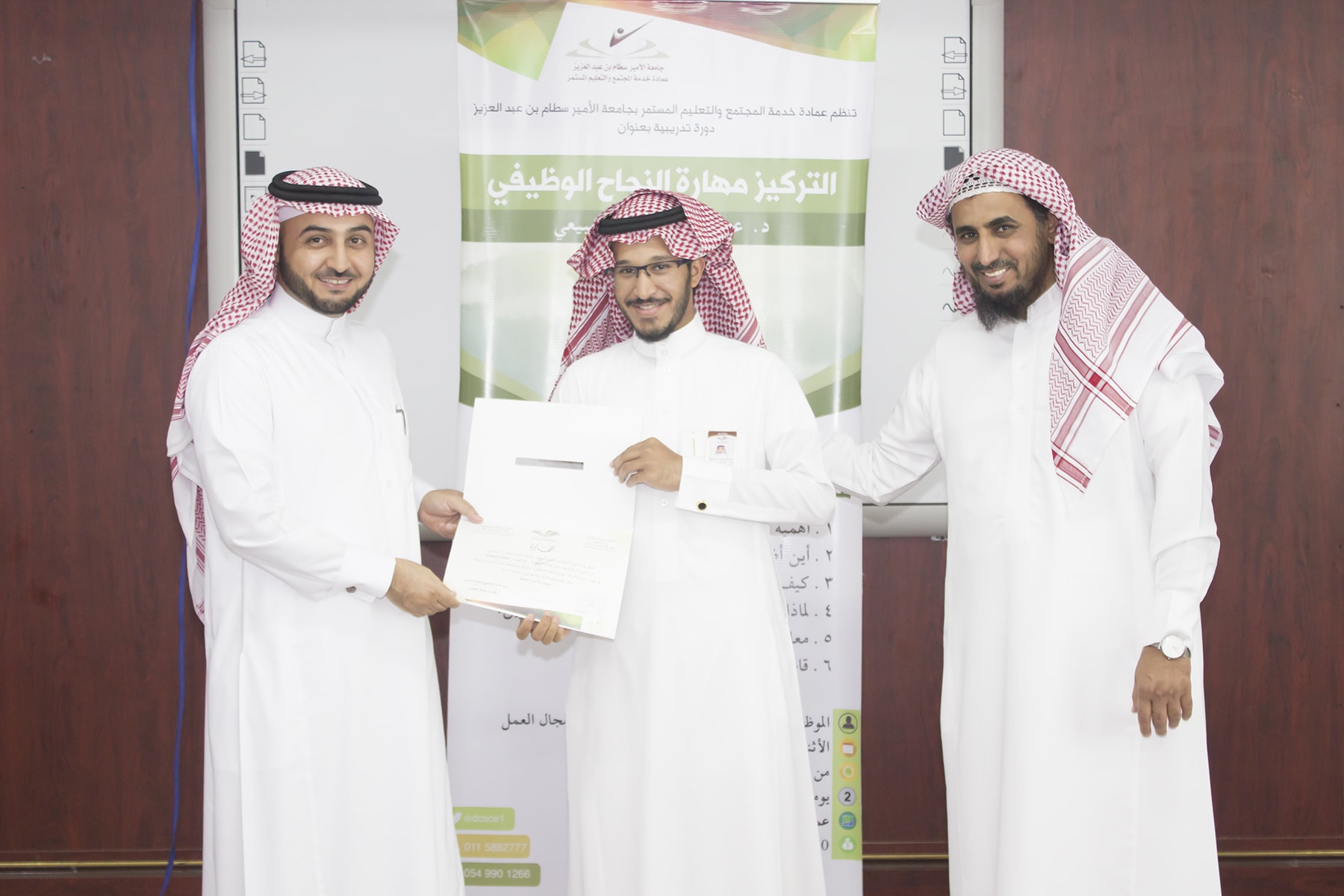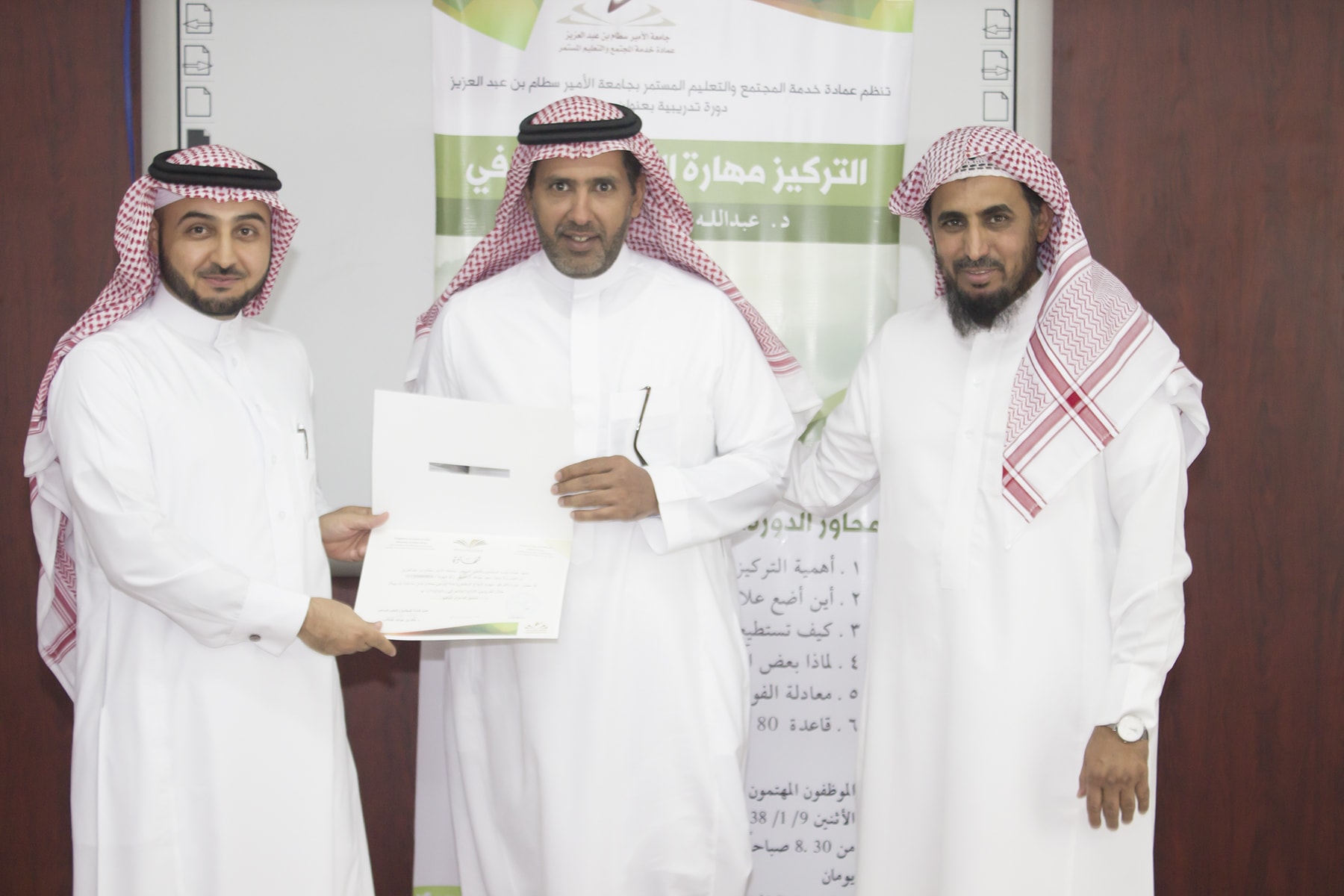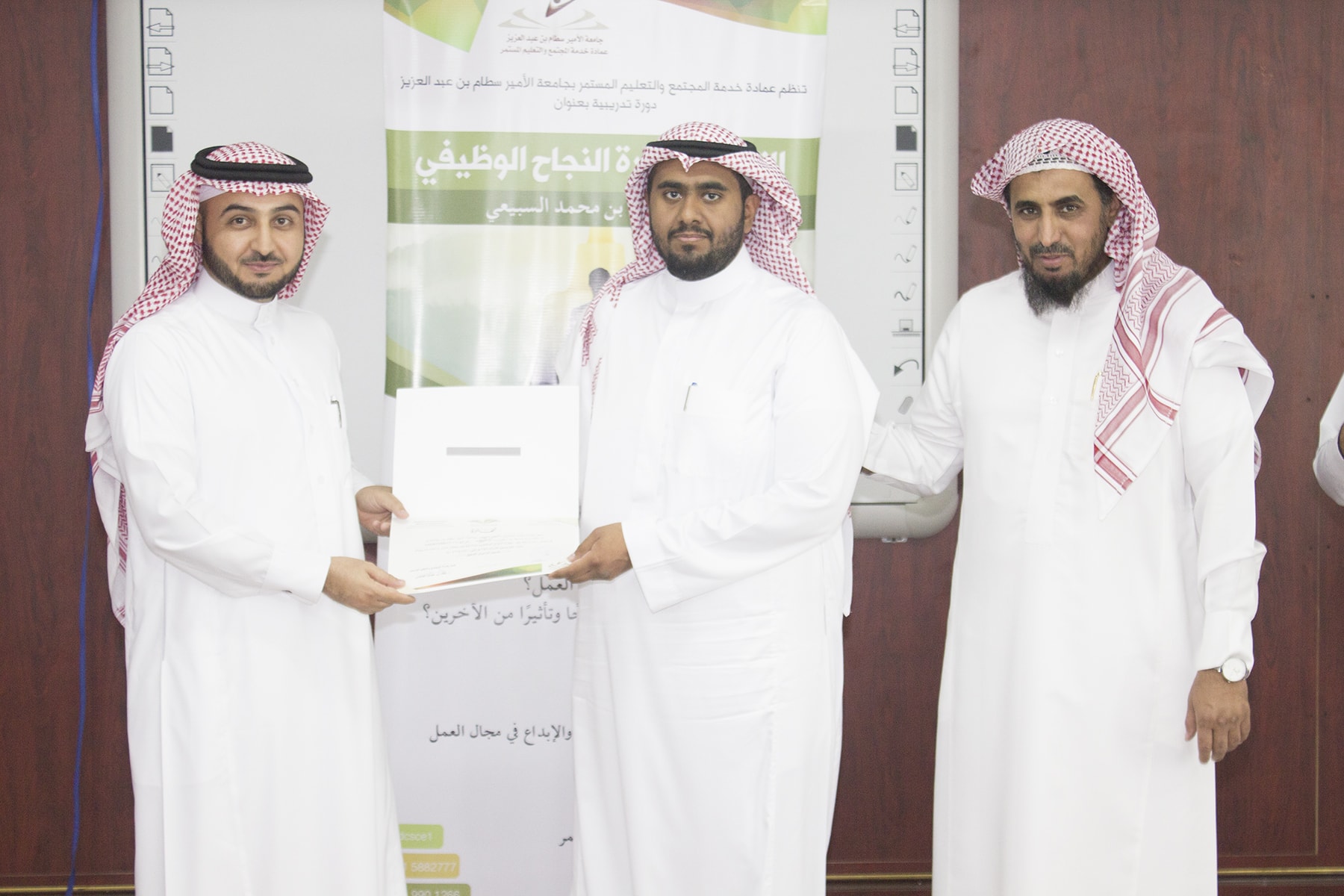 وفي ختام البرنامج تسلم المتدربين شهادة الحضور برعاية عميد خدمة المجتمع و التعليم المستمر الدكتور خالد الغملاس .