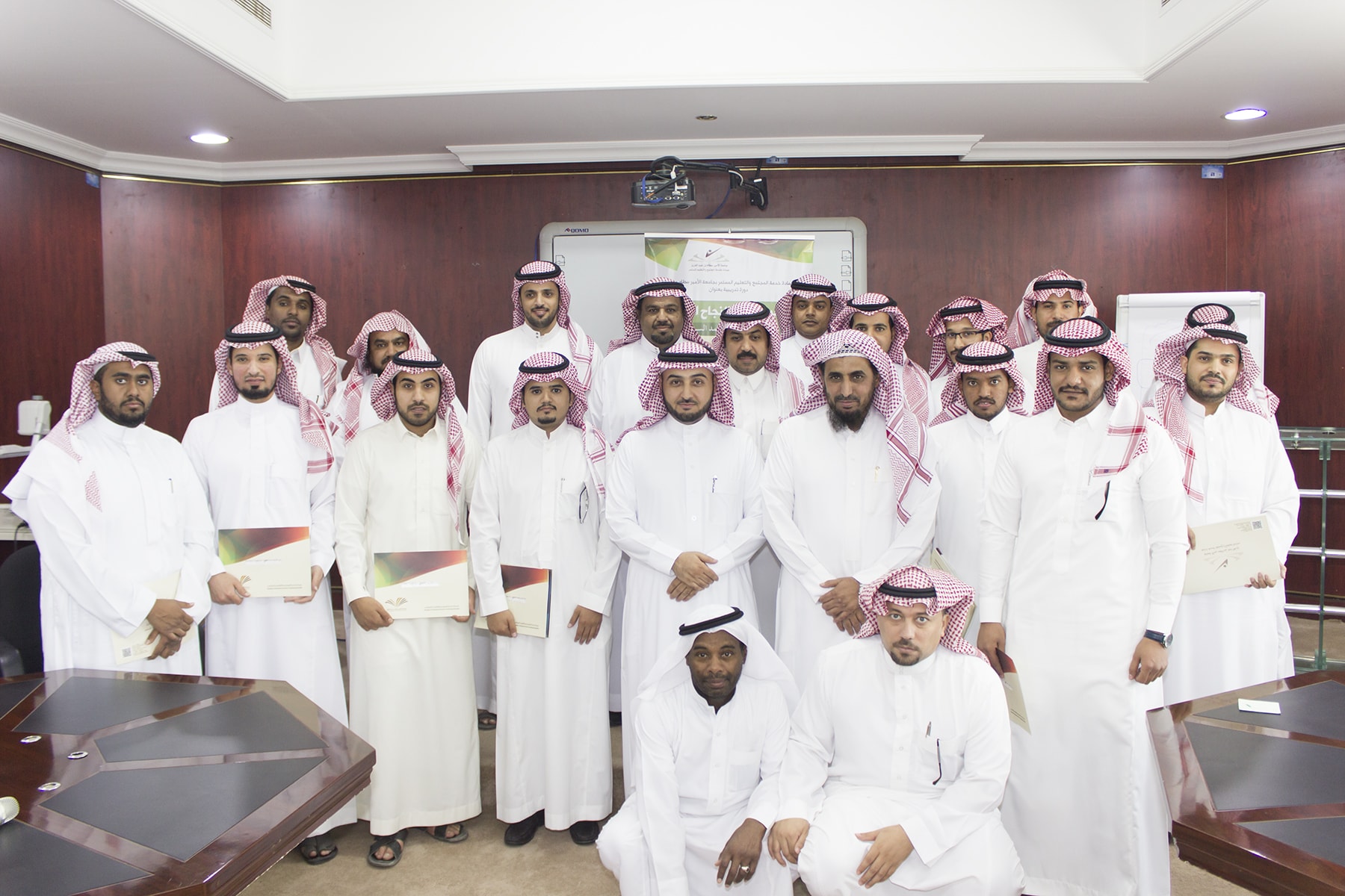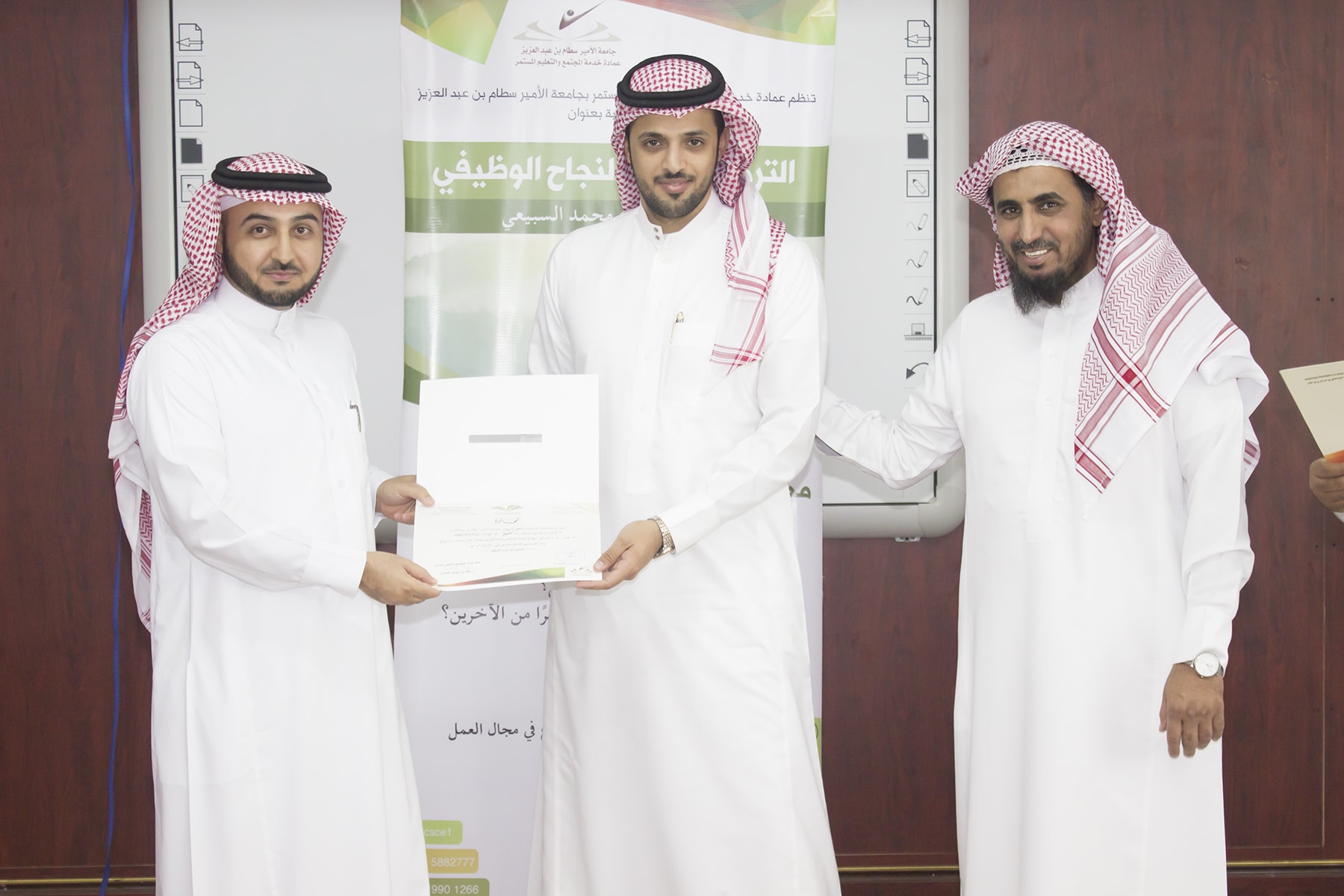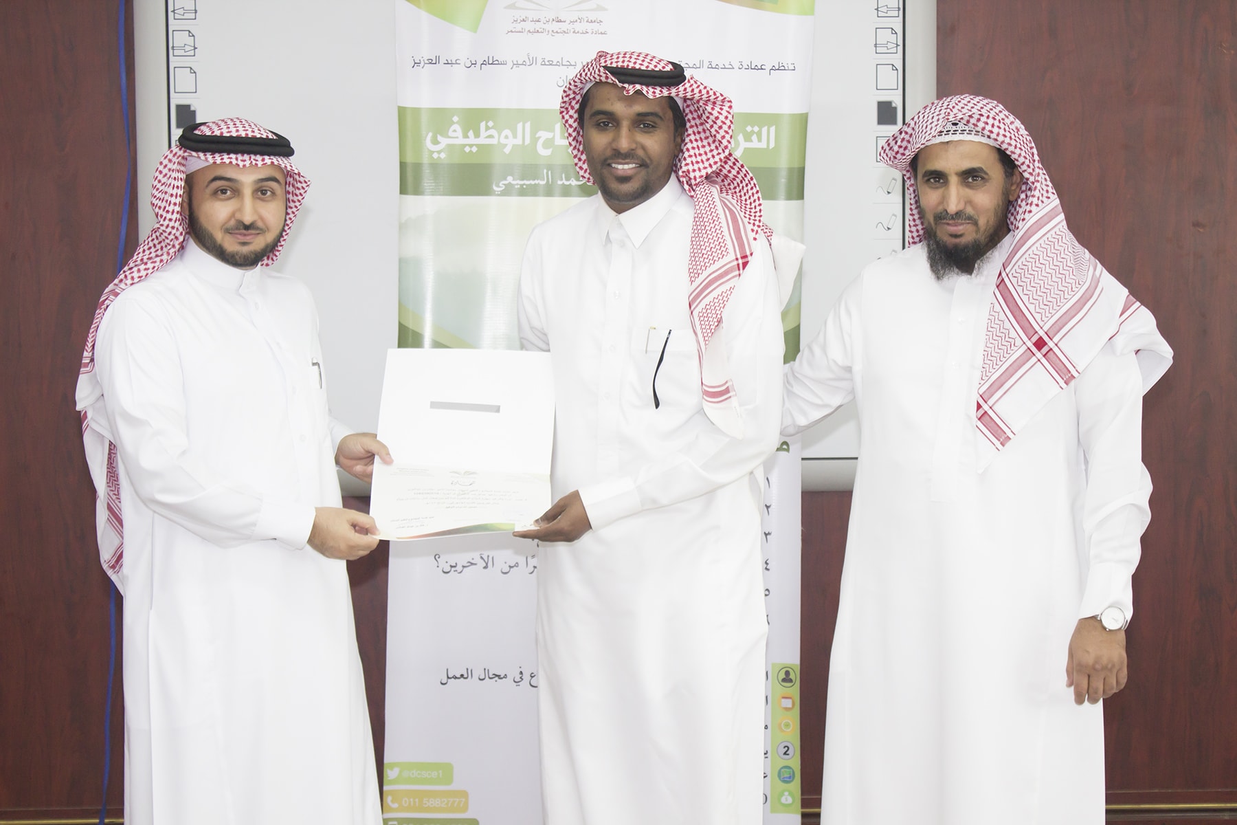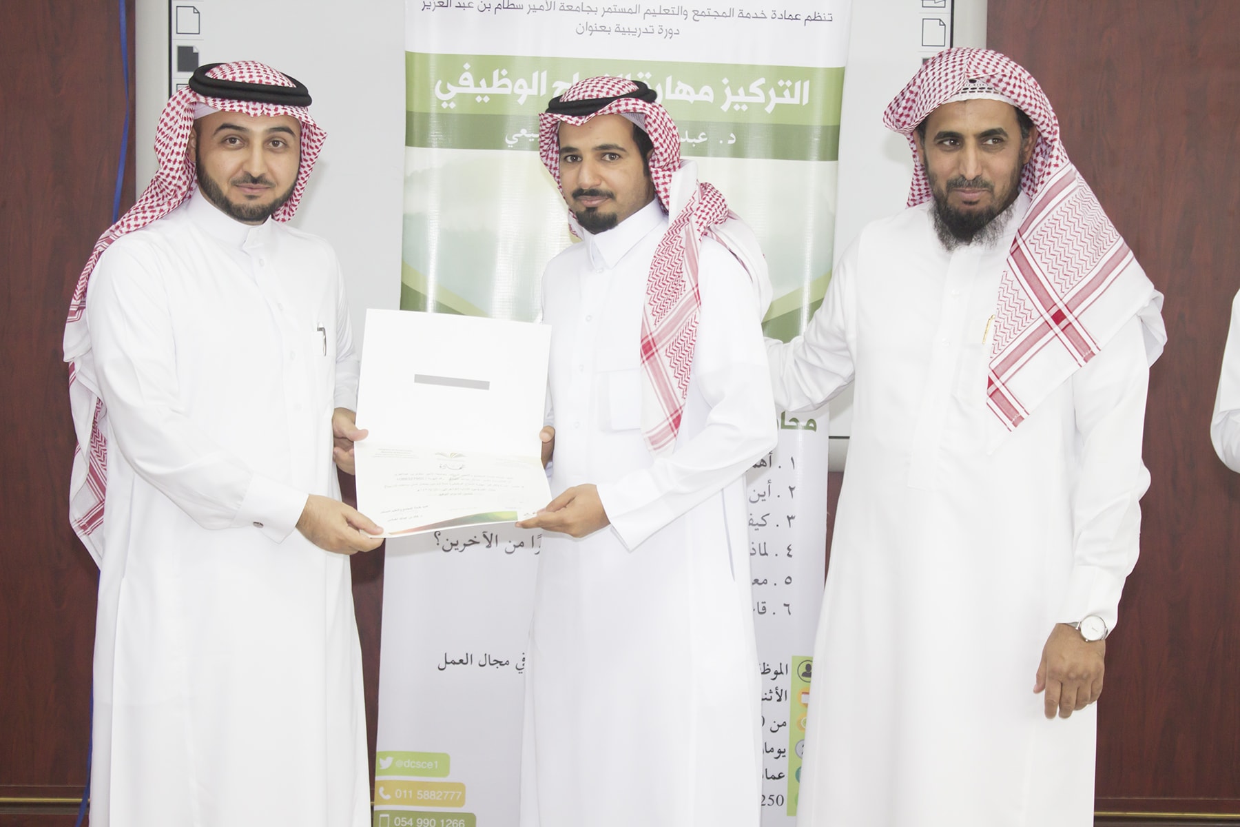 وفي ختام البرنامج تسلم المتدربين شهادة الحضور برعاية عميد خدمة المجتمع و التعليم المستمر الدكتور خالد الغملاس .