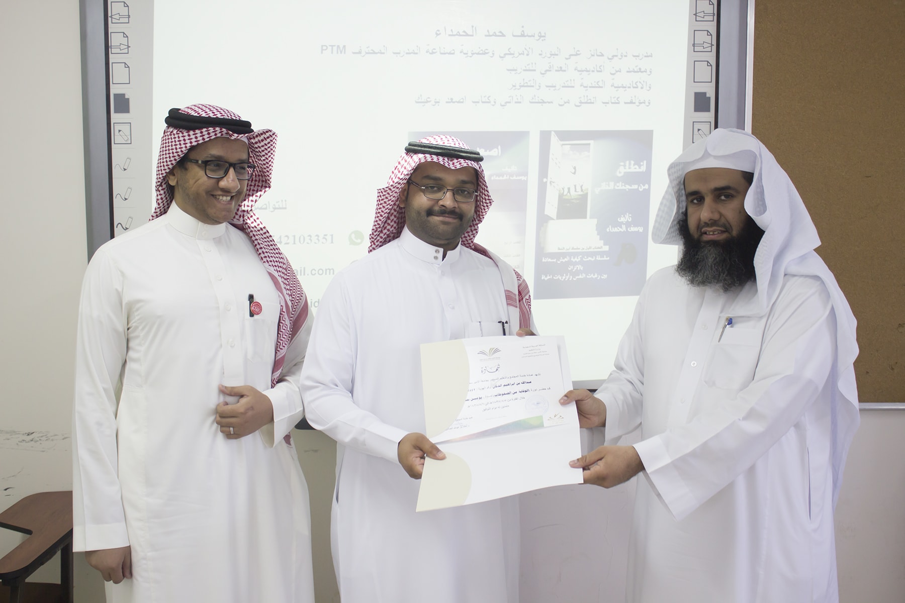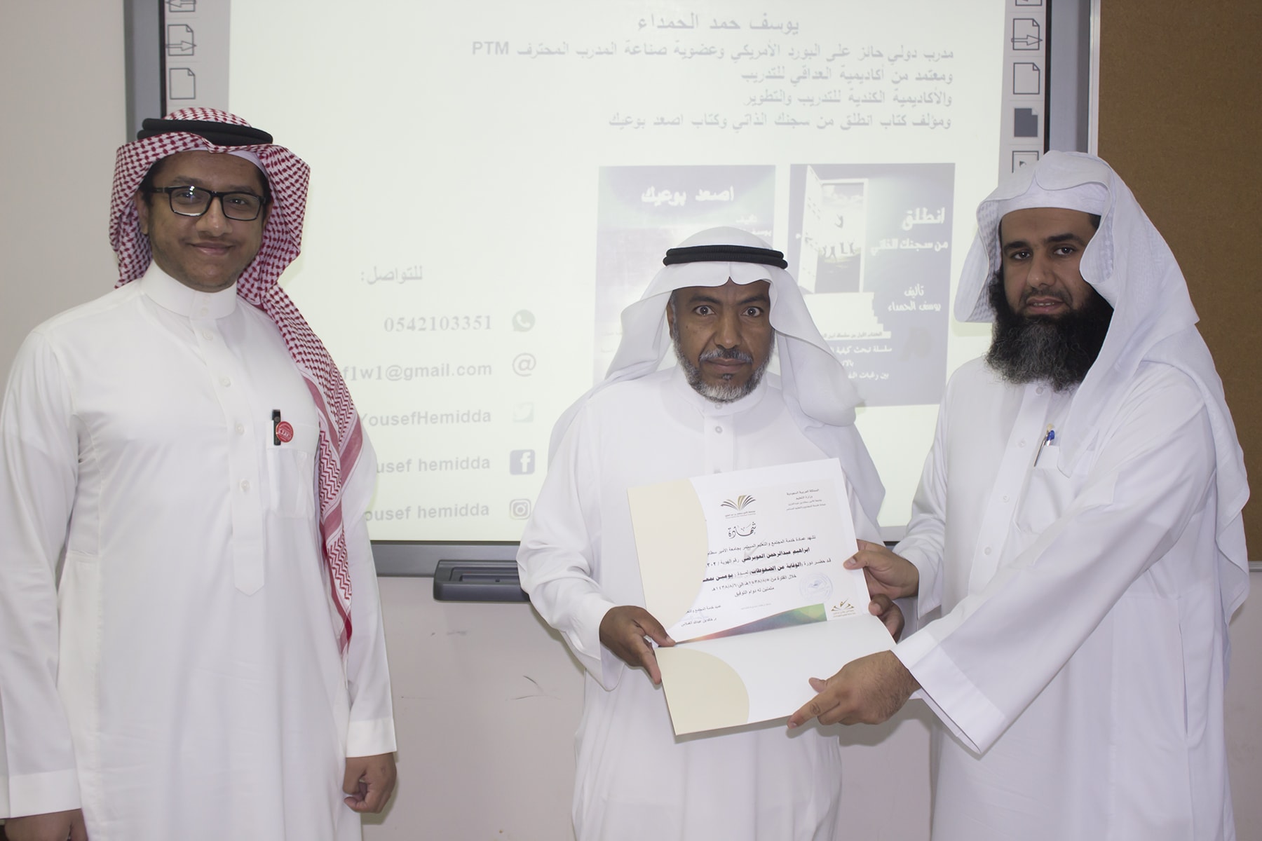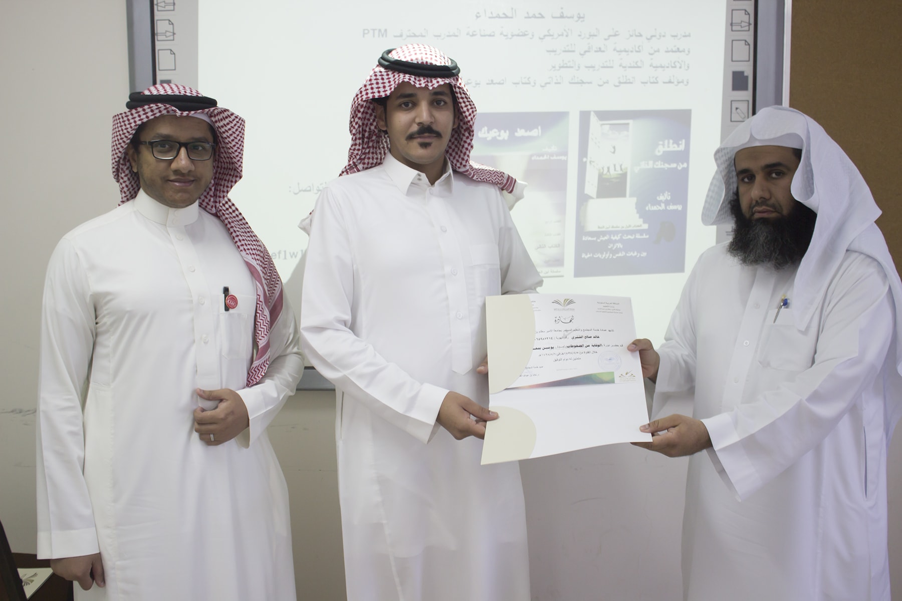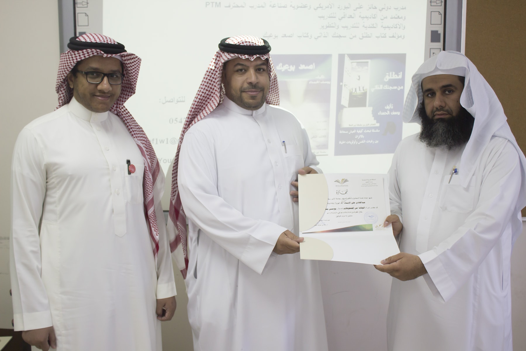 وفي ختام البرنامج قدم وكيل كلية إدارة الأعمال الدكتور إبراهيم آل داوود شكره الجزيل لعميد خدمة المجتمع و التعليم المستمر بالجامعة الدكتور خالد الغملاس على حرصه على مد جسور التواصل و التعاون و استفادة أبناء المحافظة و موظفي الكلية لمثل هذه البرامج التدريبية المميزة ، كما قدم شكره لفريق العمل بالعمادة و منسق الجودة بكلية إدارة الأعمال الأستاذ خالد التويم ، وبعد ذلك تسلم المتدربين شهادات حضور الدورة .