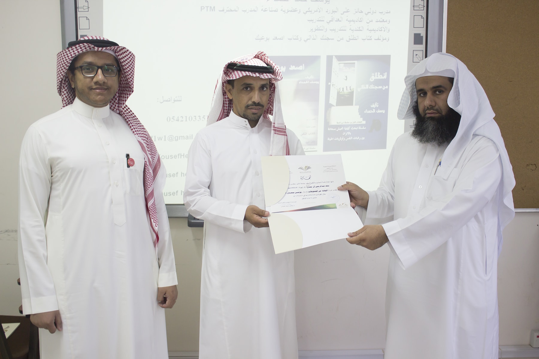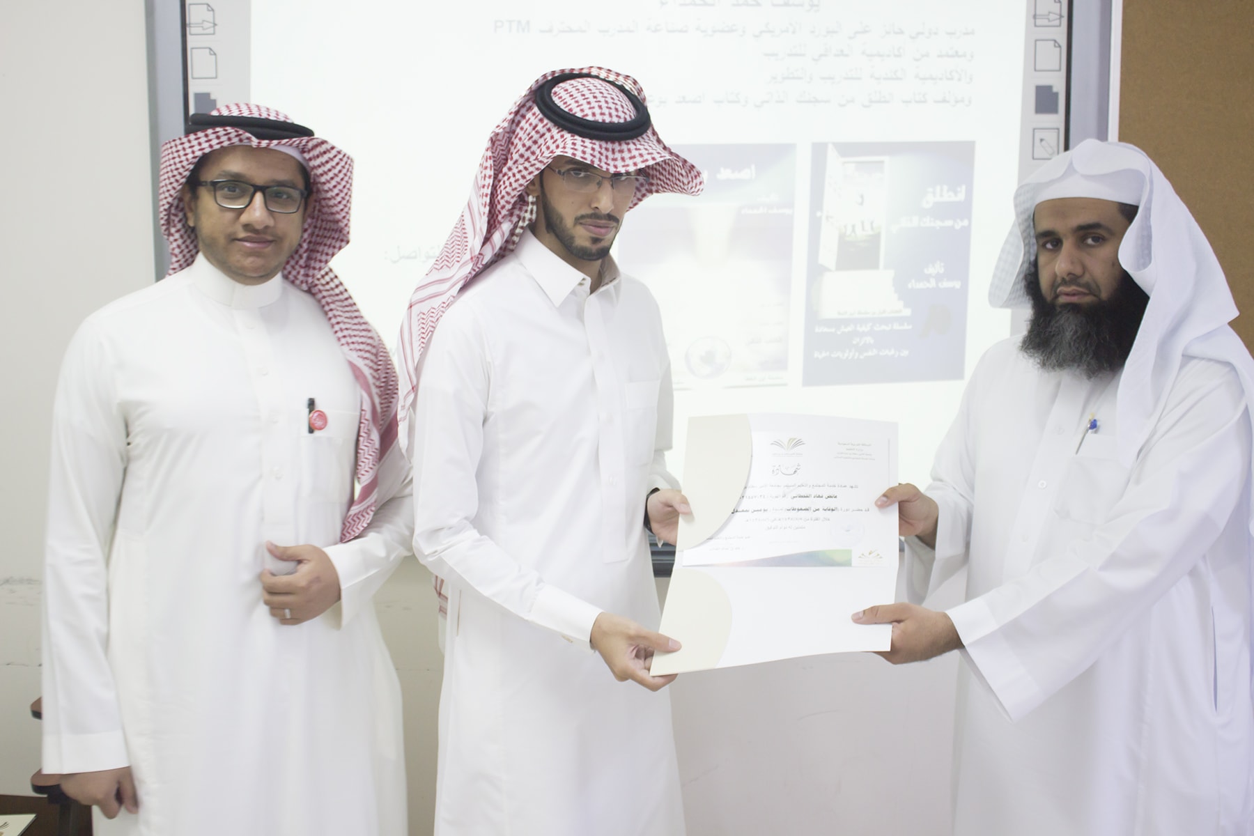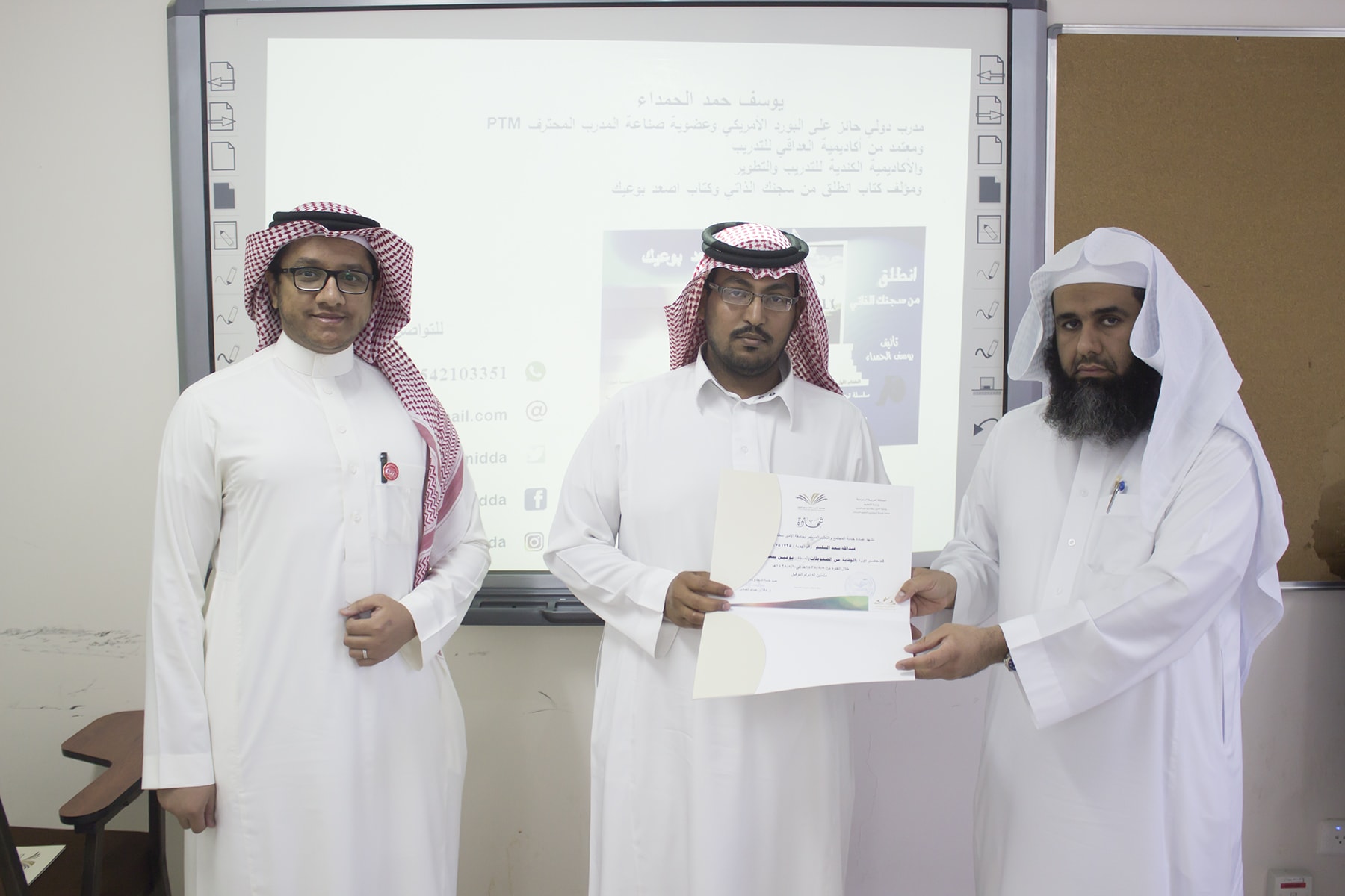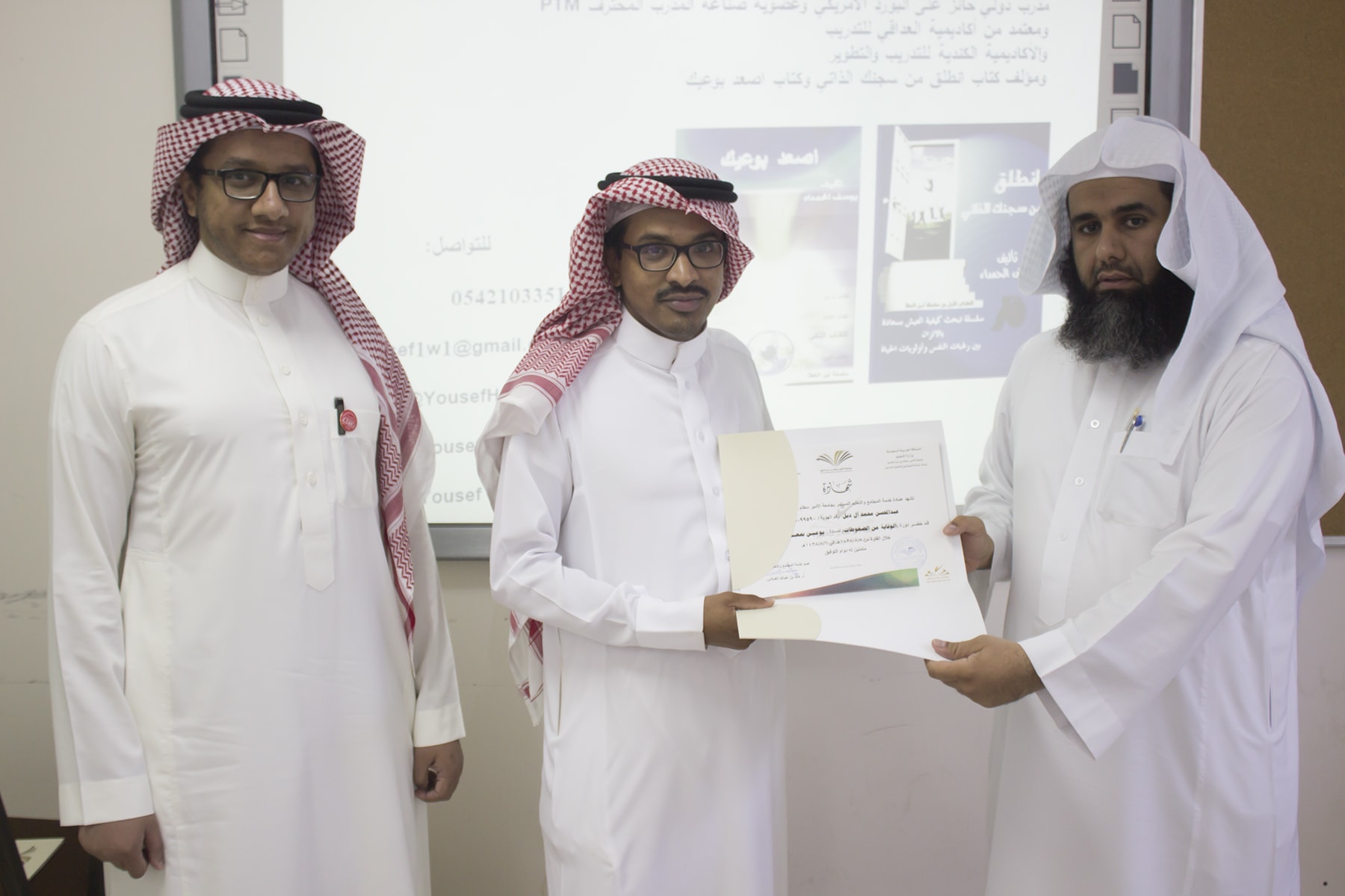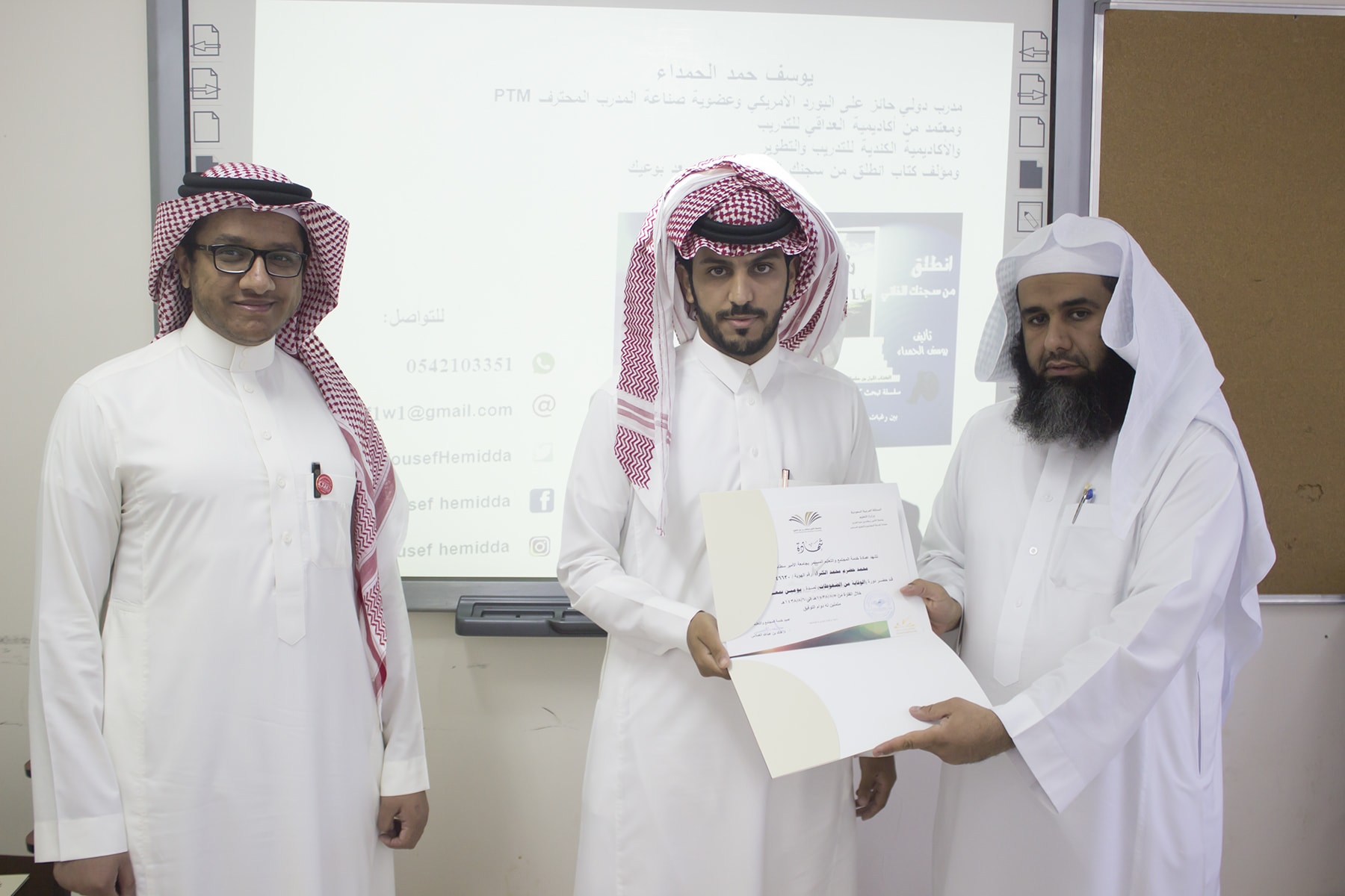 وفي ختام البرنامج قدم وكيل كلية إدارة الأعمال الدكتور إبراهيم آل داوود شكره الجزيل لعميد خدمة المجتمع و التعليم المستمر بالجامعة الدكتور خالد الغملاس على حرصه على مد جسور التواصل و التعاون و استفادة أبناء المحافظة و موظفي الكلية لمثل هذه البرامج التدريبية المميزة ، كما قدم شكره لفريق العمل بالعمادة و منسق الجودة بكلية إدارة الأعمال الأستاذ خالد التويم ، وبعد ذلك تسلم المتدربين شهادات حضور الدورة .