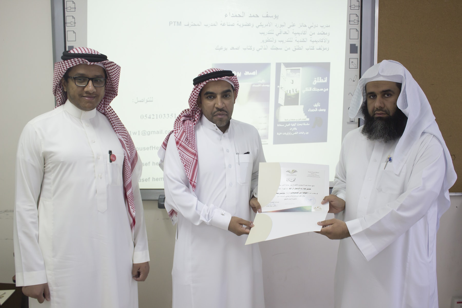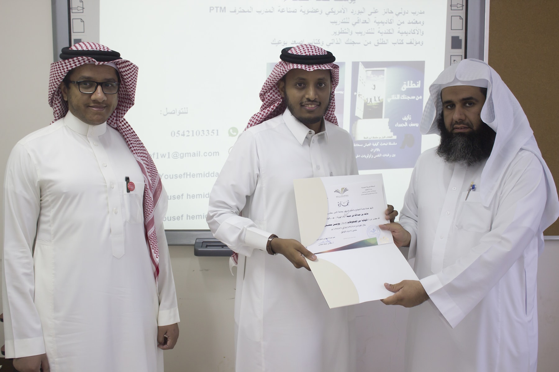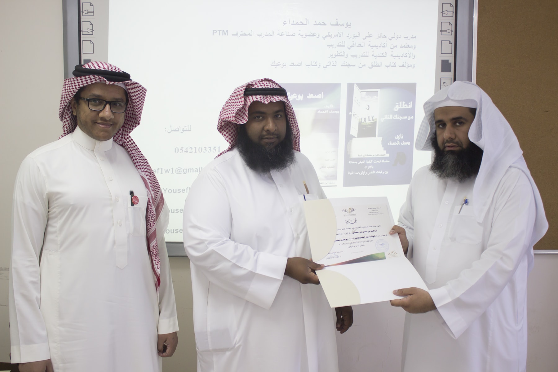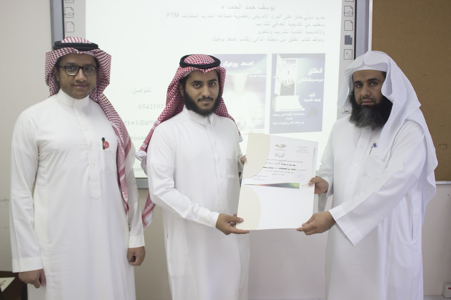 وفي ختام البرنامج قدم وكيل كلية إدارة الأعمال الدكتور إبراهيم آل داوود شكره الجزيل لعميد خدمة المجتمع و التعليم المستمر بالجامعة الدكتور خالد الغملاس على حرصه على مد جسور التواصل و التعاون و استفادة أبناء المحافظة و موظفي الكلية لمثل هذه البرامج التدريبية المميزة ، كما قدم شكره لفريق العمل بالعمادة و منسق الجودة بكلية إدارة الأعمال الأستاذ خالد التويم ، وبعد ذلك تسلم المتدربين شهادات حضور الدورة .