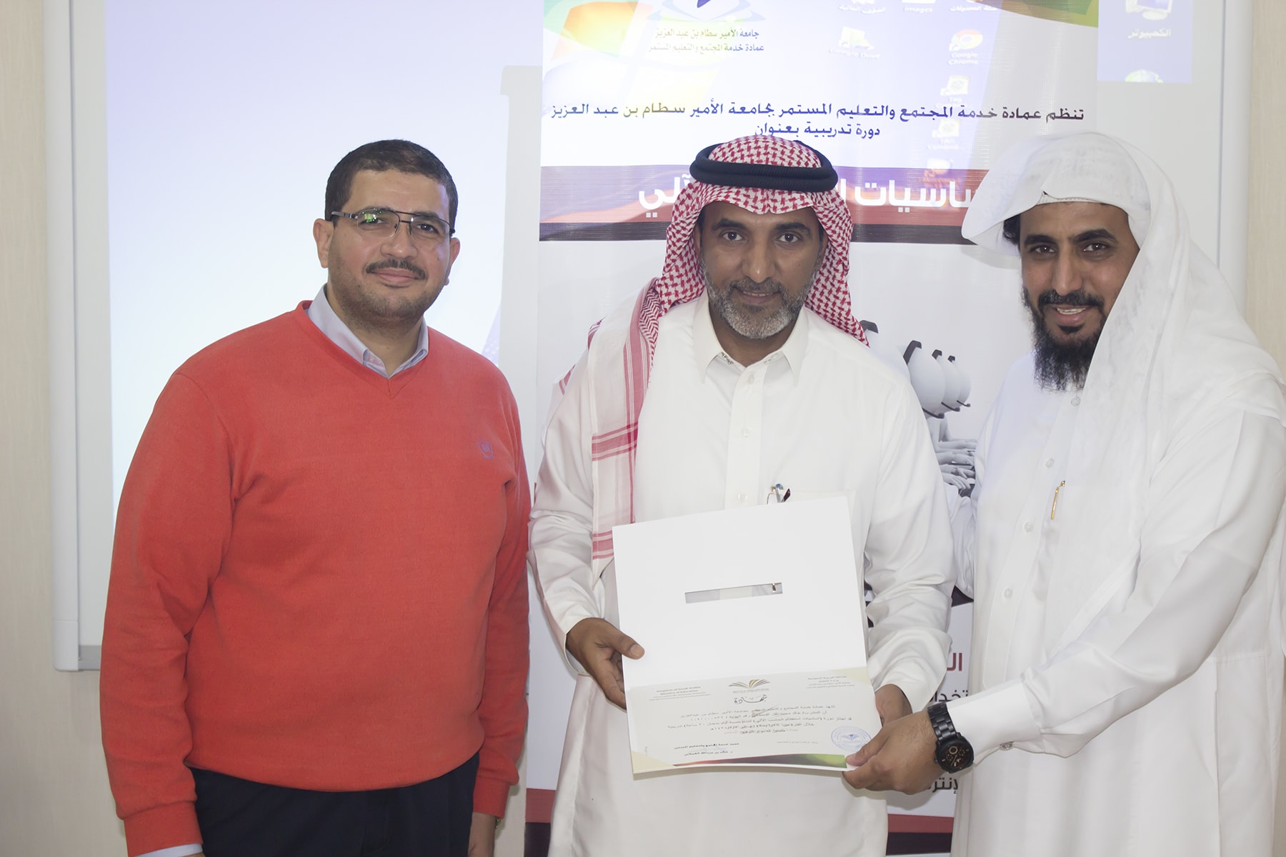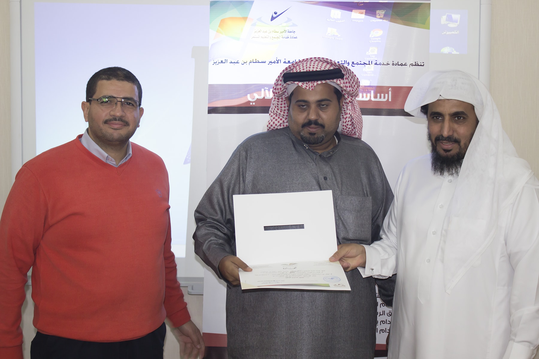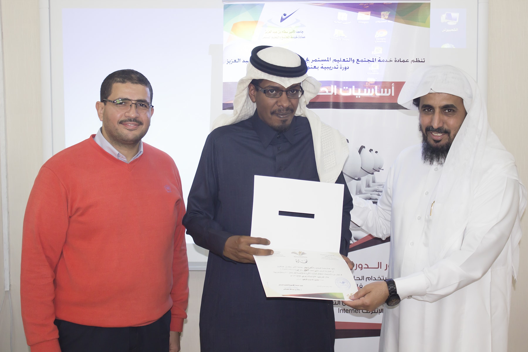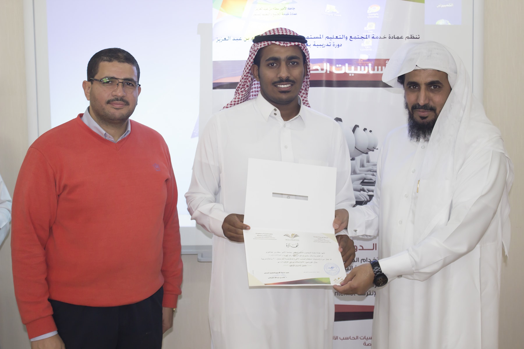 وفي ختام البرنامج سلم وكيل العمادة الدكتور عبدالله بن محمد السبيعي ، شهادات الحضور على المتدربين ، وشكر لهم حسن تفاعلهم مع المدرب ، كما حرّص على ضرورة تعبئة استمارة التقييم التي تساهم في تحسين و تطوير الأداء و نوعية البرامج التي تقدمها العمادة .