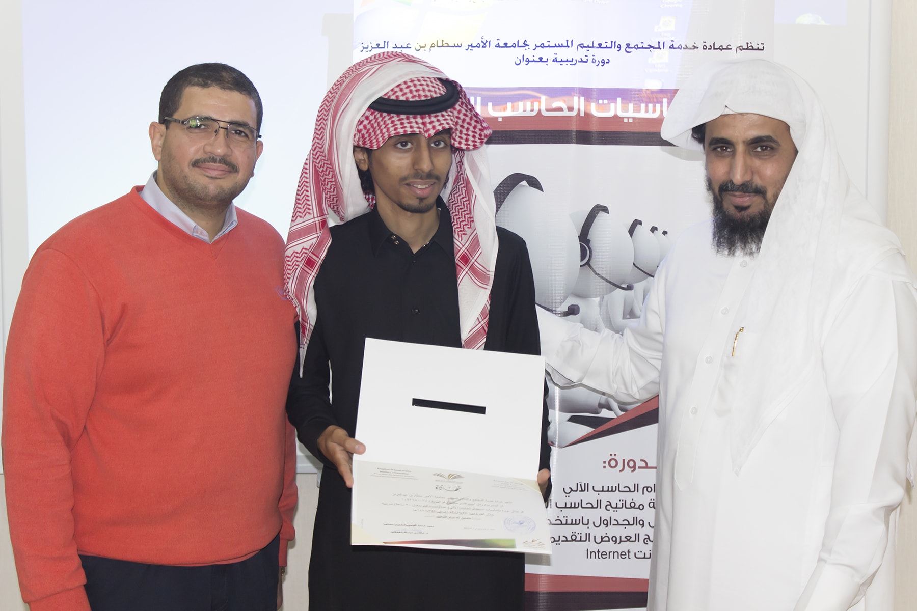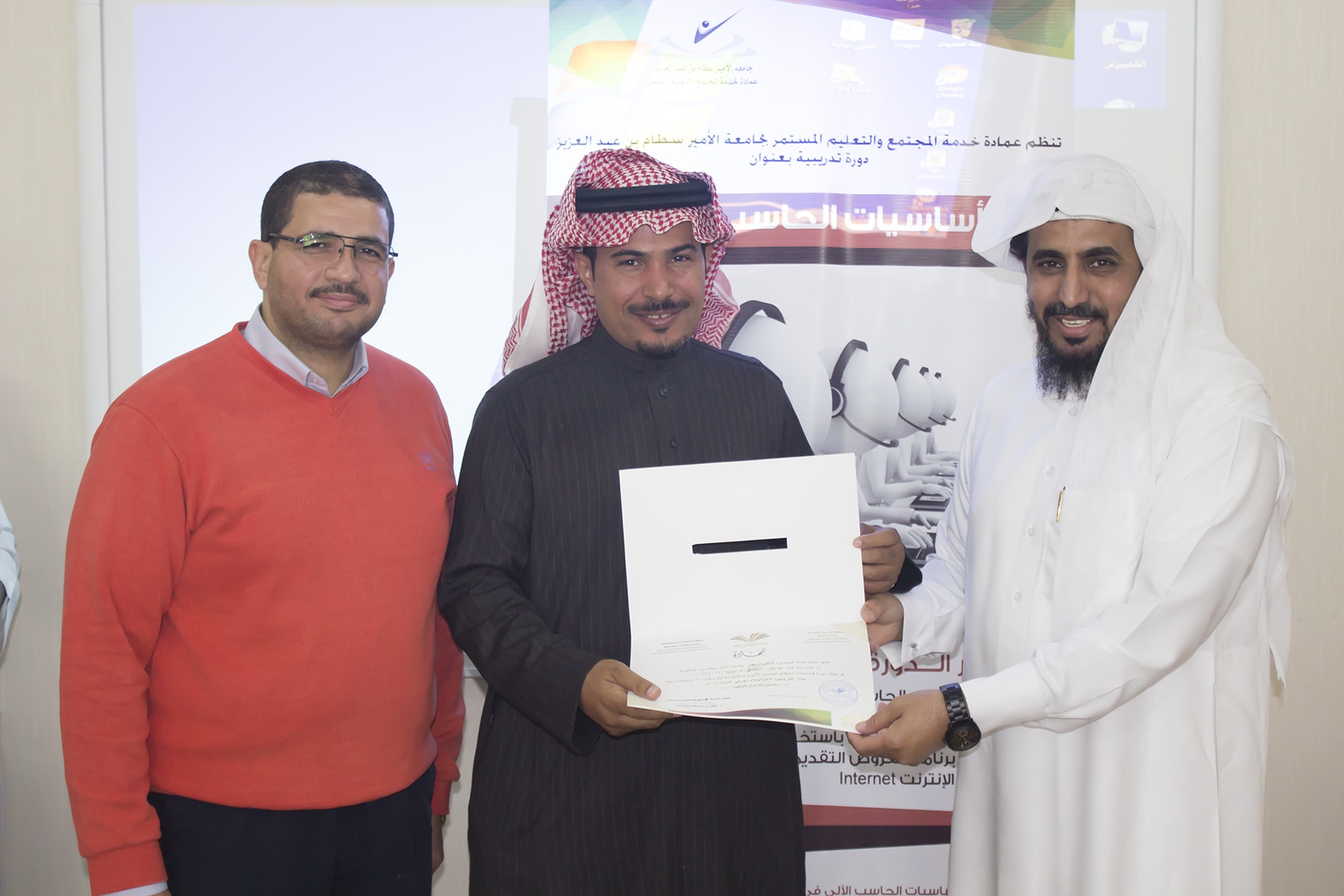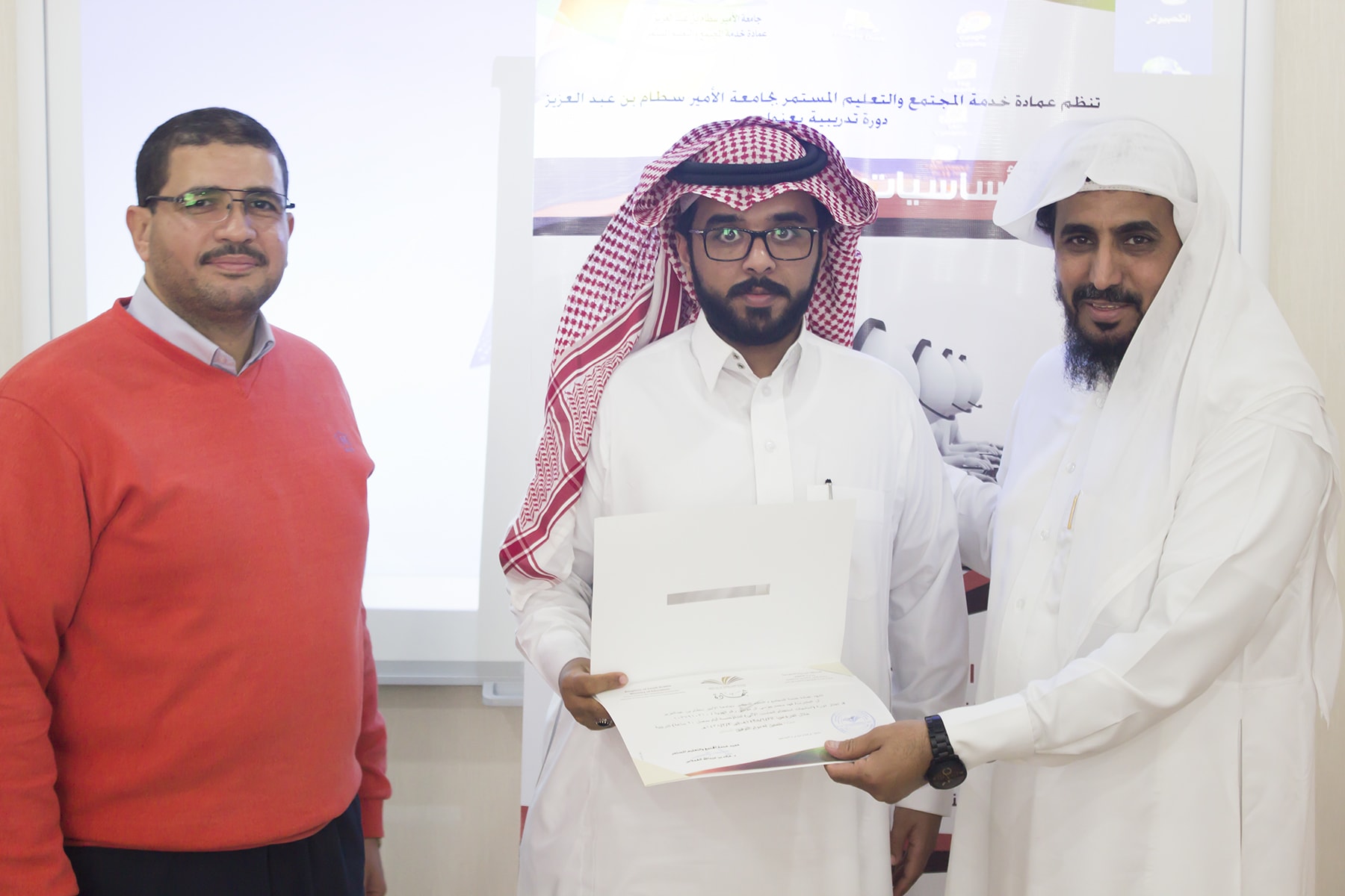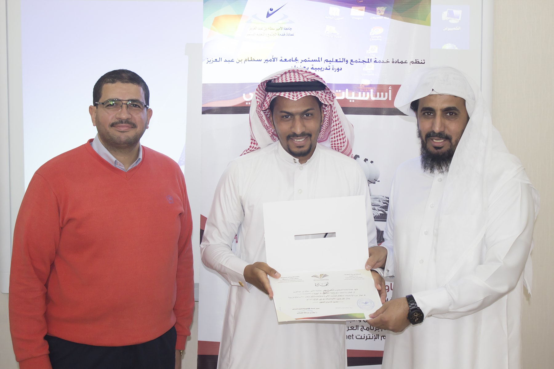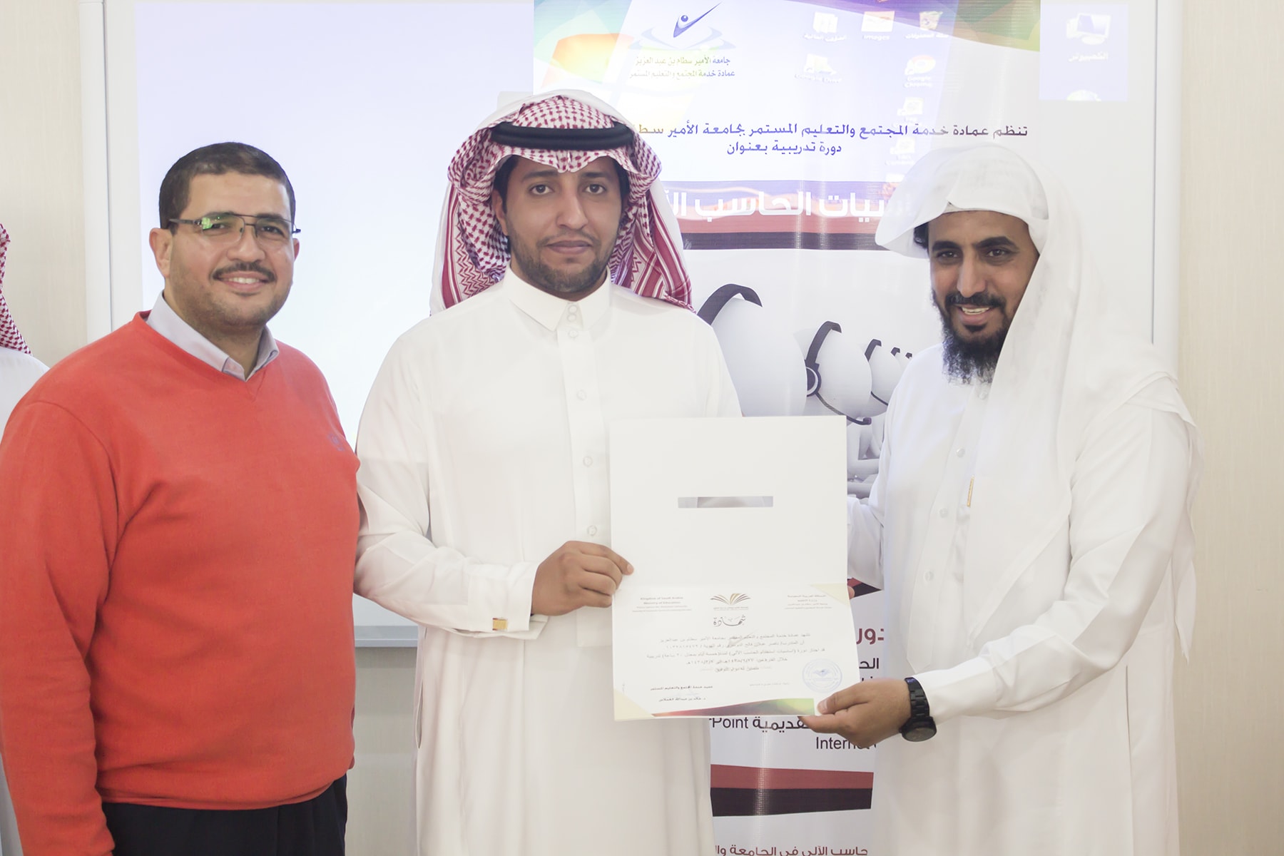 وفي ختام البرنامج سلم وكيل العمادة الدكتور عبدالله بن محمد السبيعي ، شهادات الحضور على المتدربين ، وشكر لهم حسن تفاعلهم مع المدرب ، كما حرّص على ضرورة تعبئة استمارة التقييم التي تساهم في تحسين و تطوير الأداء و نوعية البرامج التي تقدمها العمادة .