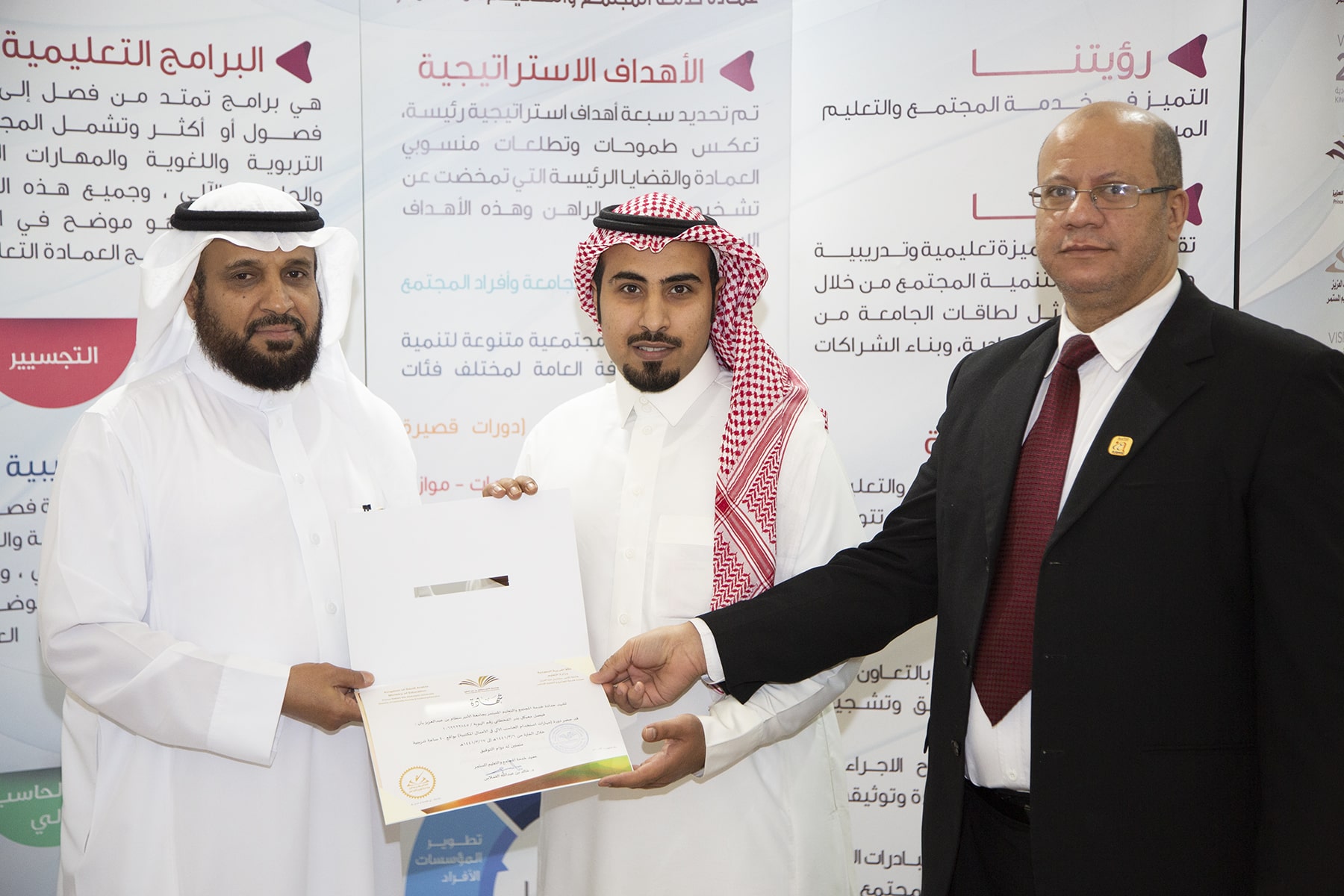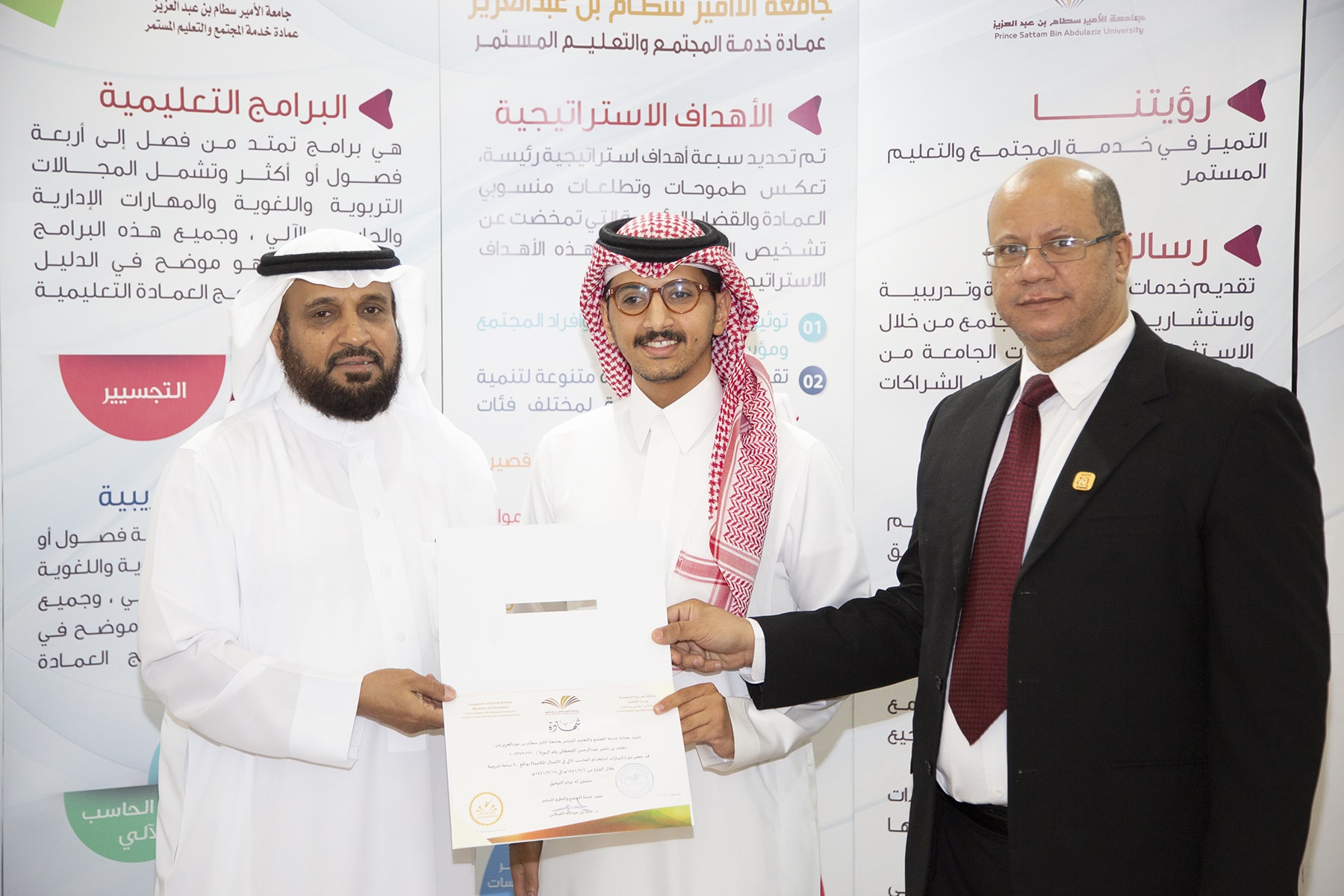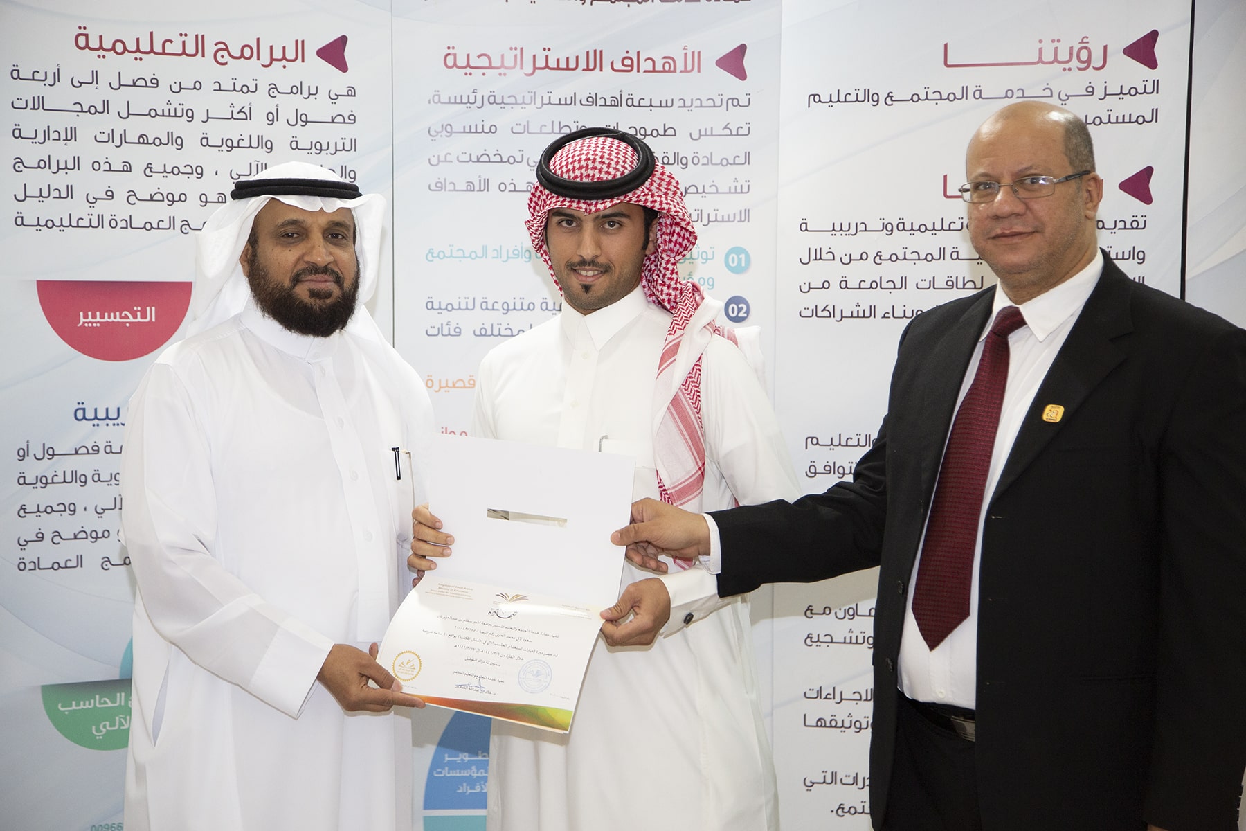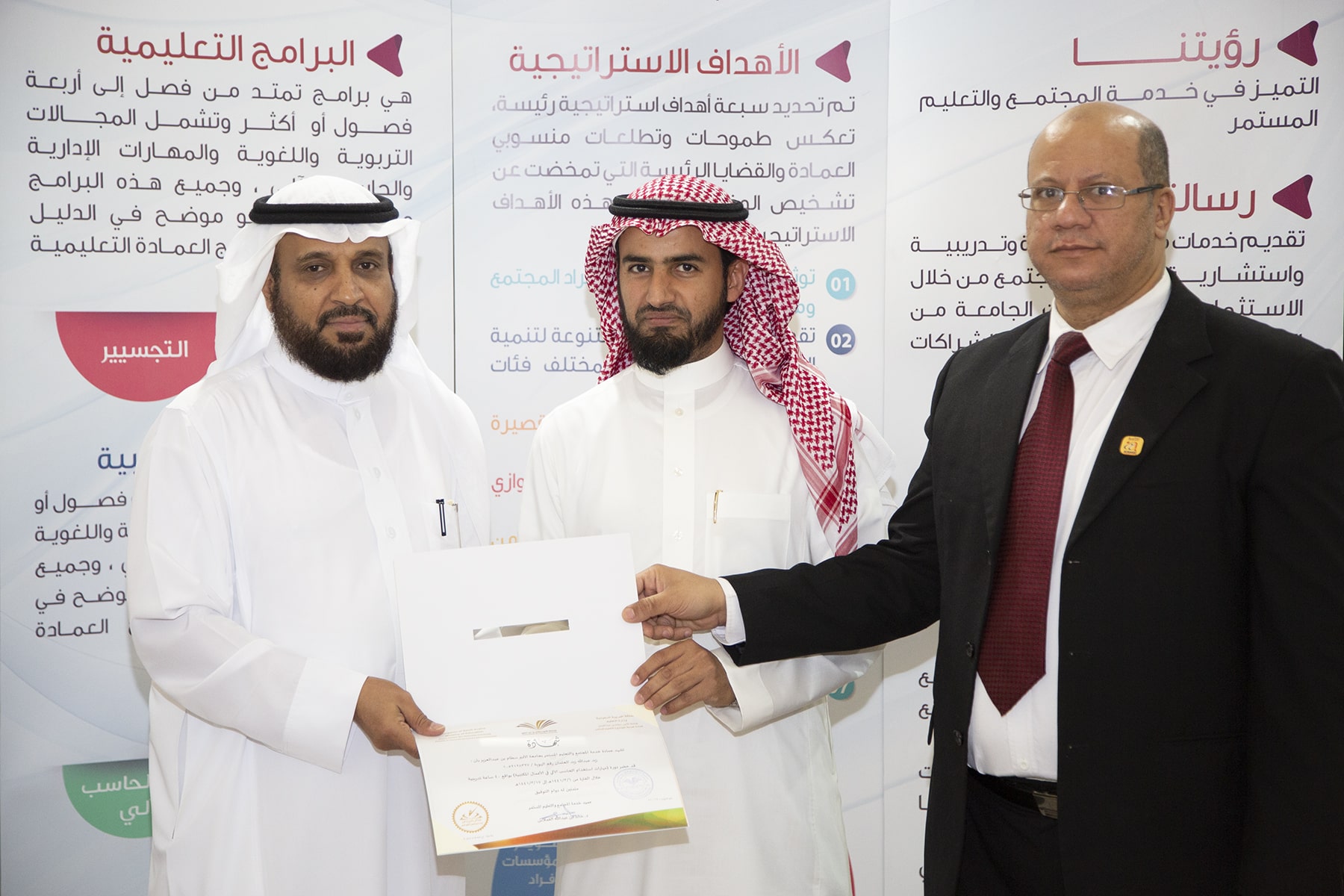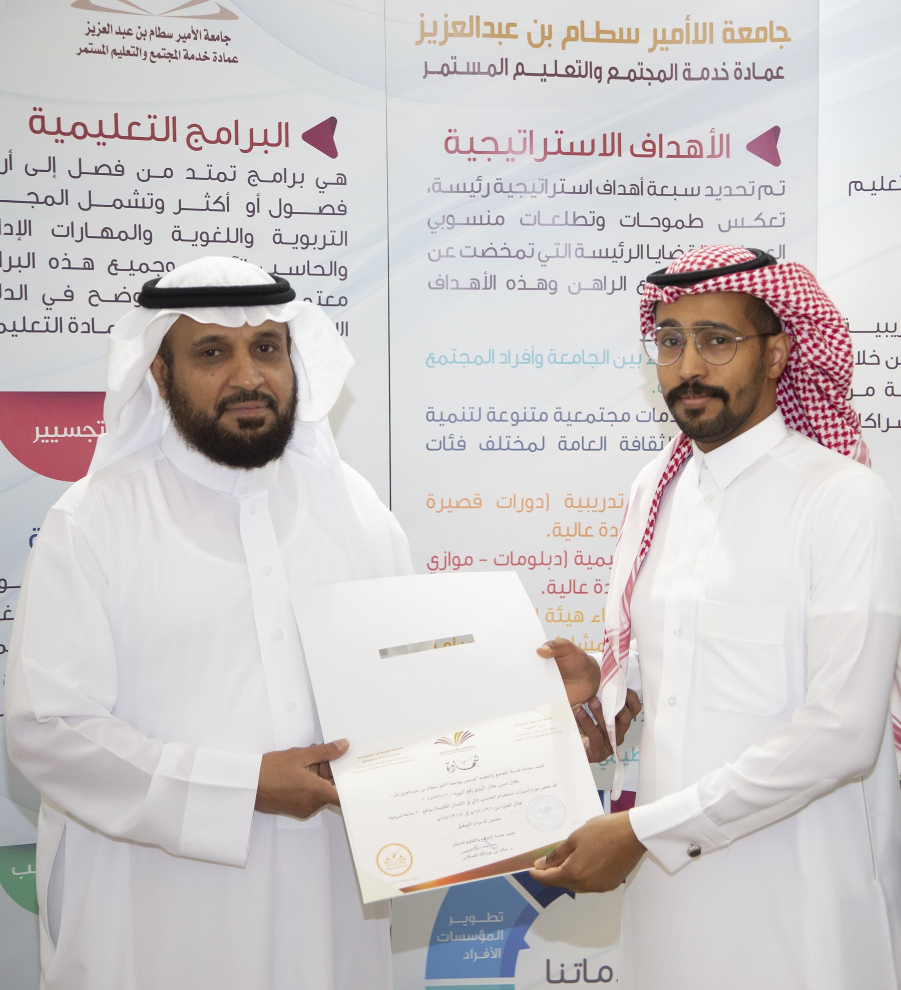 وفي ختام الدورة تسلم المتدربون الشهادات وسلمها نيابة عن عميد العمادة الدكتور خالد الغملاس مدير إدارة العمادة الأستاذ محمد الشميمري .