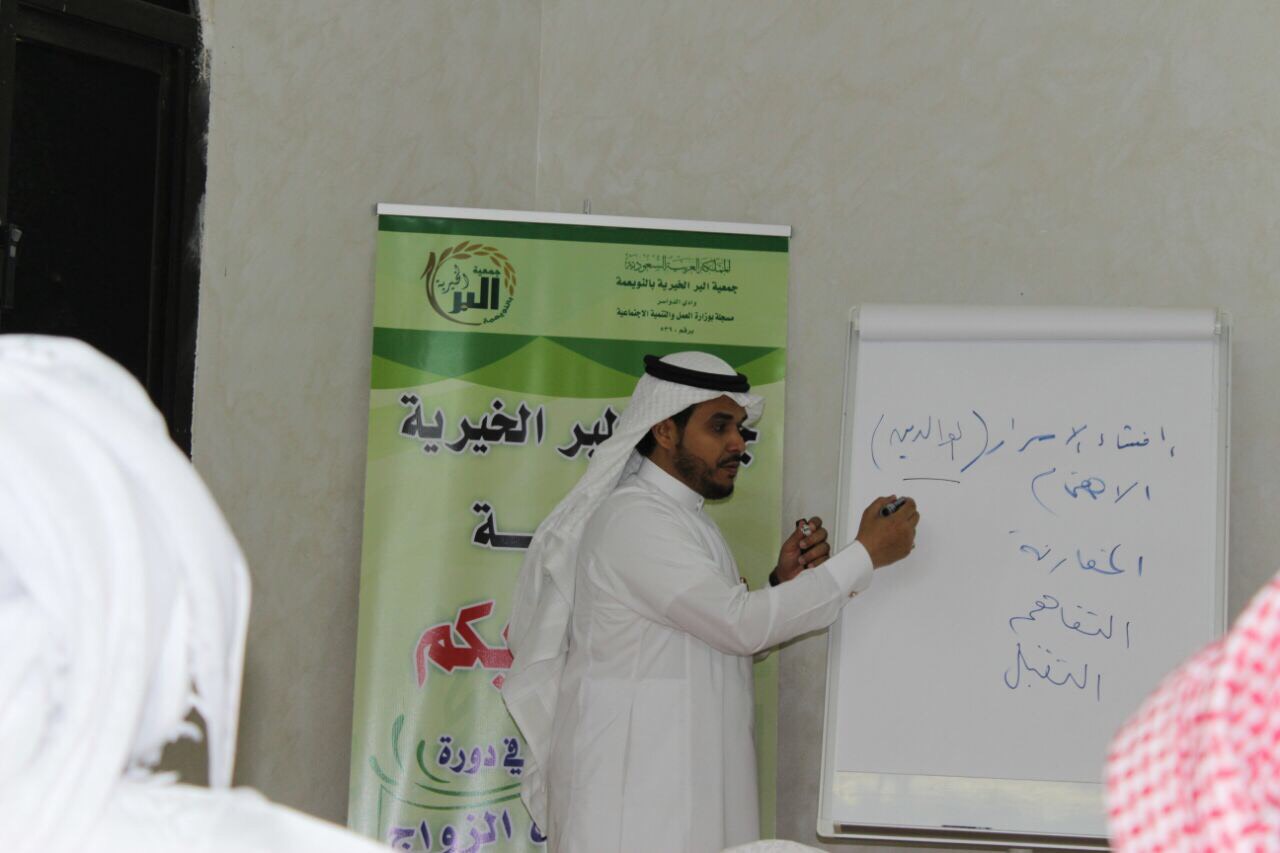 قامت وكالة عمادة خدمة المجتمع والتعليم المستمر بوادي الدواسر بالتعاون مع جمعية البر بالنويعمة دورة تدريبية لتأهيل المقبلين على الزواج قدمها كل من سعادة الدكتور خالد بن مطر السهلي والأستاذ سعد بن عبدالله آل غلفيص على مدى ثلاثة أيام
