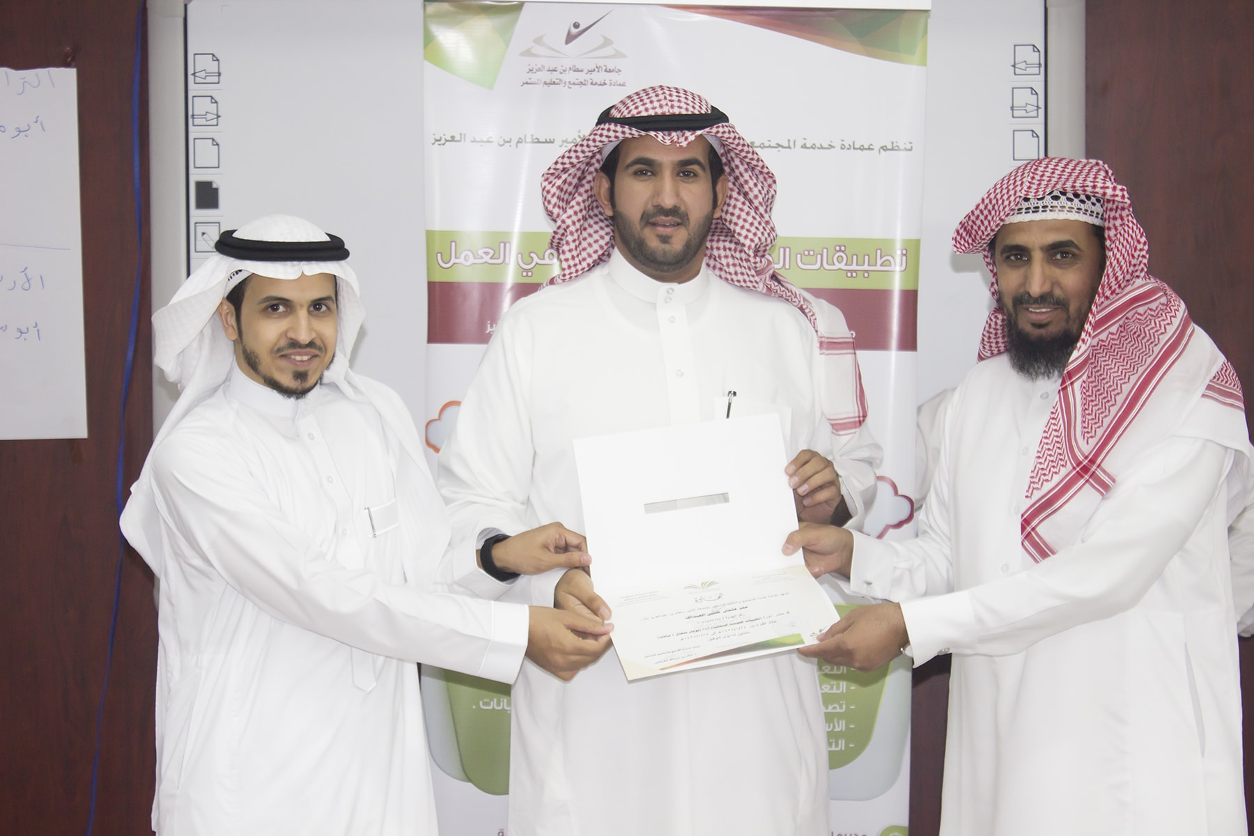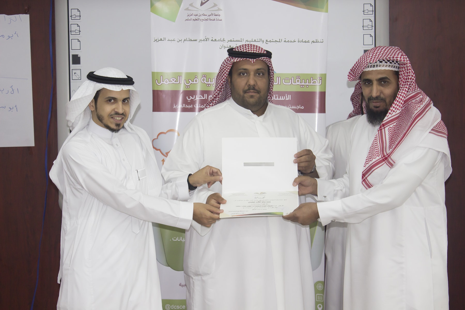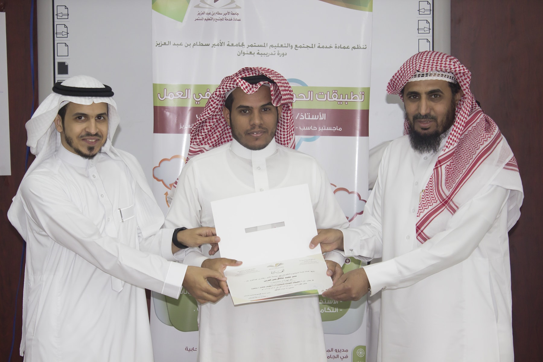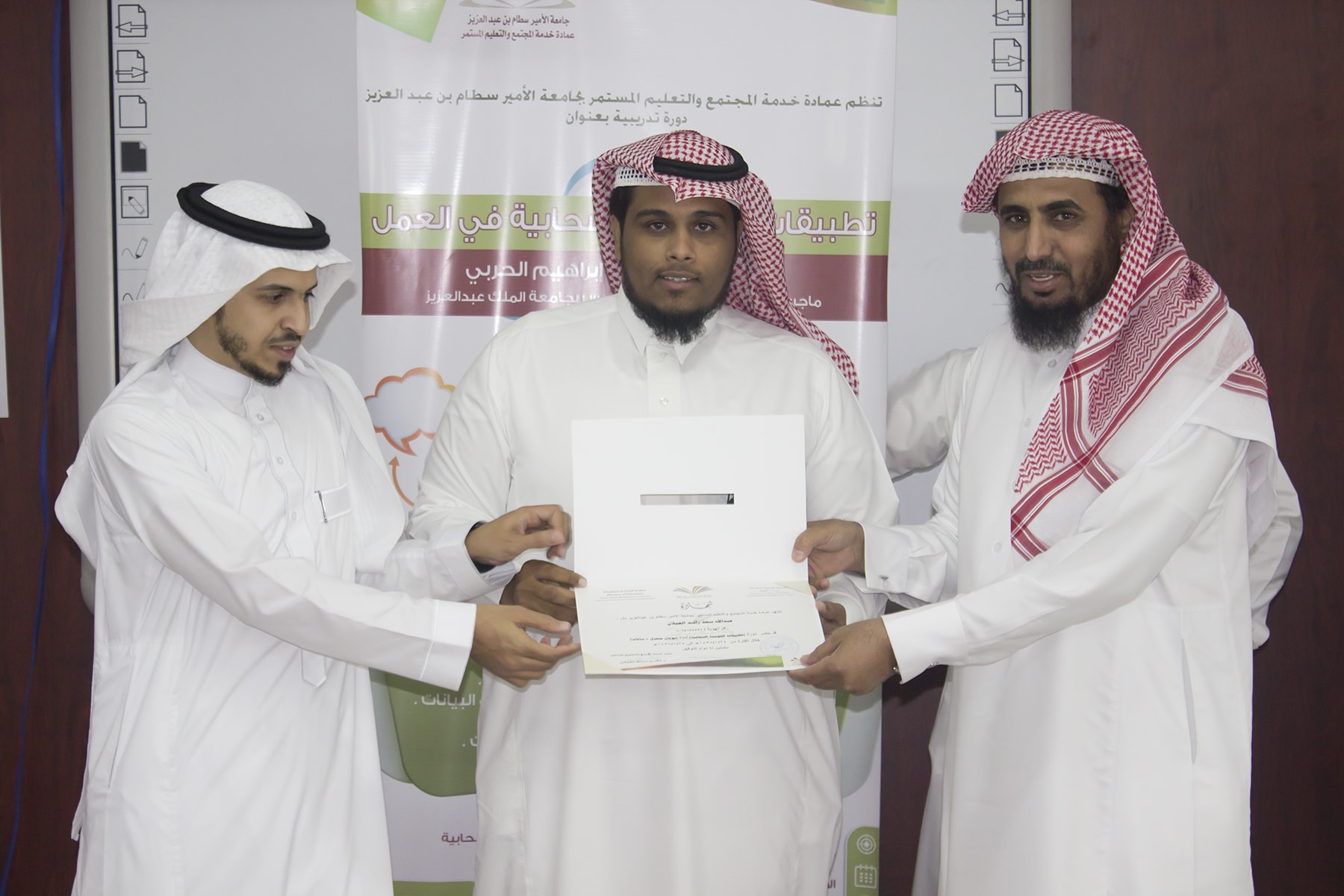 وفي ختام البرنامج قدم وكيل عمادة خدمة المجتمع و التعليم المستمر الدكتور عبدالله السبيعي شهادات الحضور على المتدربين .