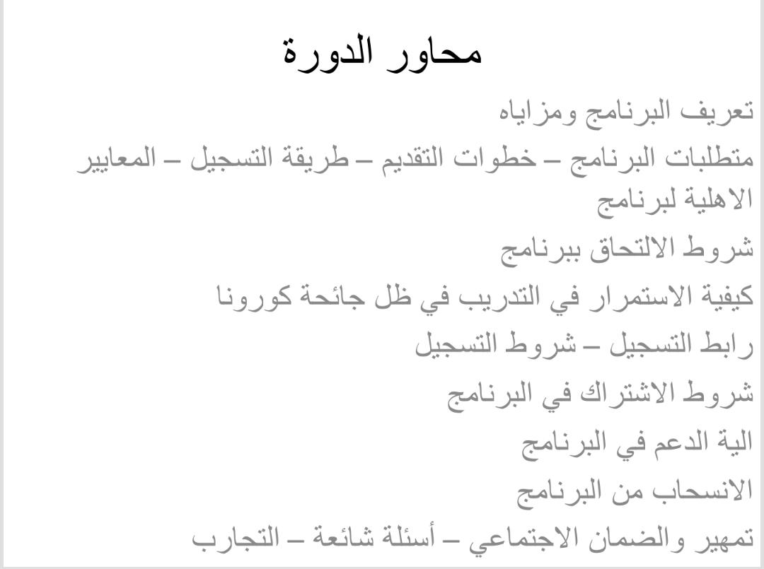 وتهدف هذه الورشة إلى التعريف بآلية البرنامج، ومزاياه، وتتضمن الإجابة عن جميع الاستفسارات بشأن خطوات التقديم، ومعايير الأهلية للبرنامج، وكيفية الاستمرار في التدريب في ظل جائحة كورونا، ثم تطبيق عملي عن طريقة التسجيل، وشروط الاشتراك وآلية الدعم في البرنامج، والانسحاب منه، واختتمت البرنامج بأسئلة وأجوبة بشأن التدريب على رأس العمل، وعرض بعض التجارب.