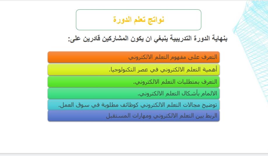 وتهدف الورشة إلى التعرف على مفهوم التعليم الالكتروني ،وأهميته في عصر لتكنولوجيا،ومتطباته، والإلمام بأشكاله ومجالاته في الوظائف المطلوبة في سوق العمل، والربط بينه وبين مهارات المستقبل .