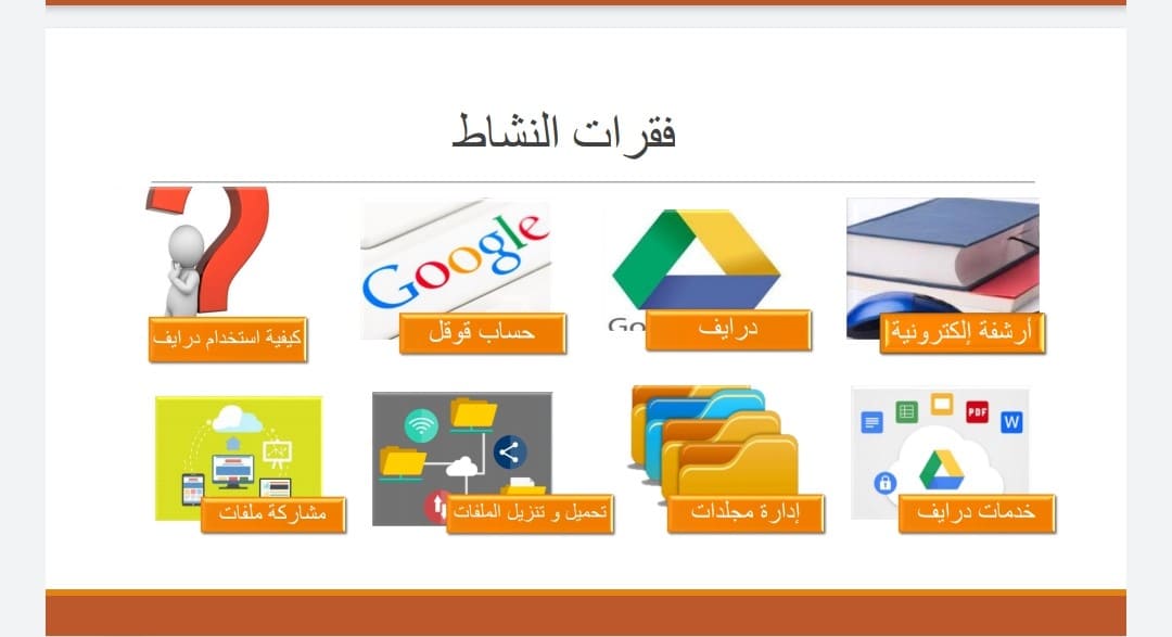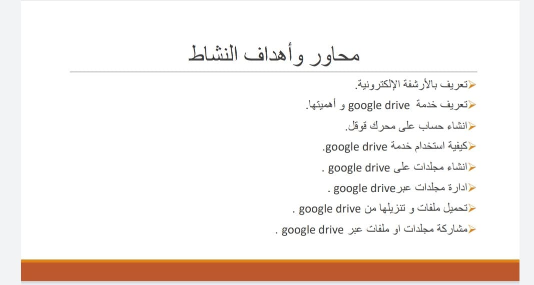 وقد شملت محاور وأهداف الورشة على: تعريف الأرشفة الإلكترونية، والتعريف بخدمة (google drive)، وطريقة إنشاء حساب على محرك (google)، وكيفية استخدام (google drive) وطريقة إنشاء مجلدات عليه، وإدارتها وتحميل الملفات وتنزيلها، ومشاركة المجلدات والملفات عن طريقه.