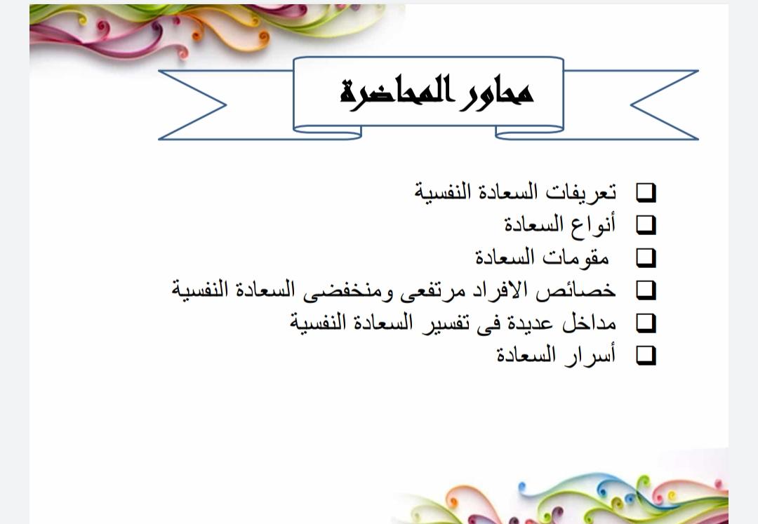 وقد تناولت المحاضرة عدة محاور من أهمها : تعريفات السعادة النفسية حيث تعتبر متطلب ورغبة أساسية يبحث عنها المجتمع، وأنواع السعادة، ومقوماتها، ثم انتقلت إلى مداخل عديدة في تفسير السعادة النفسية، وخصائص الأفراد مرتفعي ومنخفضي السعادة النفسية، ومداخل عديدة في تفسير السعادة النفسية واختتمتها بأسرار السعادة متمثلة في الرضا بما قسم الله للفرد، والاستمتاع بأدنى وأبسط تفاصيل الحياة وترك المعتقدات والأفكار السلبية وعدم الغضب.