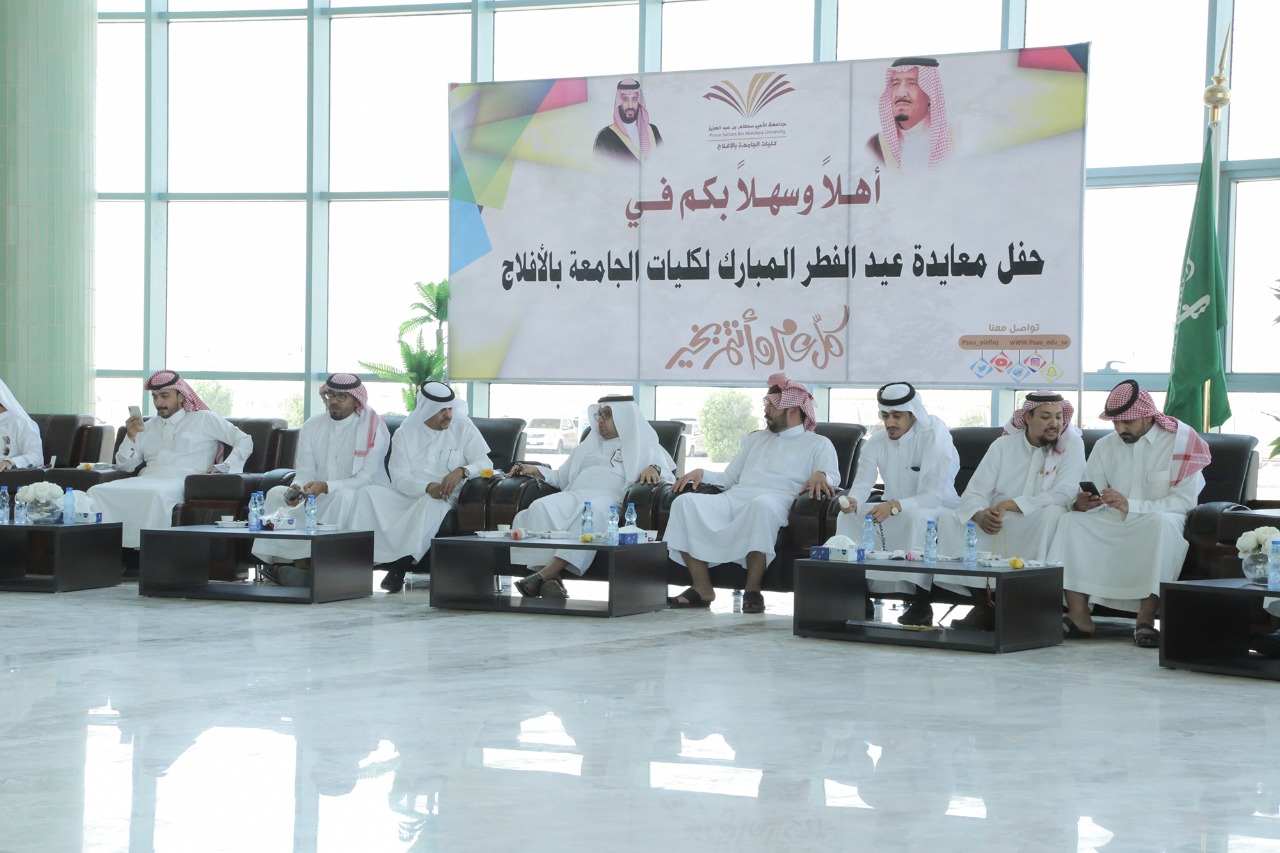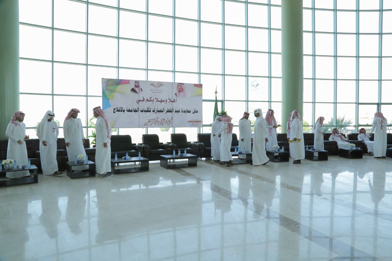 نظمت كليات جامعة الأمير سطام بن عبدالعزيز بالأفلاج يوم الأحد 1440/10/6هـ، حفل معايدة لمنسوبيها بمناسبة عيد الفطر المبارك وذلك بحضور وكيل كلية المجتمع الدكتور لفاي السلمي وعدداً من اعضاء هيئة التدريس والموظفين.