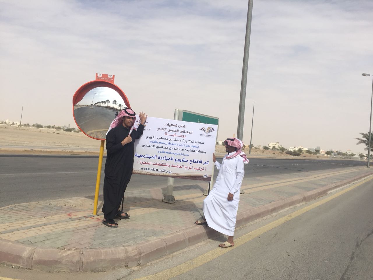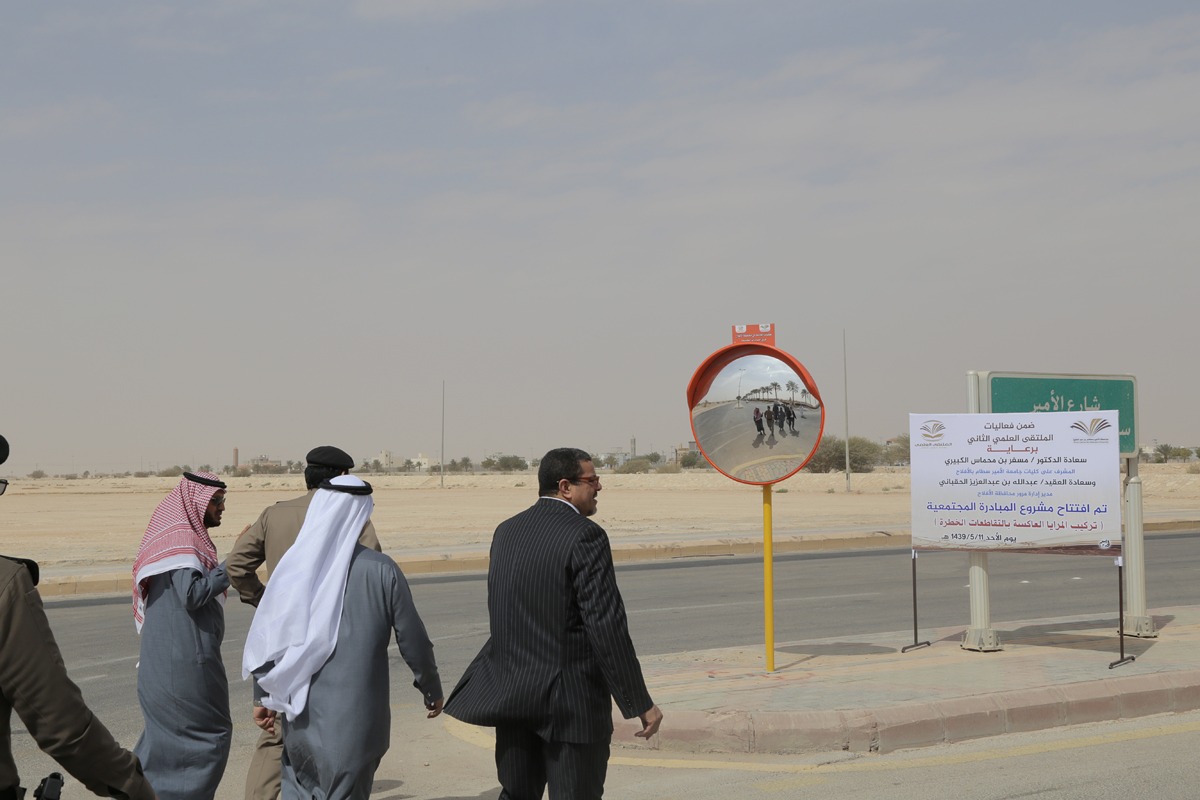 ضمن فعاليات الملتقى العلمي الثاني بكليات الجامعة في محافظة الأفلاج رعي سعادة الدكتور مسفر بن محماس الكبيري حفل تدشين مشروع تركيب مرايا عاكسة ببعض التقاطعات الخطيرة بشوارع مدينة ليلى بمحافظة الأفلاج بهدف الحد من الحوادث المرورية بالتقاطعات الضيقة بأحياء المحافظة وذلك من خلال وضع مرايا عاكسة بتلك التقاطعات ، وحضر تدشين هذه المبادرة مدير شعبة مرور الأفلاج سعادة العقيد عبدالله الحقباني وعدد من رجال المرور في المحافظة، كما حضرحفل التدشين سعادة الدكتور إبراهيم الأسمري وكيل الشؤون التعليمية والأكاديمية والدكتور لافي السلمي رئيس لجنة الملتقى العلمي بكليات الأفلاج .