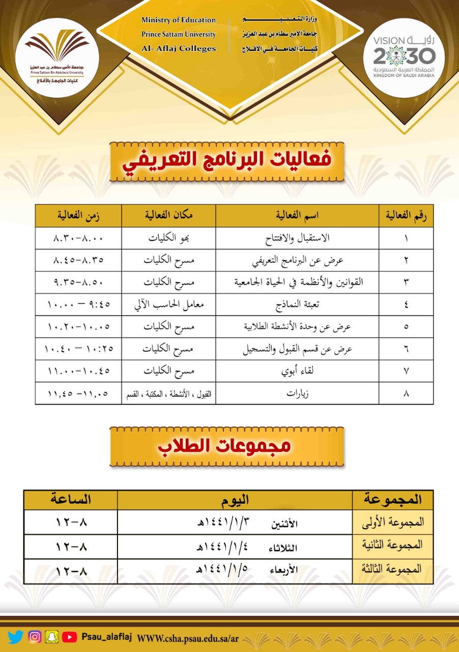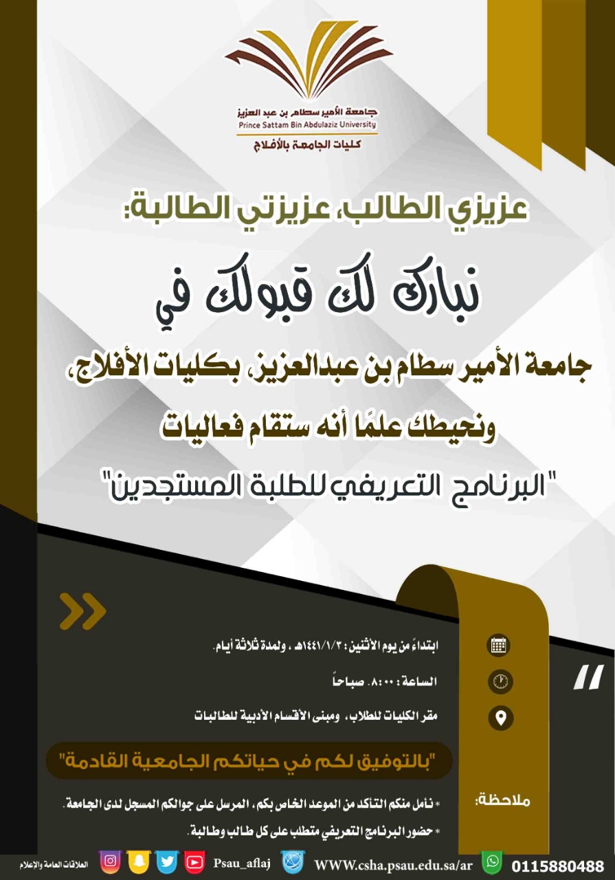 أنهت كليات جامعة الأمير سطام بن عبدالعزيز في الأفلاج، إعداد برنامج تعريفي لاستقبال 560 طالباً وطالبة قبلوا هذا العام.