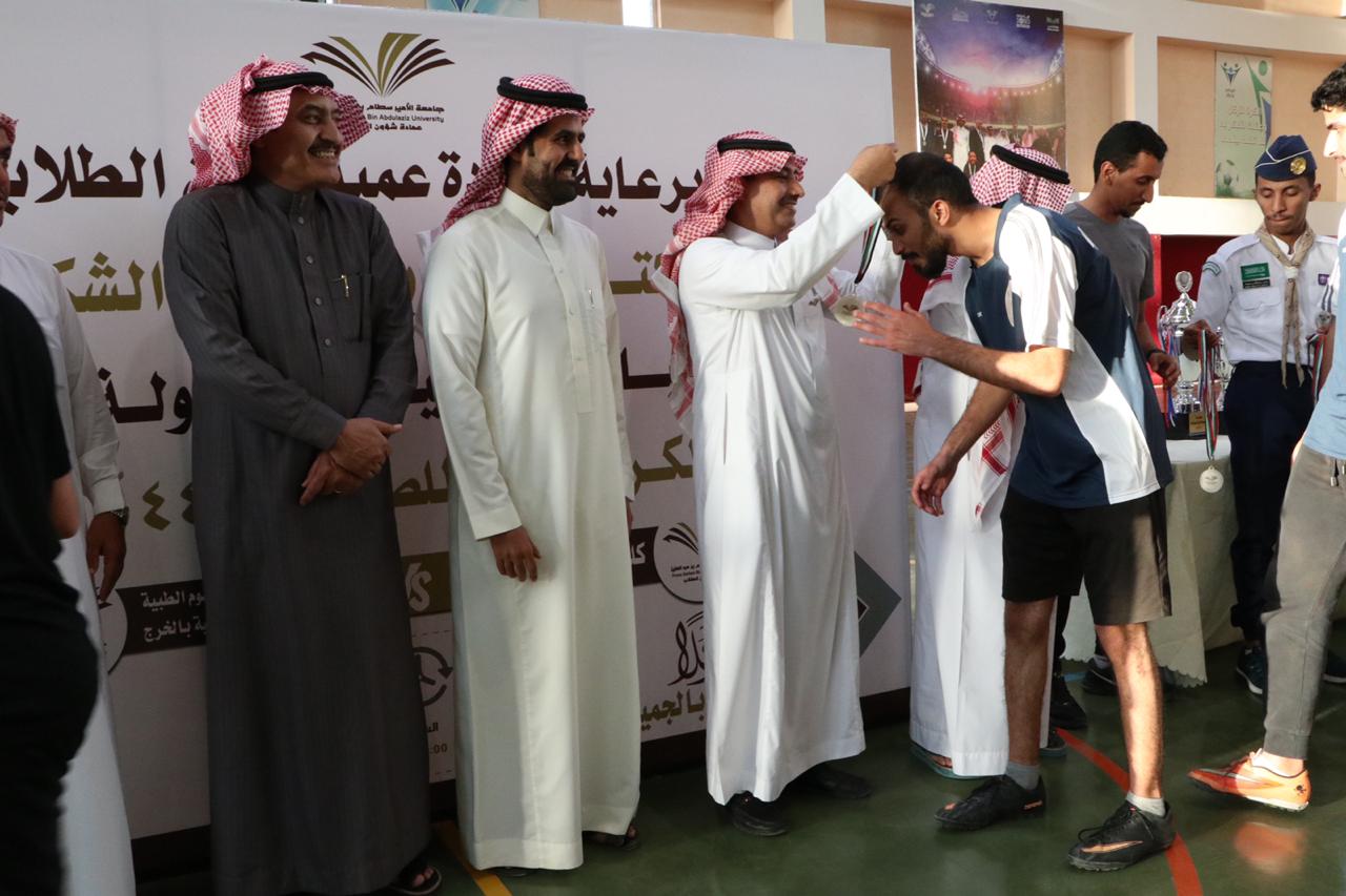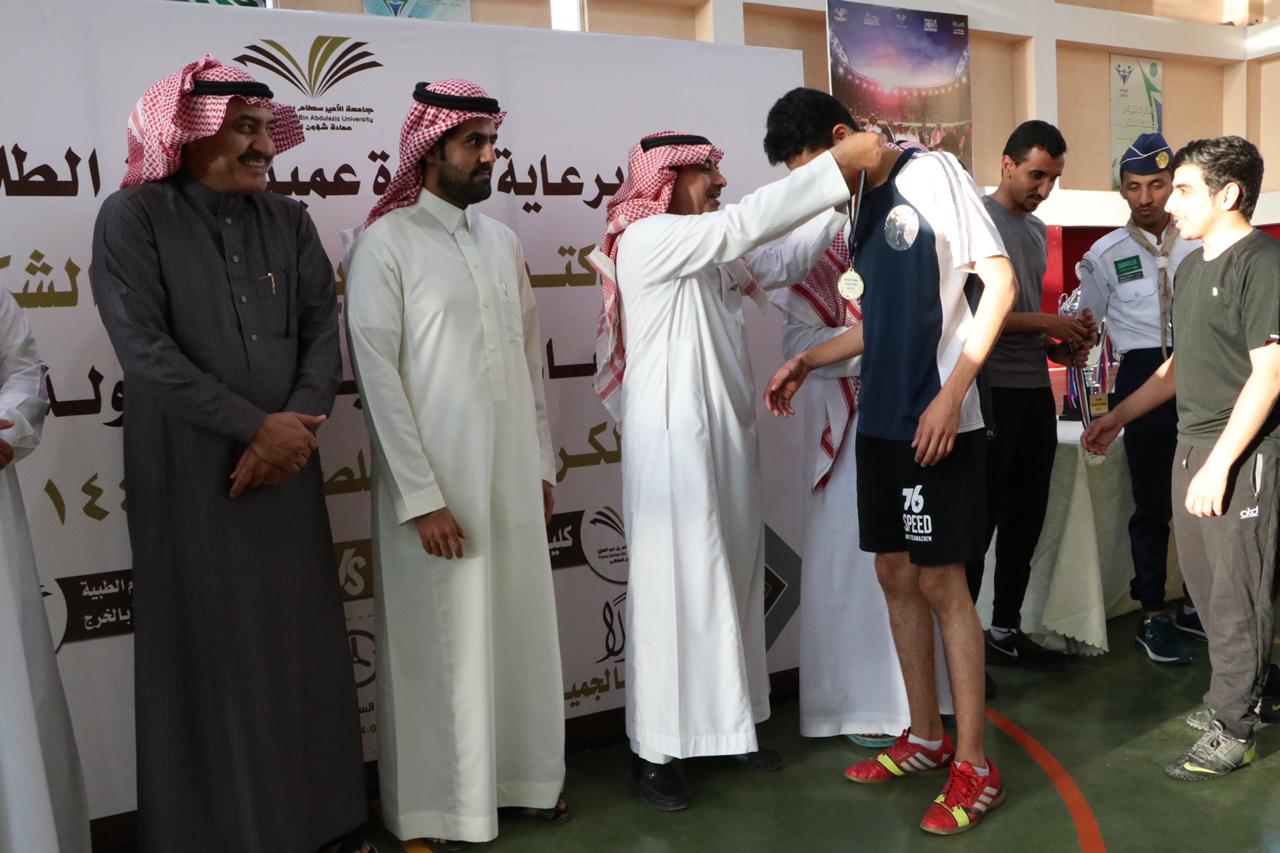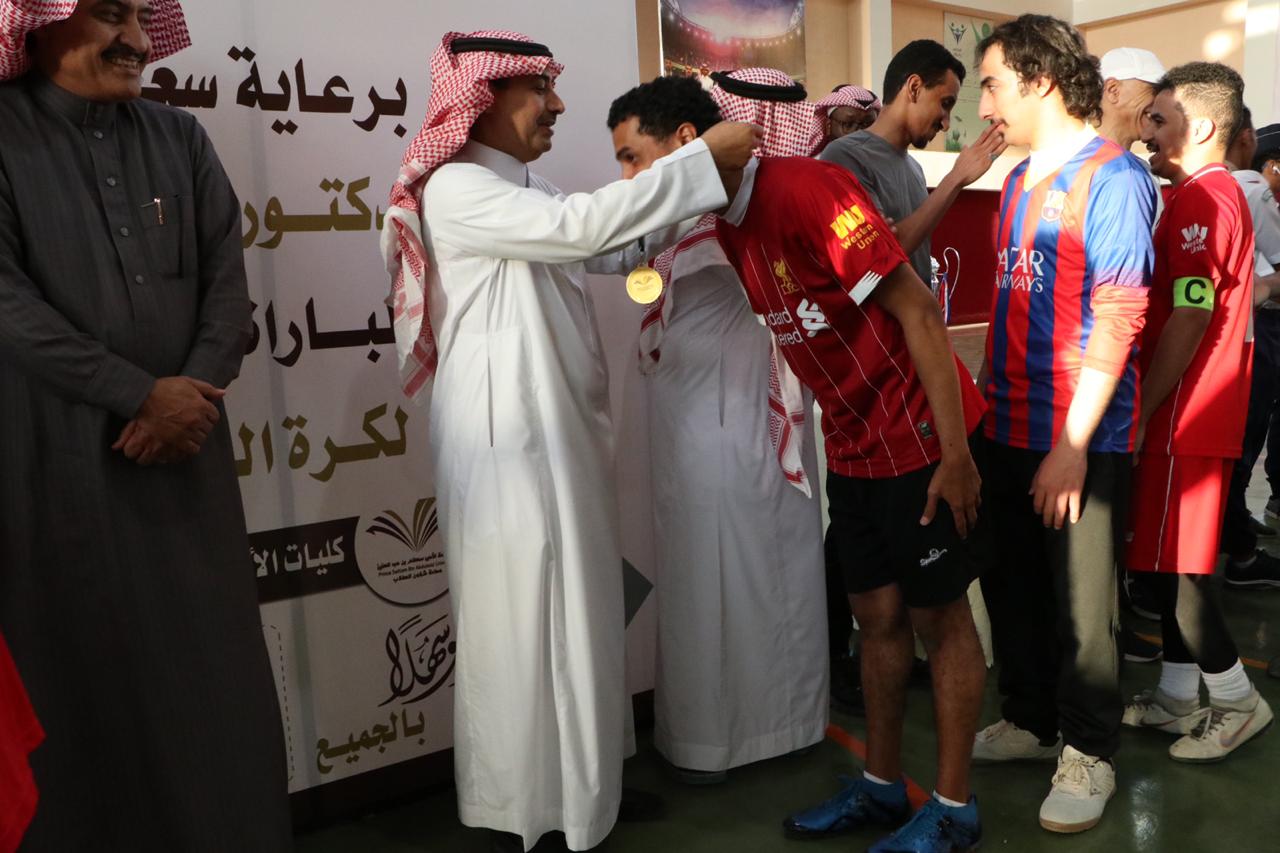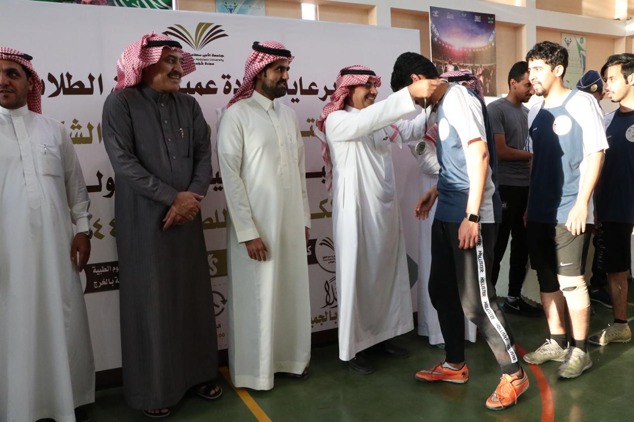 توج عميد شؤون الطلاب الدكتور ثلاب بن عبدالله الشكرة فريق كليات الأفلاج بلقب بطولة الجامعة لكرة القدم للصالات وذلك بعد فوزه على فريق كلية العلوم الطبية التطبيقية بنتيجة 10 - 5, في المباراة النهائية للبطولة التي أقيمت عصر يوم الاثنين 30/ 6 /1441هـ بالصالة الرياضية بثانوية الهياثم.