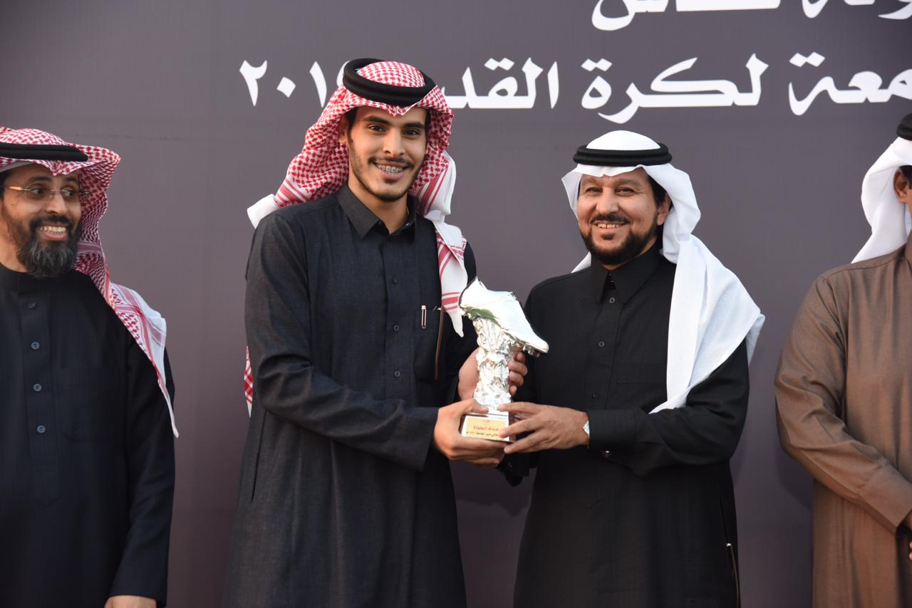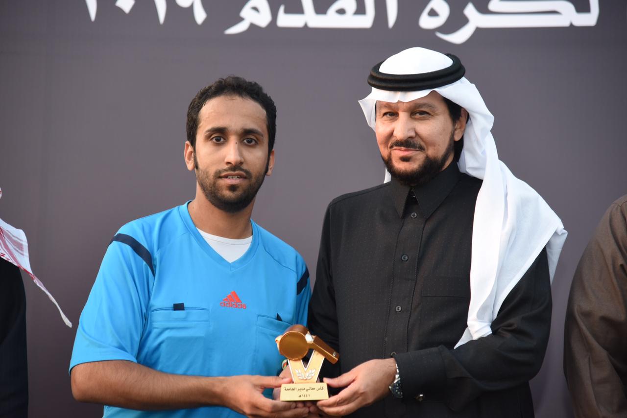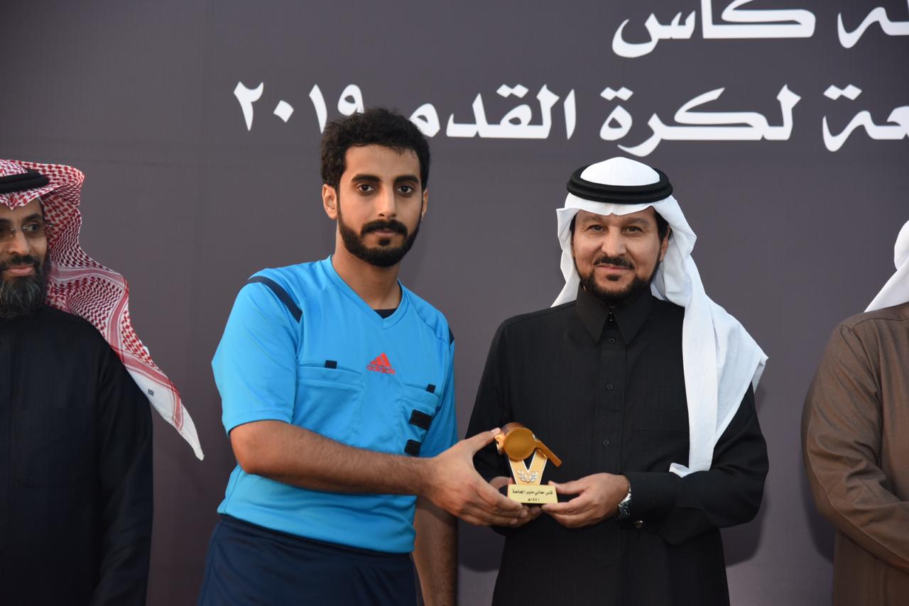 وبعد ذلك تفضل معالي مدير الجامعة لتكريم الطاقم التحكيمي للبطولة وتكريم الشريك الإستراتيجي شركة الكهرباء بالخرج لاستضافتها نهائي البطولة , كما كرم اللاعبين المميزين في البطولة حيث حقق لقب أفضل لاعب الطالب محمد الجويعدة من كليات الأفلاج, وافضل حارس زيد زوبع من كلية إدارة الأعمال بحوطة بني تميم , كما حقق لقب هداف البطولة الطالب مشعل العاصمي من كلية التربية بالخرج.