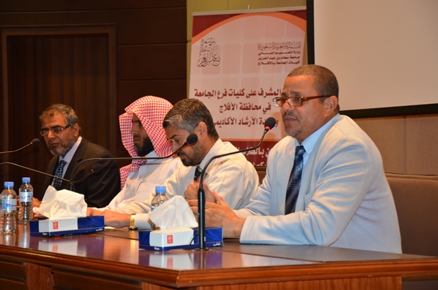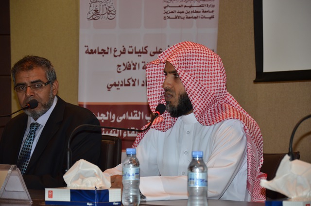 من جانبه رحب المشرف على كليات الجامعة بالأفلاج بالطلاب الجدد وبين لهم أهمية ما هم فيه من طلب للعلم مما يستوجب التحلي بأخلاق طالب العلم وآدابه في ظل مناخ مهيأ وممهد من قبل حكومة خادم الحرمين الشريفين حفظه الله، كما حث الطلاب على الجد والمثابرة وطلب العلم بنية صادقة وإخلاص حتى يكون نموذجًا نافعاً لدينهم ووطنهم , وشدد على أن كل مرافق الفرع ومنسوبيه في خدمة الطالب .