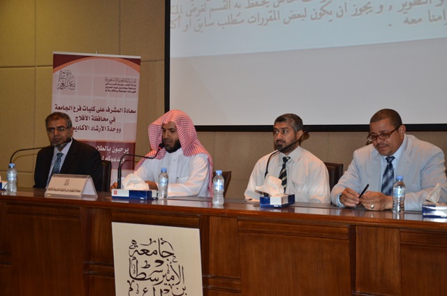 التقى المشرف على كليات الجامعة بالأفلاج الدكتور راشد بن محسن آل لحيان الطلاب الجدد؛ حيث تناول اللقاء عدة محاور تخص الإرشاد الأكاديمي والعملية التعليمية، فقد بدأ اللقاء بعرض مرئيّ قدمه الدكتور منصور فتحي المشرف على الإرشاد الأكاديمي بالفرع تناول فيه تعريفًا عامًّا عن الجامعة وكليات الفرع وأبرز الوحدات والمرافق التي تخدم الطالب، كما تطرق إلى ضرورة تفعيل كل طالب لموقعة الشخصي والاستفادة من الخدمات الطلابية على موقع الجامعة فمن خلالها يمكن للطالب أن يعرف ما يغني عن كثير من الأسئلة التي تدور في رأسه، ثم تناول قواعد النظام الأكاديمي، وأبرز المصلحات والضوابط في العملية التعليمية.
