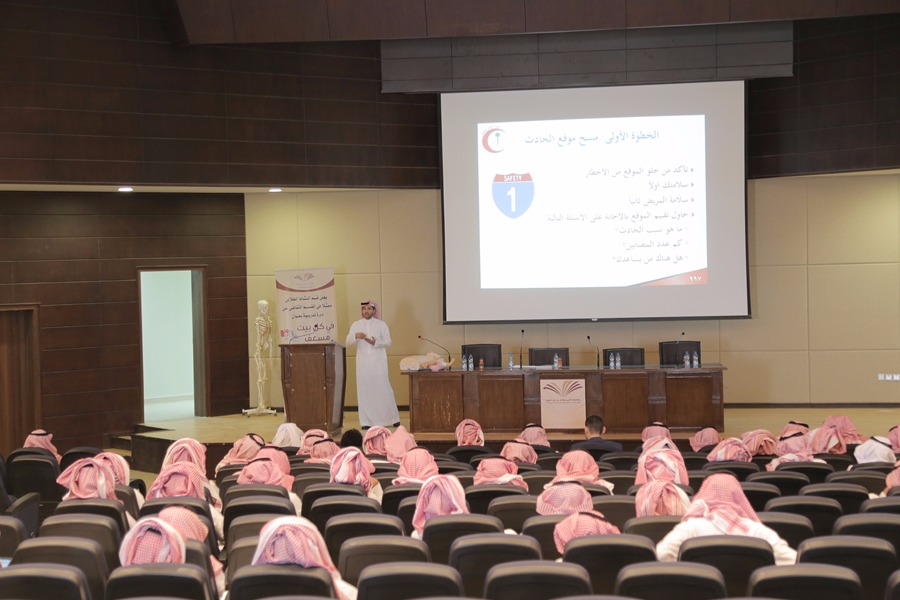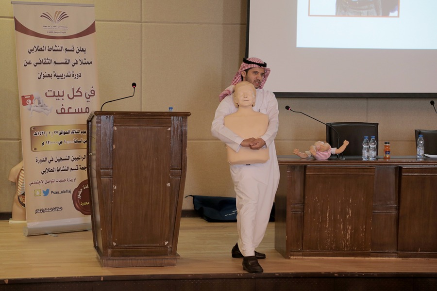 وتضمنت دورة " في كل بيت مسعف " التي أقامتها كليات الجامعة بالأفلاج لطلابها وقدمها الأستاذ يوسف الشريف المدرب في برنامج الأمير نايف كيفية التعامل مع الحالات الطارئة في المنزل والطريقة الصحيحة للتعامل مع بعض المصابين ، كذلك تدريب الطلاب على بعض إجراءات الإسعافات لإنقاذ حياة المصابين ومعرفة وخطوات التعامل مع المصابين ، كما قدم المدرب شرح عن ما تقوم به هيئة الهلال الأحمر