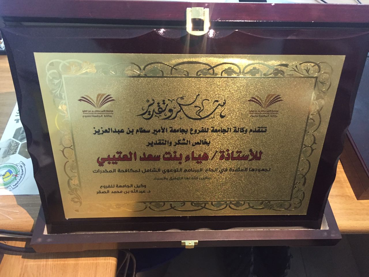 كما أقيم في اليوم التالي البرنامج بكلية التربية للاستاذة فوزية الشهري أوضحت فيها أن المخدرات أصبحت تشكل كابوساً حقيقيا لكل أبناء المجتمع وهذه الآفة الخطيرة والقاتلة بدأت تنتشر في الأونة الأخيرة في كافة المجتمعات بشكل لم يسبق له مثيل ، حتى أصبحت خطراً يهدد البشرية برمتها وقد تخلل البرنامج عرض مرئي وافتتاح المعرض . وفي ختام البرنامج قدمت دروع تذكارية للمحاضرات بالبرنامج من وكالة الجامعة الفروع .