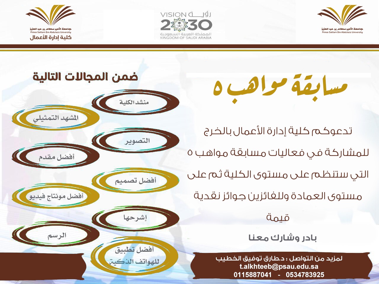 ويجدر الإشارة إلى أن مسابقة مواهب هي إحدى المسابقات التي تنظم سنويا على مستوى الجامعة والتي تهدف إلى إبراز وصقل مواهب الطلاب في مختلف المجالات، وهي تتضمن تسعة محاور رئيسية وهي أفضل مقدم، ومحور اشرحها، ومنشد الجامعة، والمشهد التمثيلي، والرسم والتصوير، وأفضل تصميم، وأفضل مونتاج، وأفضل تطبيق للهواتف الذكية، علما بأن المسابقة سيتم تنظيمها أولا على مستوى الكلية، ومن ثم سيتم إختيار الفائزين بالمراكز الاولى ليمثلوا الكلية في مسابقة الجامعة.