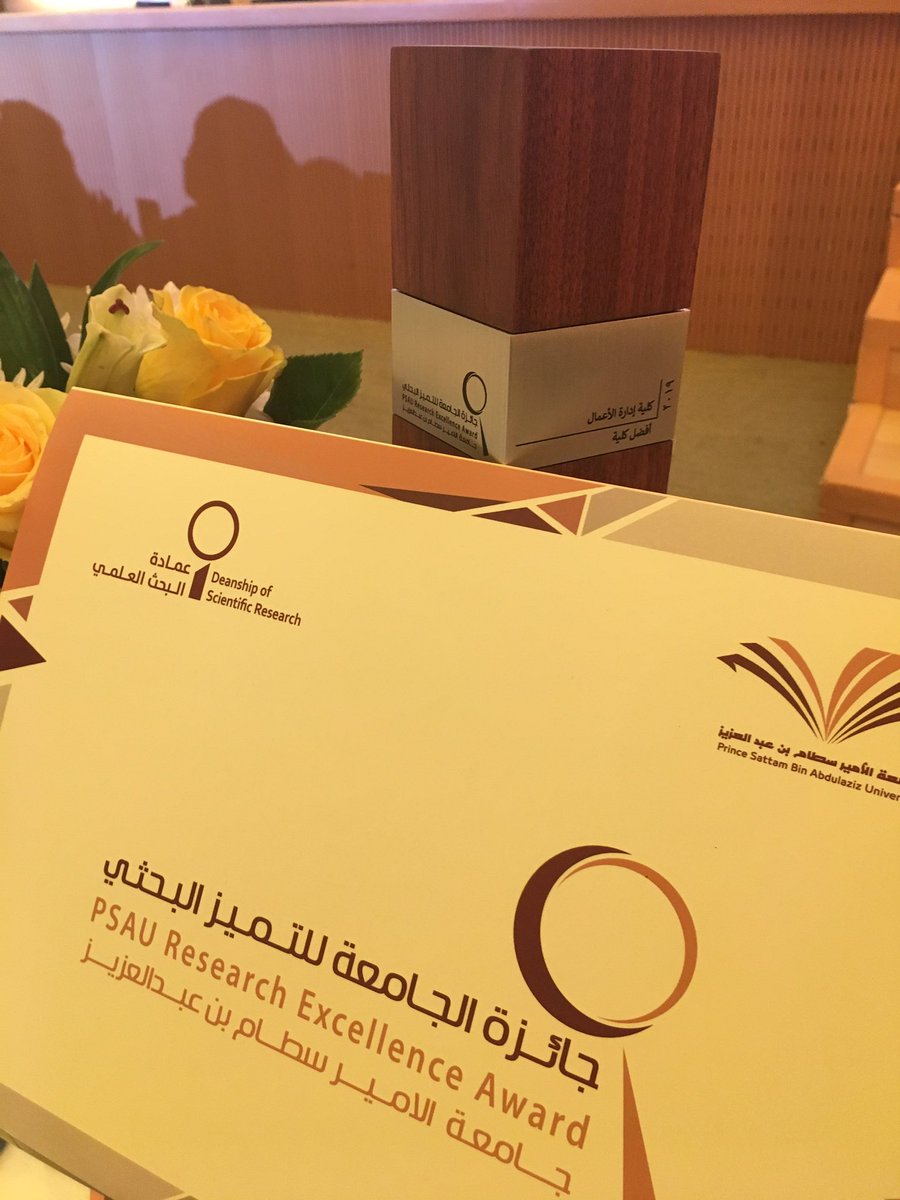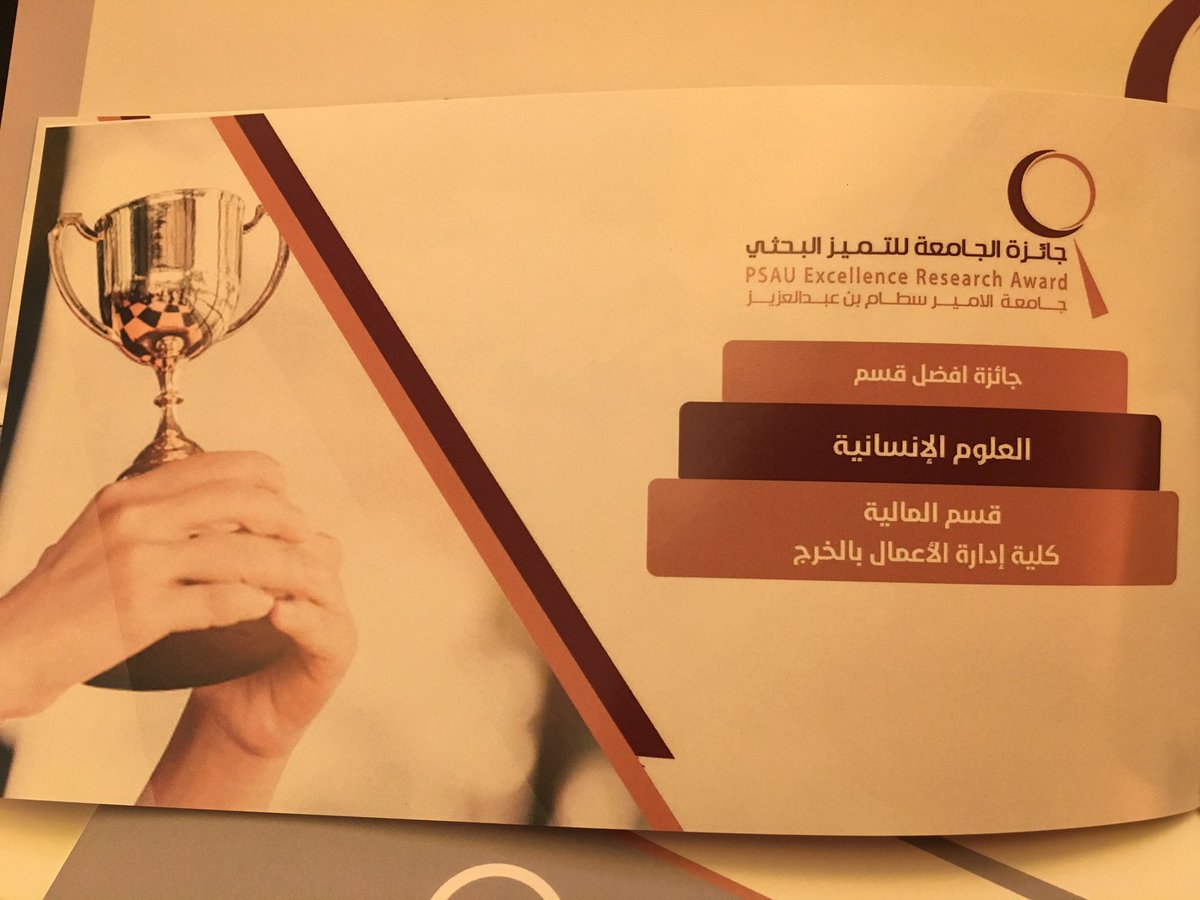 تحت رعاية معالي مدير جامعة الأمير سطام بن عبدالعزيز الأستاذ الدكتور/ عبدالعزيز بن عبدالله الحامد أقامت عمادة البحث العلمي الحفل الختامي لجائزة التميز البحثي يوم الإثنين 3/8/1440هـ الموافق 8/4/2019م وقد حصلت الكلية على المراكز الأولى للجائزة, حيث حصلت الكلية على المركز الأول في جائزة التميز البحثي على مستوى كليات الجامعة, وقد حصل قسم المالية بالكلية على جائزة التميز البحثي كأفضل قسم في بحوث العلوم الإنسانية, وكان الفائز الأول على مستوى الجامعة في مجال البحوث الإنسانية والإدارية الدكتور/ حيدر محمود فاروقي الأستاذ المساعد في قسم المالية بالكلية .