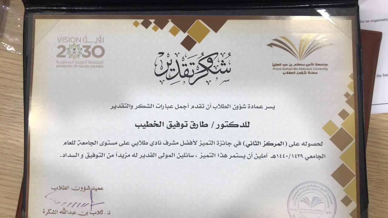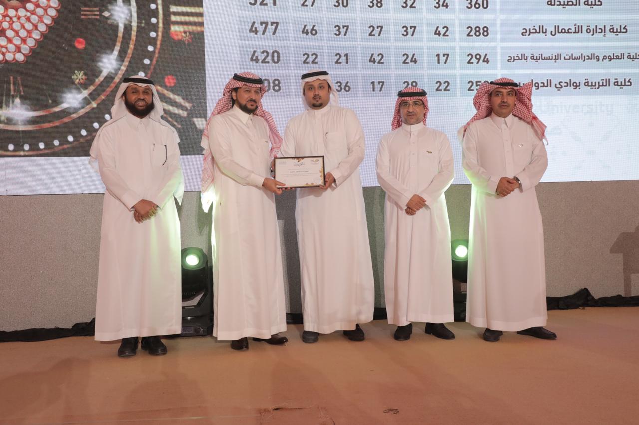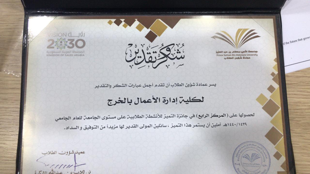 تحت رعاية معالي مدير جامعة الأمير سطام بن عبدالعزيز الأستاذ الدكتور/ عبدالعزيز بن عبدالله الحامد أقامت عمادة شؤون الطلاب الحفل الختامي للأنشطة الطلابية يوم الأحد 2/8/1440 هـ الموافق 7/ 4/2019م وقد تنوعت المراكز المتقدمة التي حصلت علها كلية إدارة الأعمال بالخرج حيث حصل مشرفها في النشاط الطلابي الدكتور/ طارق توفيق الخطيب على المركز الأول في الإشراف الطلابي على مستوى الجامعة للعام الثاني على التوالي، في حين حصلت الكلية على المرتبة الرابعة في الأنشطة الطلابية، كما حصل نادي نزاهة التابع لعمادة شؤون الطلاب بالكلية على المركز السادس على مستوى الأندية الطلابية وحصل مشرف النادي الدكتور/ طارق توفيق الخطيب على المركز الثاني على مستوى الجامعة في الإشراف على الأندية الطلابية، وقد حصل نادي عدالة التابع لعمادة شؤون الطلاب بالكلية على المرتبة الثامنة على مستوى الأندية الطلابية المتنافسة .