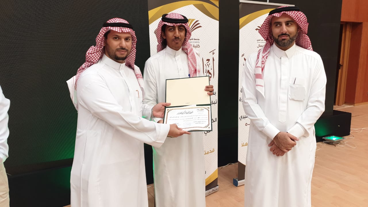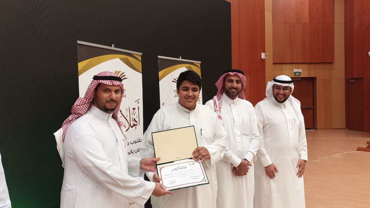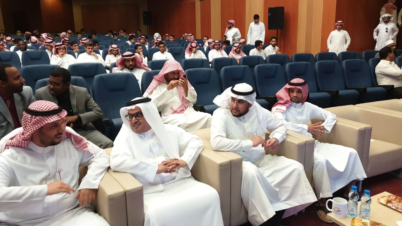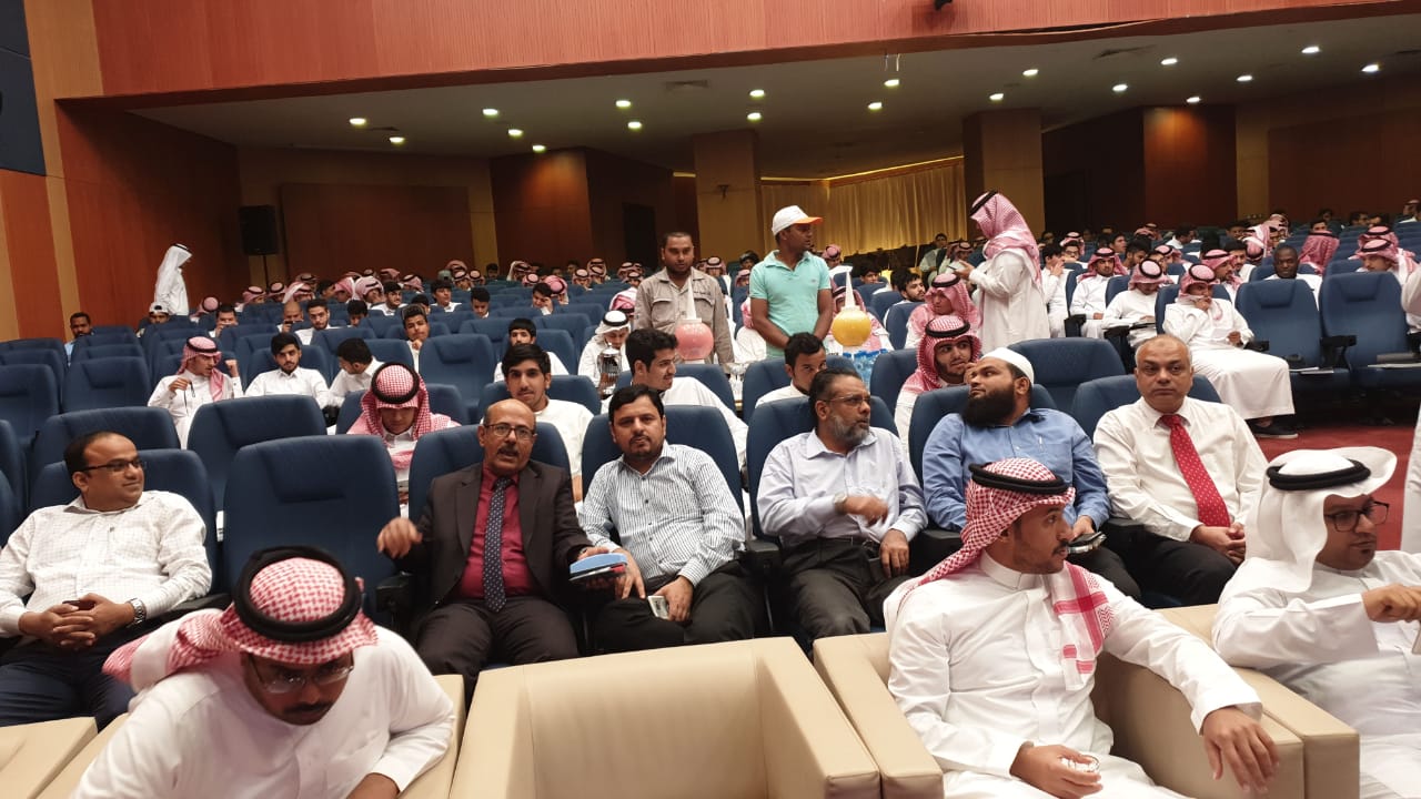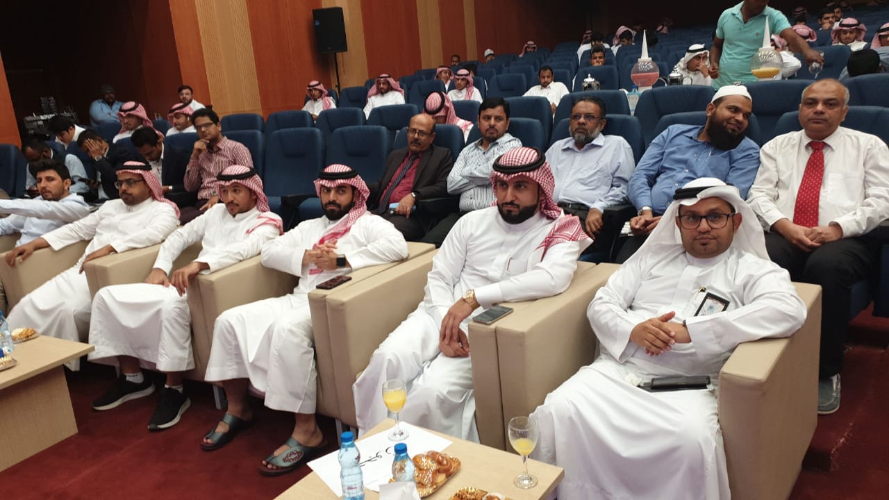 حيث بدأ الحفل بعزف النشيد الوطني وتلاوة آيات من الذكر الحكيم تلاها كلمة عميد الكلية والتي قدمها نيابة عن سعادته الدكتور فيصل الخليفي وكيل الكلية للتطوير والجودة والتي رحب فيها بالحضور وشكر عمادة شؤون الطلاب على دعمها المتواصل للكلية ثم وجه شكره للجنة الأنشطة الطلابية بالكلية على الجهد الذي تقدمه, كما وجه سعادته شكره الخاص لطلاب الكلية خاصة المشاركين منهم داعياً الجميع إلى ضرورة المشاركة والاستفادة من كل ما تقدمه العمادة من خدمات ودعم طلابي، ثم قدم طلاب الكلية مشاركاتهم في مختلف محاور المسابقة والتي لاقت قبولاً وأستحساناً من الجميع, وفي نهاية الحفل تم توزيع الجوائز على الطلاب المشاركين وتم توجيه الشكر لهم على الحضور والمشاركة.