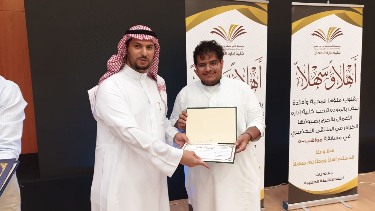 تحت رعاية سعادة عميد كلية إدارة الأعمال الدكتور / عواد الوثيري نظمت كلية إدارة الأعمال بالخرج ممثلة في لجنة الأنشطة الطلابية الملتقى التحضيري لمسابقة مواهب -5 بالتعاون والتنسيق مع عمادة شؤون الطلاب بالجامعة اليوم الاثنين 29/2/1441هـ الموافق 28/10/2019م بحضور كلاً من سعادة وكيل عمادة شؤون الطلاب للأنشطة الطلابية الدكتور لفاي بن لافي السلمي وسعادة مدير إدارة الأندية الطلابية الأستاذ راشد بن محمد العسكر ومشرفي الأندية الطلابية سعادة الأستاذ شبيب زامل السبيعي وسعادة الأستاذ محمد بن على الدوسري وسعادة مشرفي الأقسام الأكاديمية وسعادة مدير الإدارة بالكلية وأعضاء هيئة التدريس والطلاب.