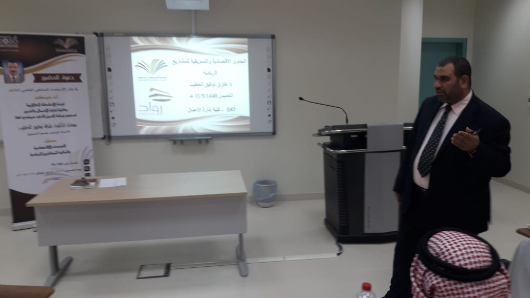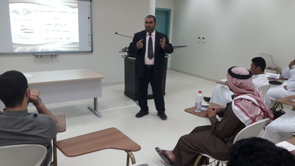 في إطار الاستعداد للملتقى العلمي الثالث الذي تنظمه عمادة شؤون الطلاب بجامعة الأمير سطام بن عبدالعزيز للعام الجامعي 1439/1440هـ, واستمرارا لفعاليات الكلية التي تهدف إلى رفع الجانب التوعوي العلمي والعملي لدى الطلاب وتحفيزهم على المشاركة والتفاعل فقد نظمت لجنة الأنشطة الطلابية يوم الخميس بتاريخ 11/5/1440هـ الموافق 17/1/2019م ورشة عمل بعنوان (الجدوى الاقتصادية والتسويقية للمشاريع الريادية) قدمها الدكتور / طارق توفيق الخطيب المشرف على الأنشطة الطلابية ومنسق الكلية في الملتقى العلمي الثالث، وقد تناولت الورشة عرضاً لمفهوم المشروع الريادي ومكوناته الرئيسة، كما استعرض سعادته معايير الجدوى الاقتصادية والتسويقية وكيفية تطبيقها ودلالات تقديراتها، كما استعرض أيضاً أهمية دراسات الجدوى والمراحل المختلفة التي تمر بها. وفي نهاية الورشة أجاب الدكتور الخطيب على تساؤلات واستفسارات الطلاب المشاركين ودعاهم إلى مزيد من التفاعل والمشاركة في الندوات وورش العمل القادمة.