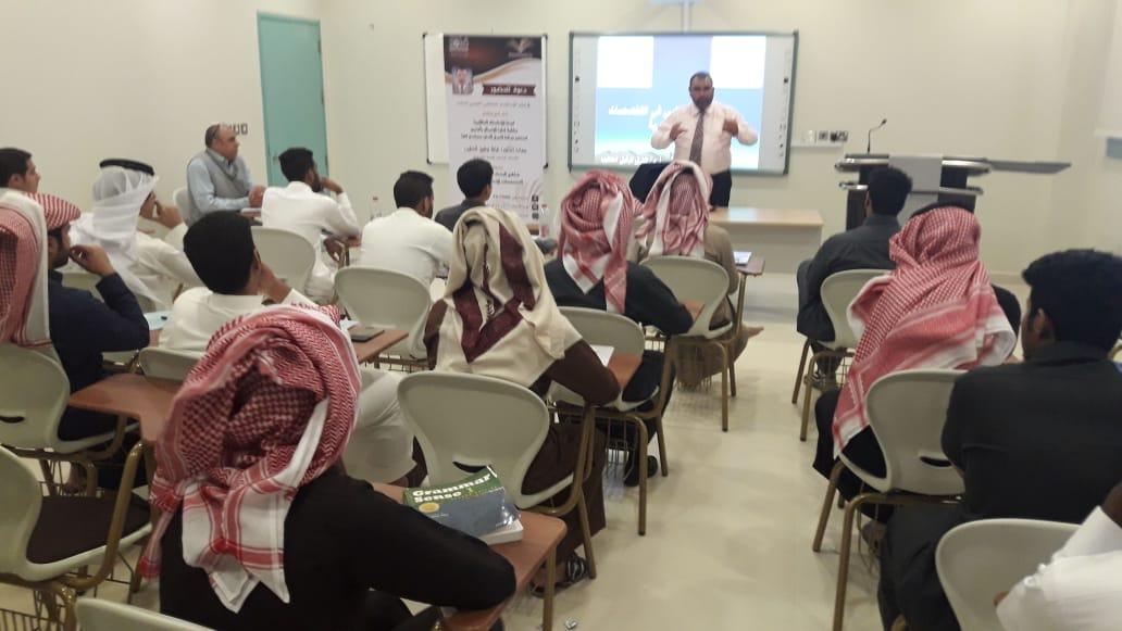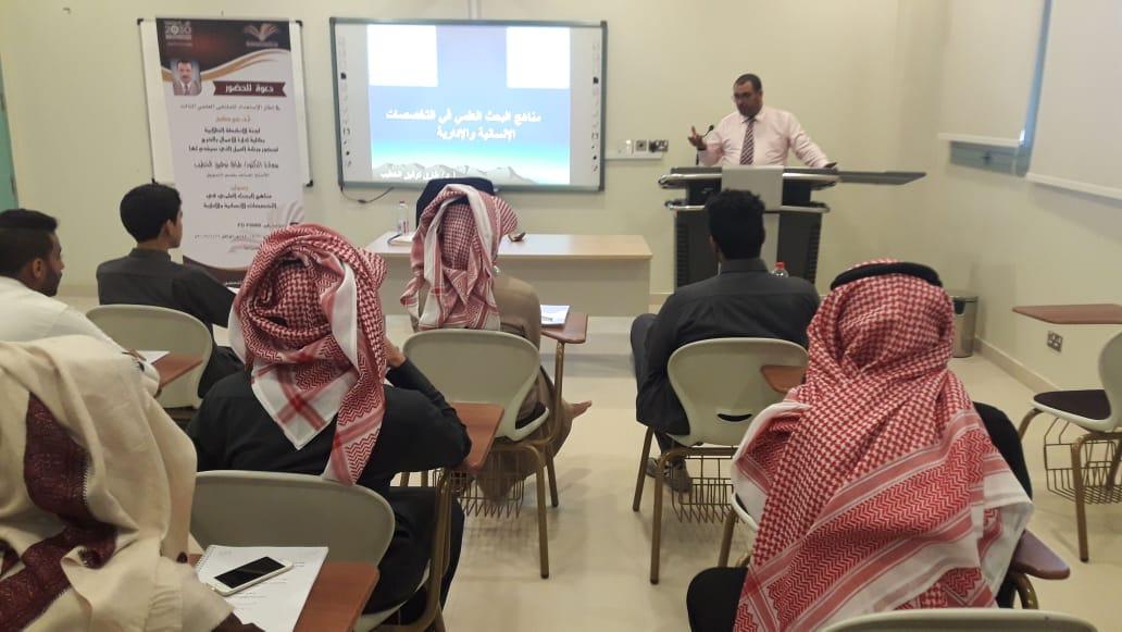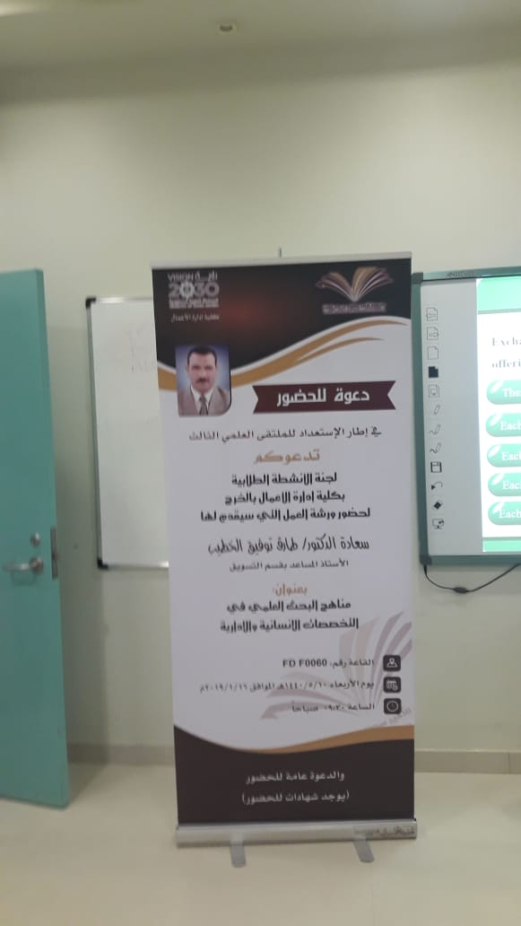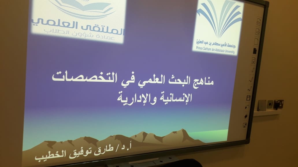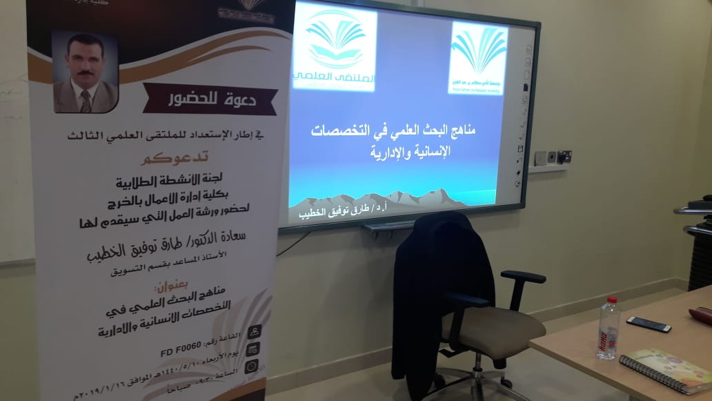 في إطار الاستعداد للملتقى العلمي الثالث الذي تنظمه عمادة شؤون الطلاب بجامعة الأمير سطام بن عبدالعزيز للعام الجامعي 1439/1440هـ، انطلقت ثاني فعاليات الملتقى بكلية إدارة الأعمال بالخرج, حيث نظمت لجنة الأنشطة الطلابية الأربعاء 10/5/1440هـ الموافق 16/1/2019م ورشة عمل بعنوان (مناهج البحث العلمي في التخصصات الإنسانية والإدارية)، قدمها سعادة الدكتور طارق توفيق الخطيب المشرف على النشاط الطلابي ومنسق الكلية في الملتقى العلمي الثالث، وقد تناولت الورشة عرضاً لمفهوم المنهجية وأهميتها في البحث العلمي, ثم استعرض الدكتور الخطيب المناهج البحثية المختلفة التي يعتمد عليها الباحثون مع التركيز على المناهج البحثية في التخصصات الإنسانية والإدارية.