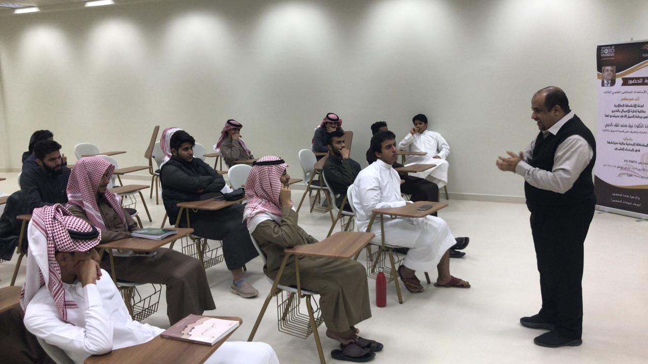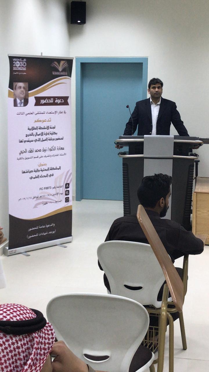 في إطار الاستعداد للملتقى العلمي الثالث الذي تنظمه عمادة شؤون الطلاب بجامعة الأمير سطام بن عبدالعزيز للعام الجامعي 1439/1440 هـ انطلقت أولى فعاليات الملتقي بكلية إدارة الأعمال حيث نظمت لجنة الأنشطة الطلابية الاثنين 8/5/1440 هـ الموافق 14/1/2019 م ورشة عمل بعنوان (المشكلة البحثية وآلية صياغتها )، قدمها سعادة الدكتور نبيل محمد الحزمي الأستاذ المشارك بكلية إدارة الأعمال والمشرف على قسم التسويق بالكلية، وقد تناولت الورشة عرضاً لمفهوم المشكلة البحثية، وأهميتها للبحث العلمي وآلية صياغتها وكيفية الربط بينها وبين الأهداف الرئيسية للبحث. وفي نهاية الورشة قدم الدكتور طارق الخطيب رئيس لجنة الأنشطة الطلابية ومنسق الكلية في الملتقى العلمي الثالث شكره للدكتور الحزمي على تلبيته للدعوة وتفاعله مع الطلاب.