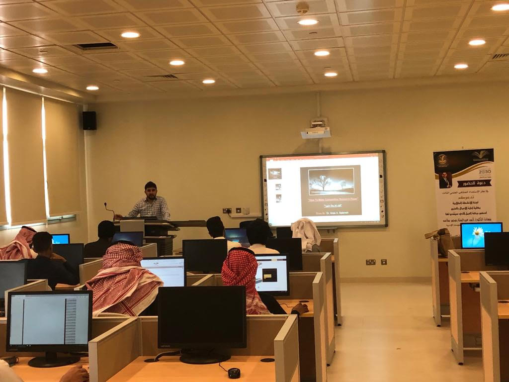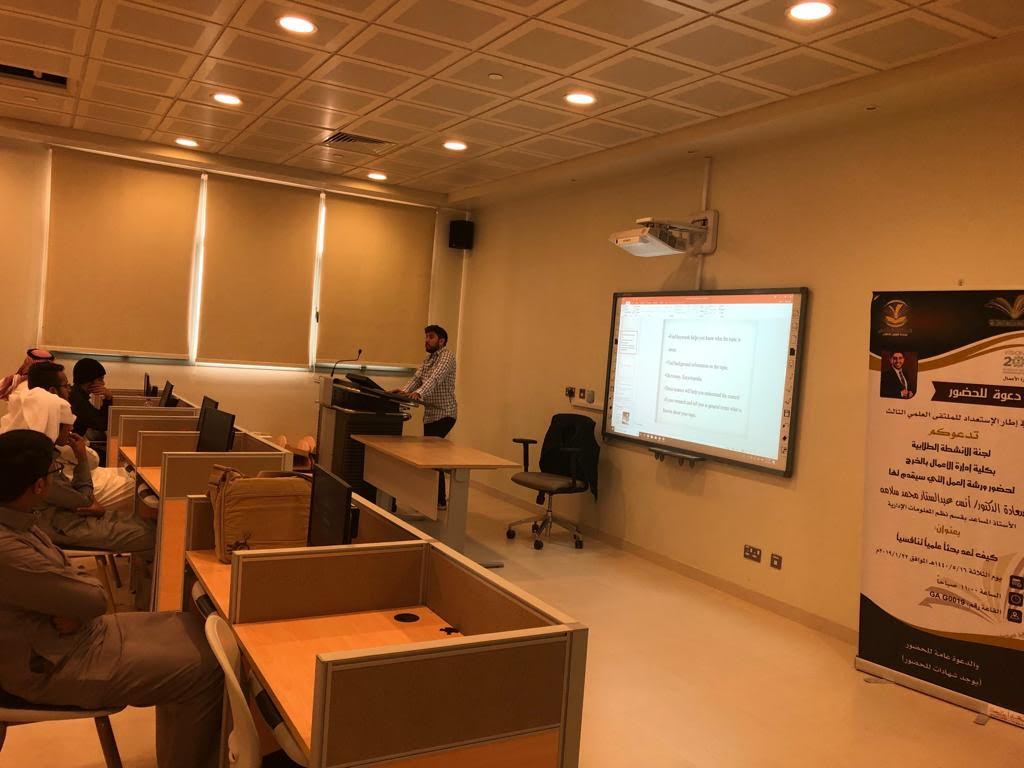 في إطار الاستعداد للملتقى العلمي الثالث الذي تنظمه عمادة شؤون الطلاب بجامعة الأمير سطام بن عبدالعزيز للعام الجامعي 1439/1440 هـ، استمرت فعاليات الملتقى بكلية إدارة الأعمال بالخرج حيث نظمت لجنة الأنشطة الطلابية بتاريخ الثلاثاء 16/5/1440هـ الموافق 22/1/2019م ورشة عمل في محور البحث العلمي تحت عنوان "كيف تعد بحثاً علمياً تنافسياً"، قدمها سعادة الدكتور/ أنس عبدالستار سلامة الأستاذ المساعد في قسم نظم المعلومات الإدارية، وقد تناولت الورشة عدداً من المحاور الرئيسة منها التعريف بالبحث العلمي وأهميته ومراحله المختلفة ومكوناته الرئيسية, وركزت الورشة على الشروط والضوابط التي يجب توافرها في كل مكون من مكونات البحث العلمي بما يجعل في النهاية منه بحثاً تنافسياً ريادياً.