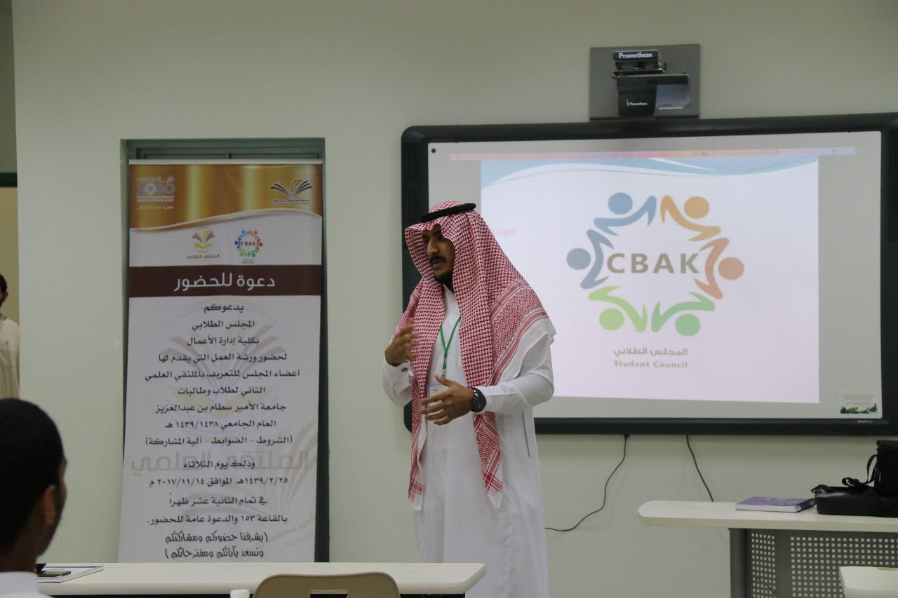نظمت لجنة الأنشطة الطلابية بكلية إدارة الأعمال بالخرج اللقاء التعريفي الأول بالملتقى العلمي الثاني الذي تنظمه الجامعة خلال العام الجامعي الحالي 1438هـ / 1439هت وذلك يوم الثلاثاء 25 / 2 / 1439هـ لموافق 14 / 11 / 2017م، حيث أدار اللقاء أعضاء المجلس الاستشاري الطلابي بالكلية وفي البداية تحدث الطالب / عبدالرحمن محمد المغيرة رئيس المجلس للتعريف بالمجلس الطلابي ودوره الفعال في التواصل مع إدارة الكلية لنقل مشكلات الطلاب التي قد تواجههم في مسارهم العلمي والتعليمي، ثم تناول الطالب سعد التويجري الحديث حول الملتقى من حيث الأهداف والشروط وآلية التسجيل.